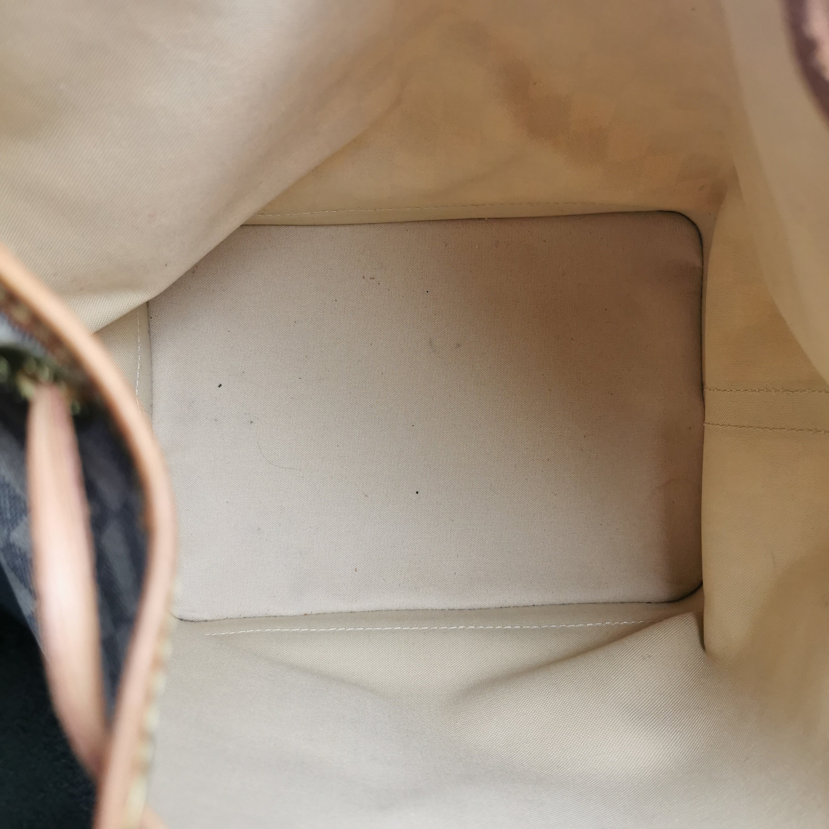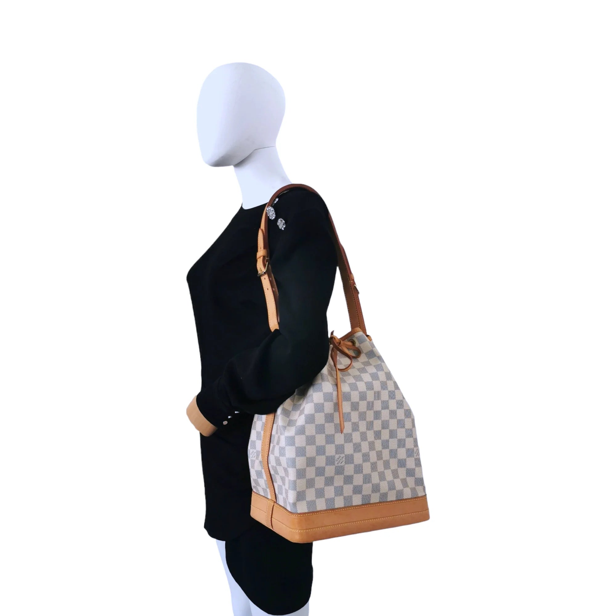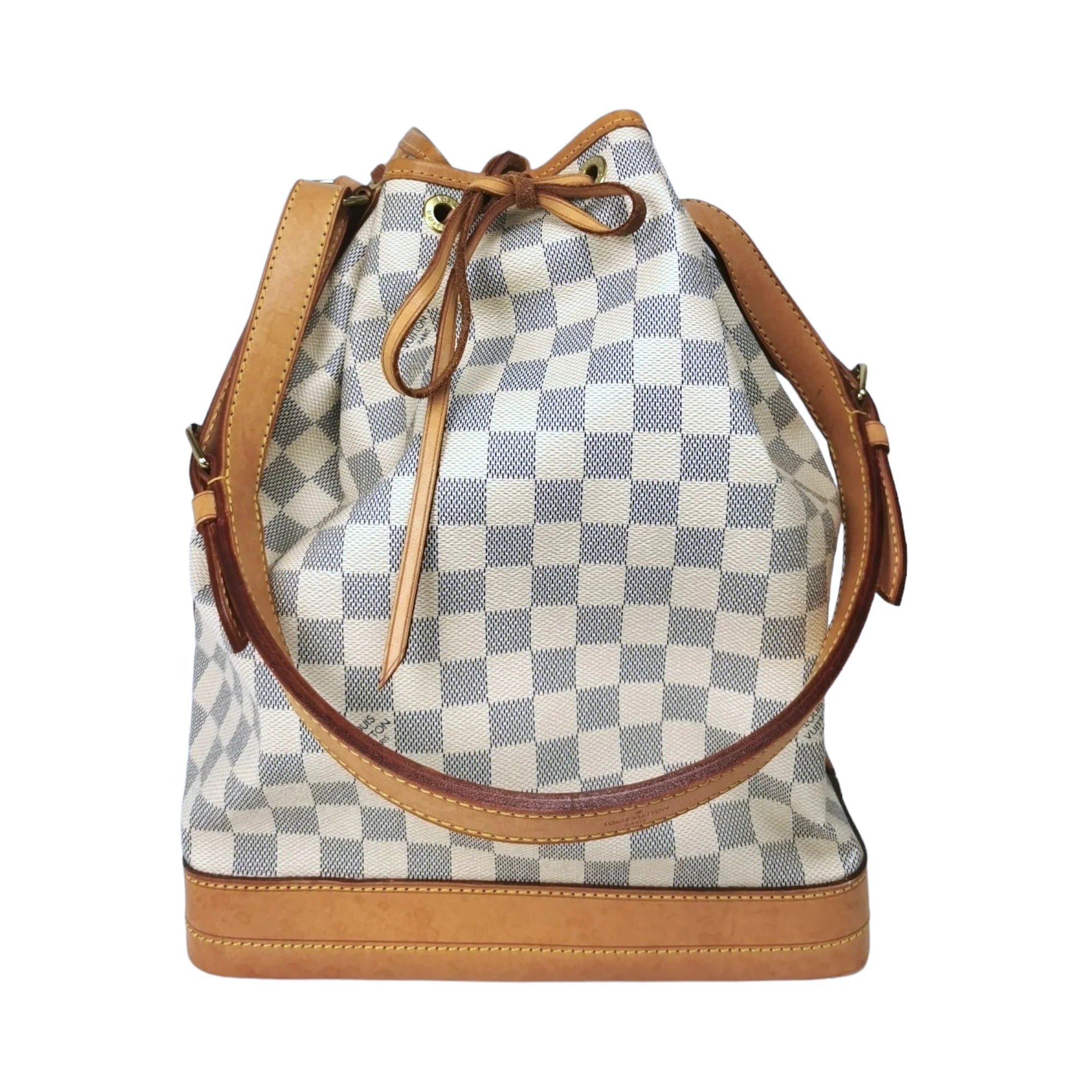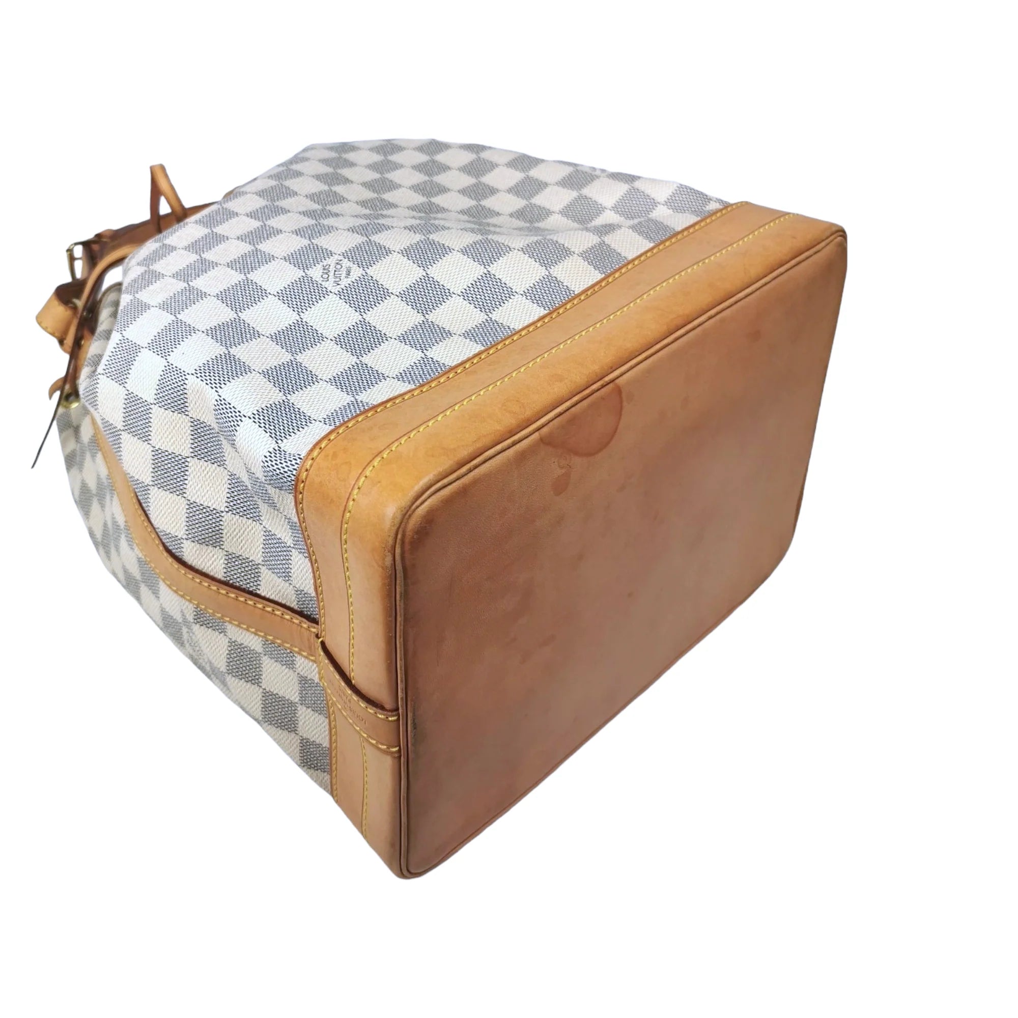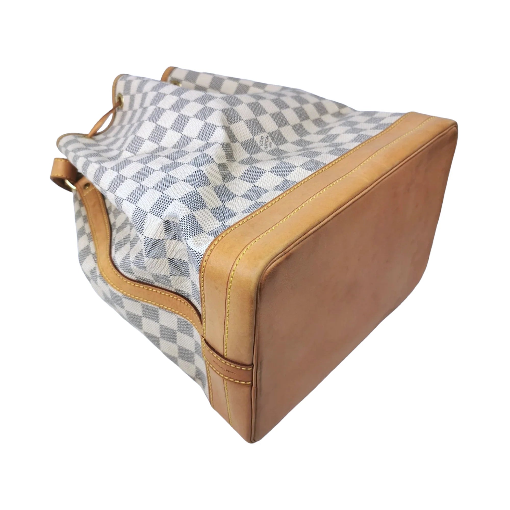 In 1932, a champagne producer asked Gaston-LV for an elegant and practical way to carry five bottles of champagne. This resulted in the LV Noé, which has become an absolute classic of the LV fashion house. This LV Grand Noé is made of white Damier Azur Canvas and has gold details.