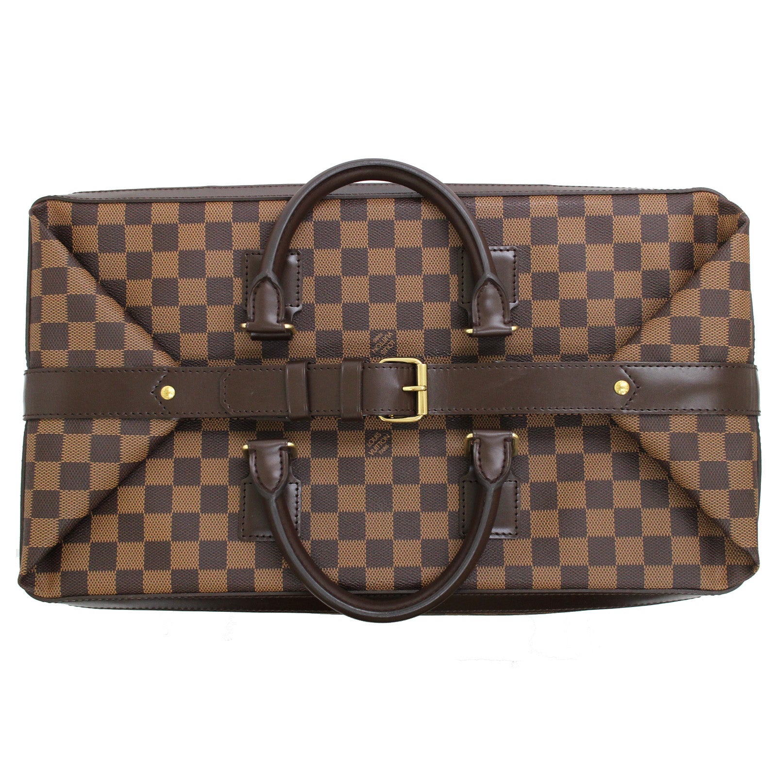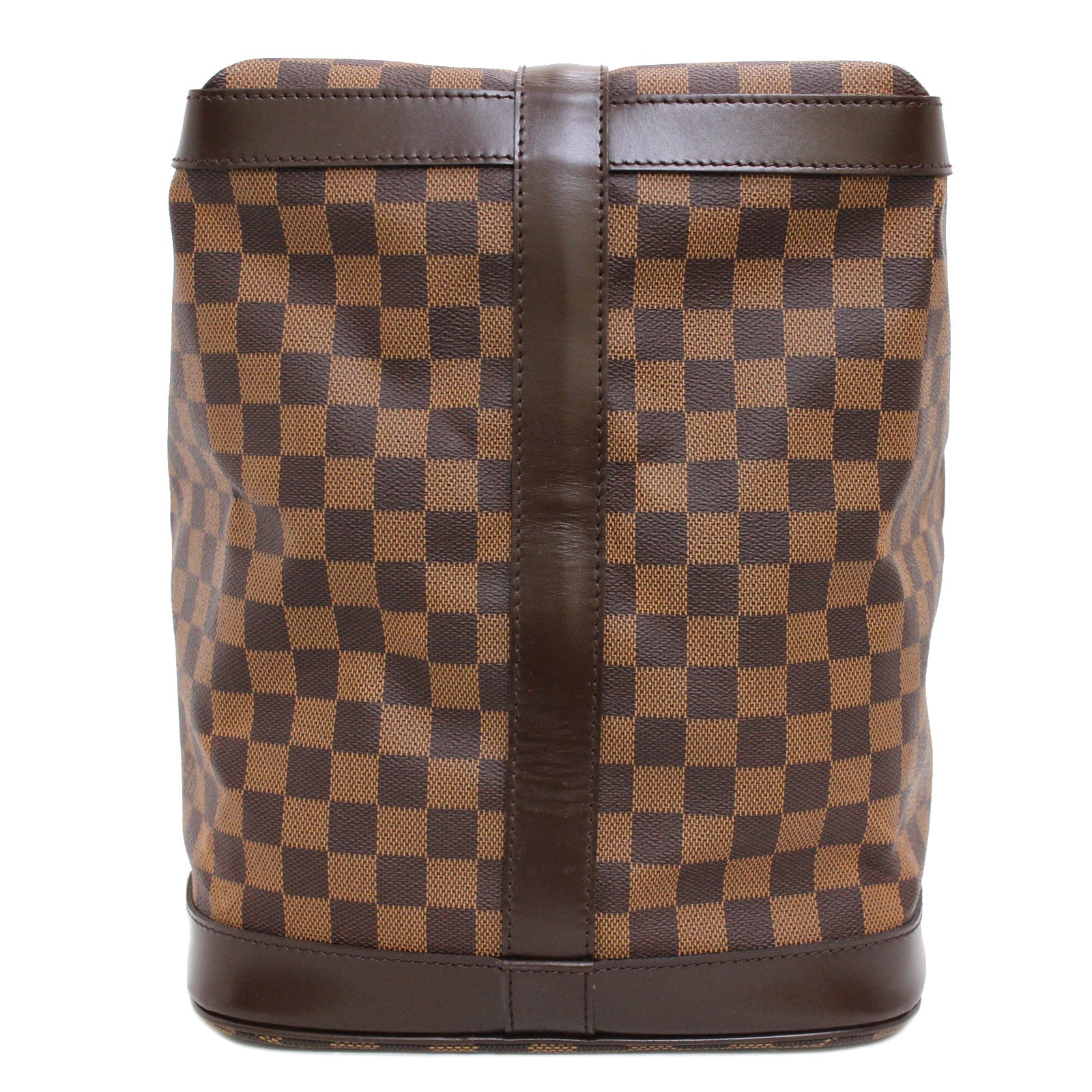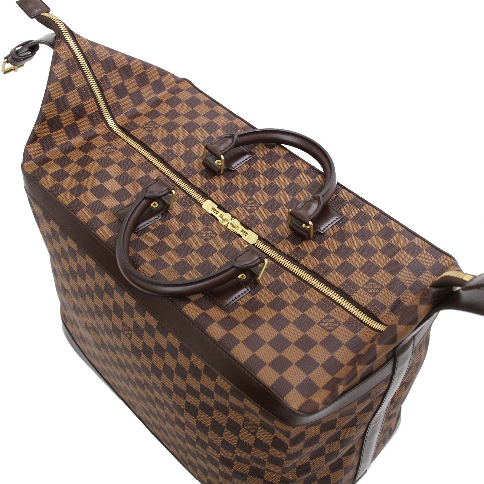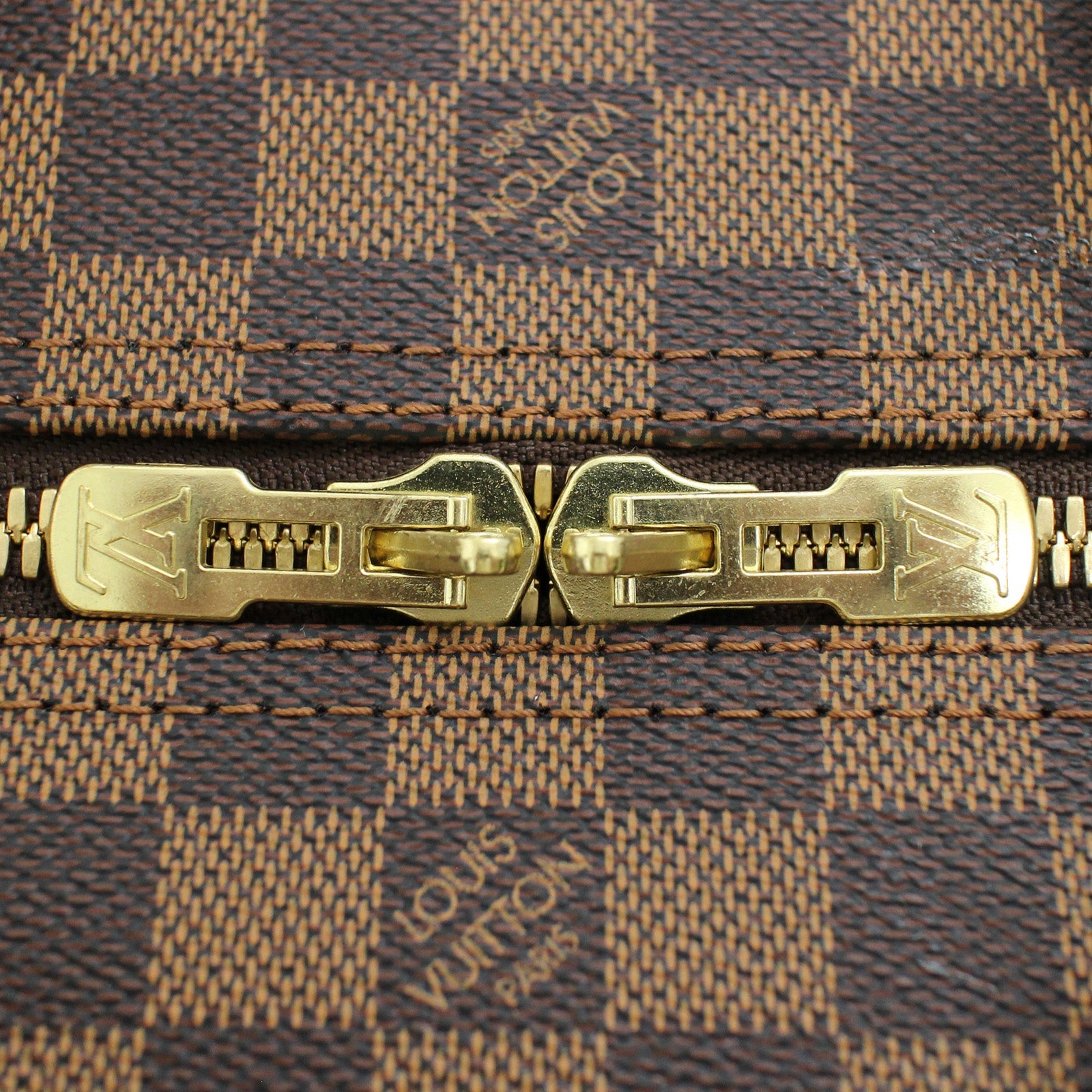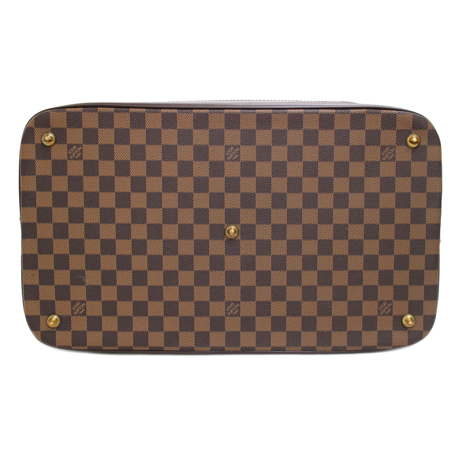 Diese schöne LV Grimaud 45 wurde aus Damier Ebene Canvas gefertigt und besitzt Besätze und gerollte Henkel aus braunem Leder, goldene Details und einen doppelten Reissverschluss. Die geräumige Tasche wird in der Hand getragen und kann mit einem Riemen zusätzlich an der oberen Öffnung gesichert werden. Die Tasche eignet sich hervorragend für einen kleinen Ausflug.