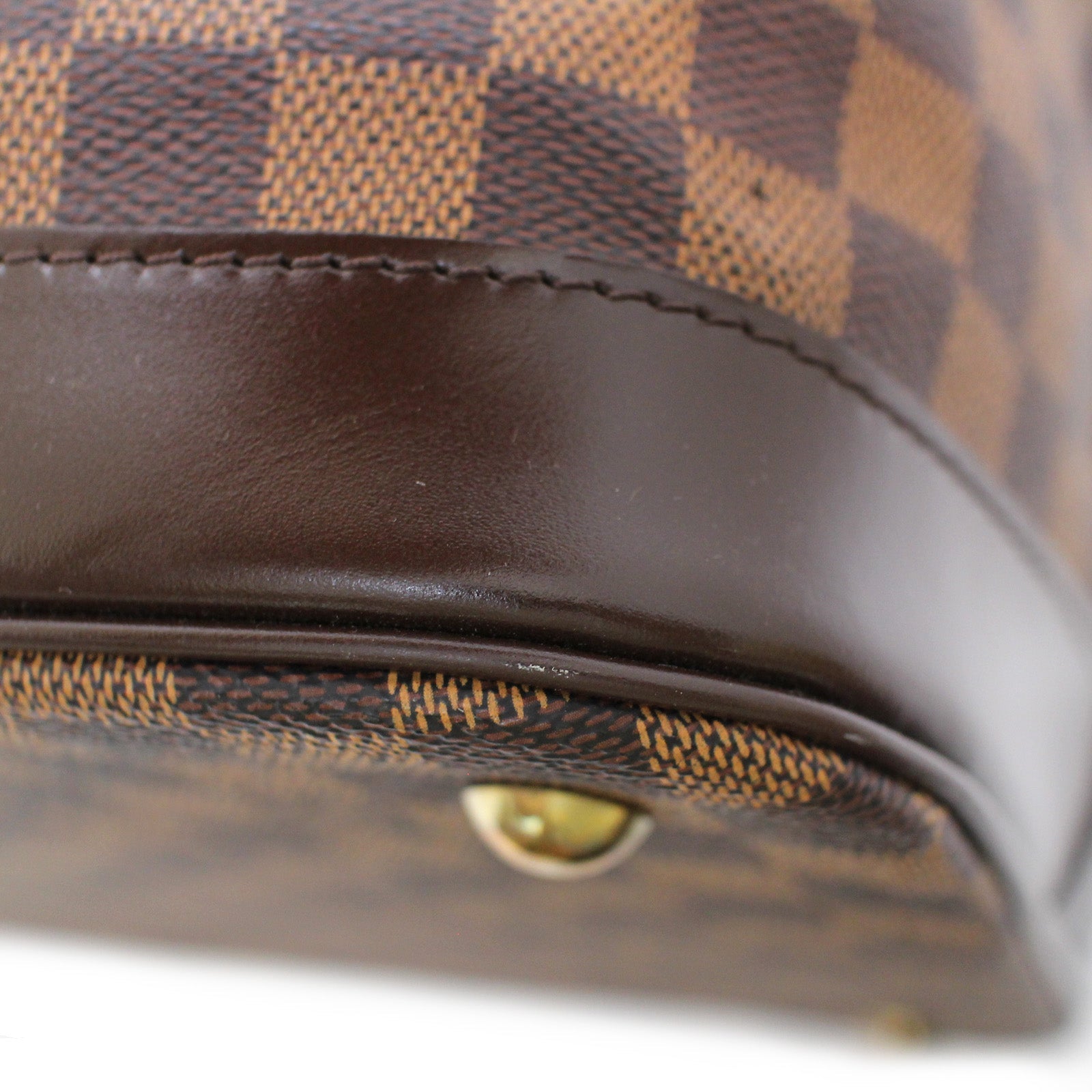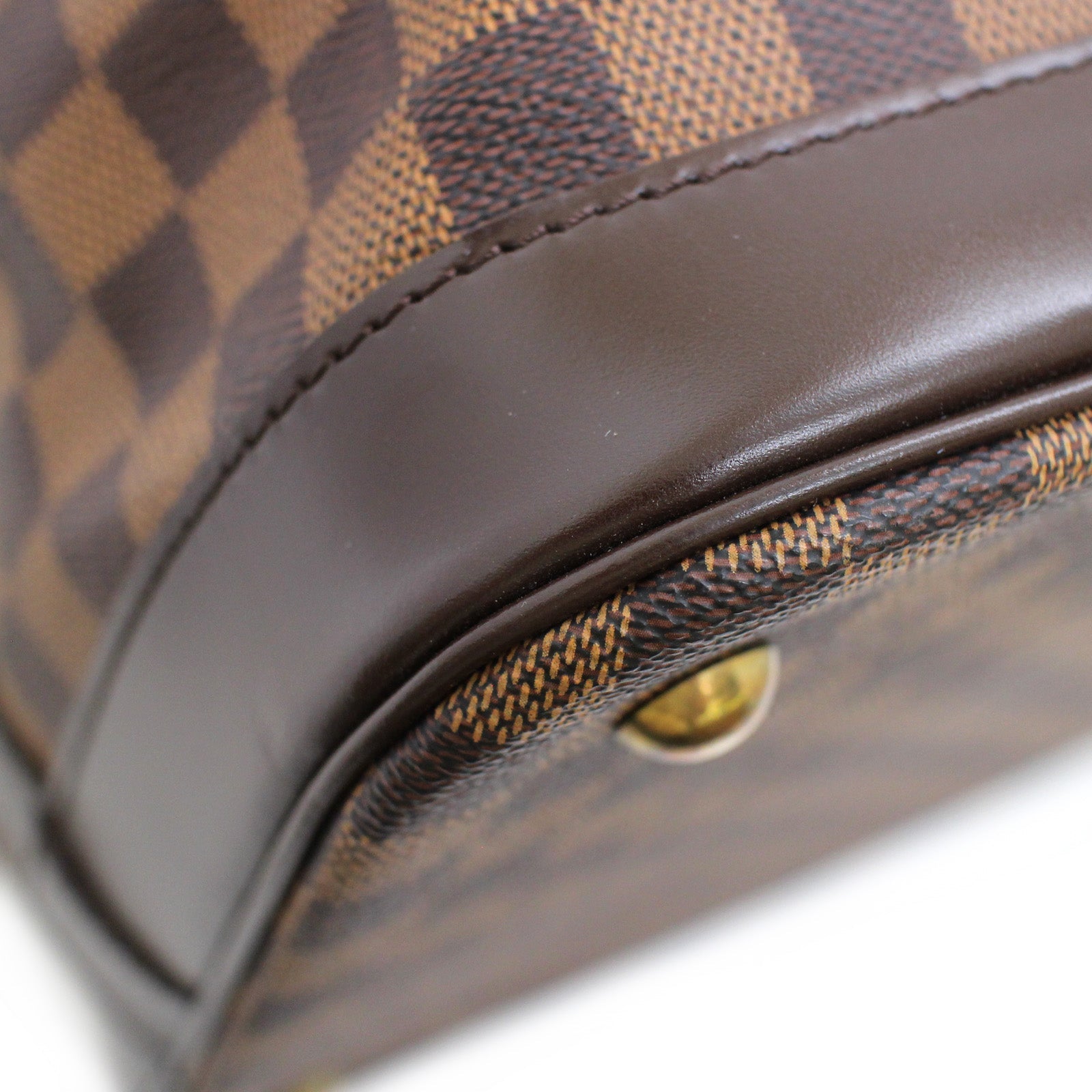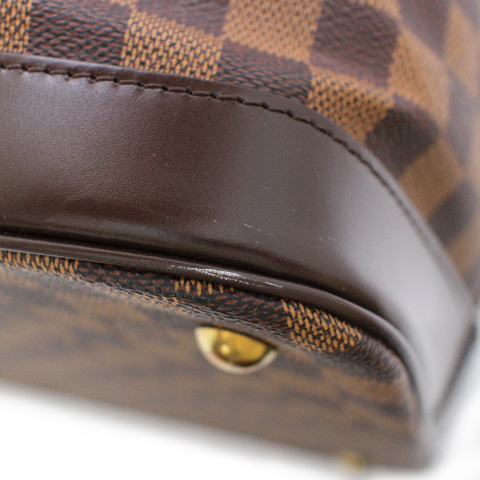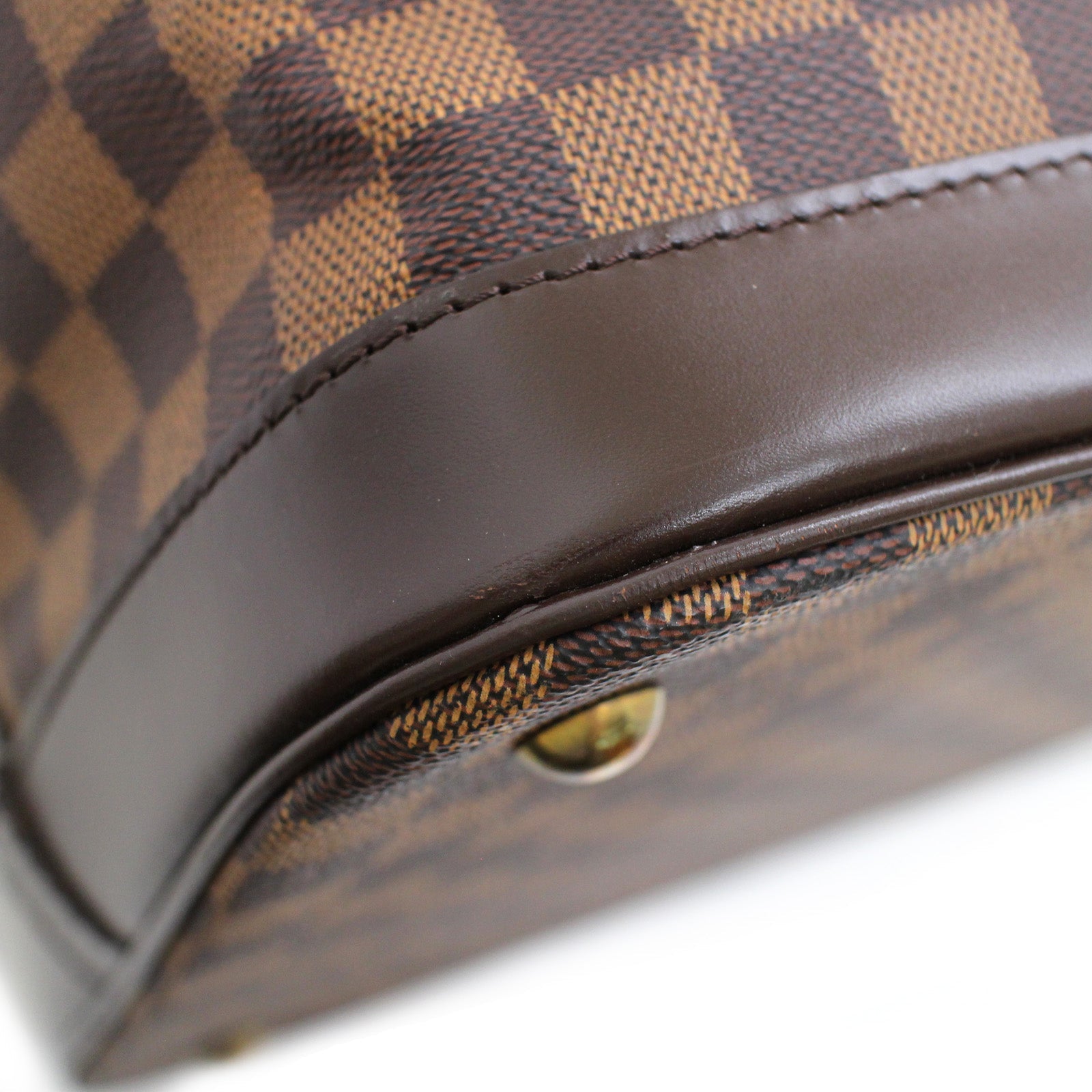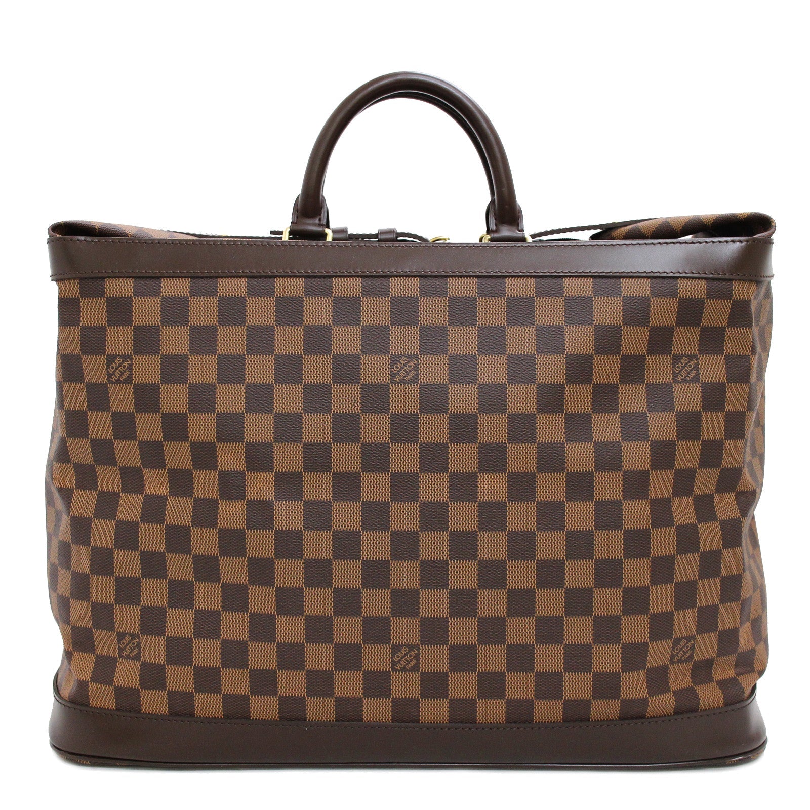 Diese schöne LV Grimaud 45 wurde aus Damier Ebene Canvas gefertigt und besitzt Besätze und gerollte Henkel aus braunem Leder, goldene Details und einen doppelten Reissverschluss. Die geräumige Tasche wird in der Hand getragen und kann mit einem Riemen zusätzlich an der oberen Öffnung gesichert werden. Die Tasche eignet sich hervorragend für einen kleinen Ausflug.