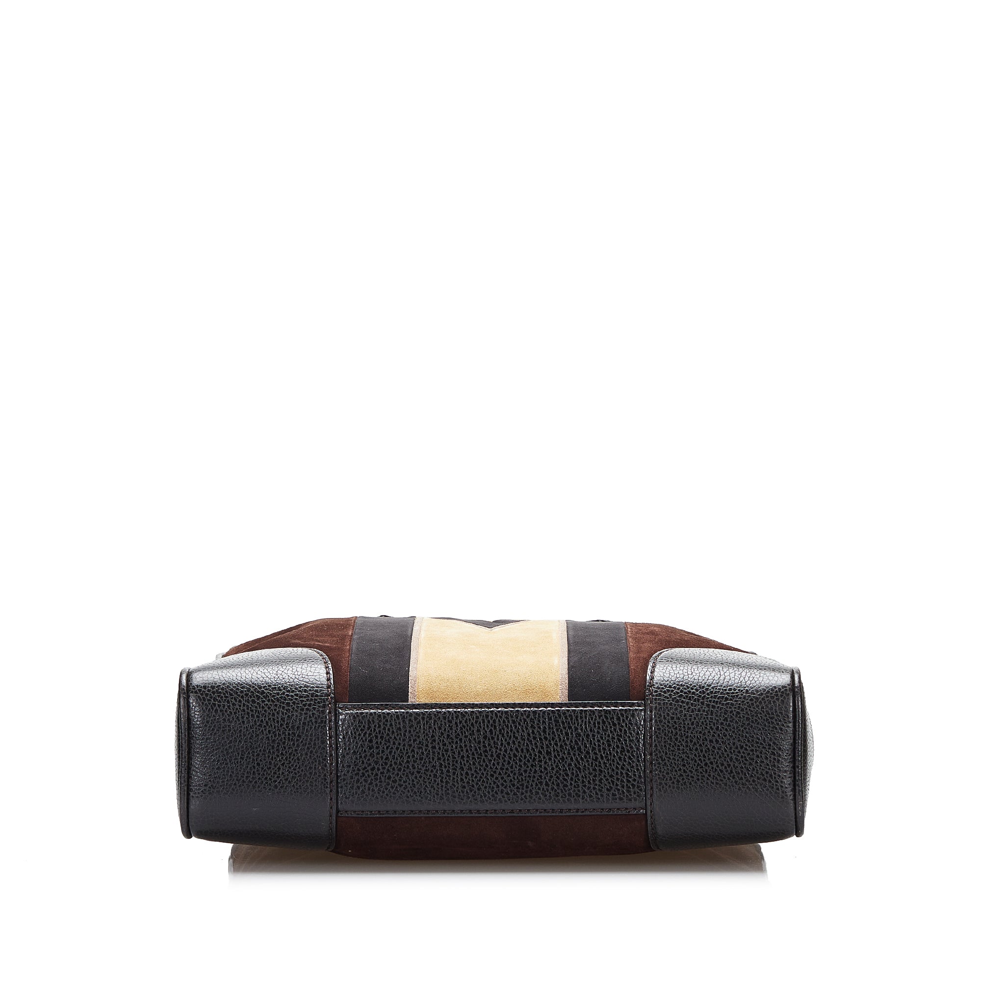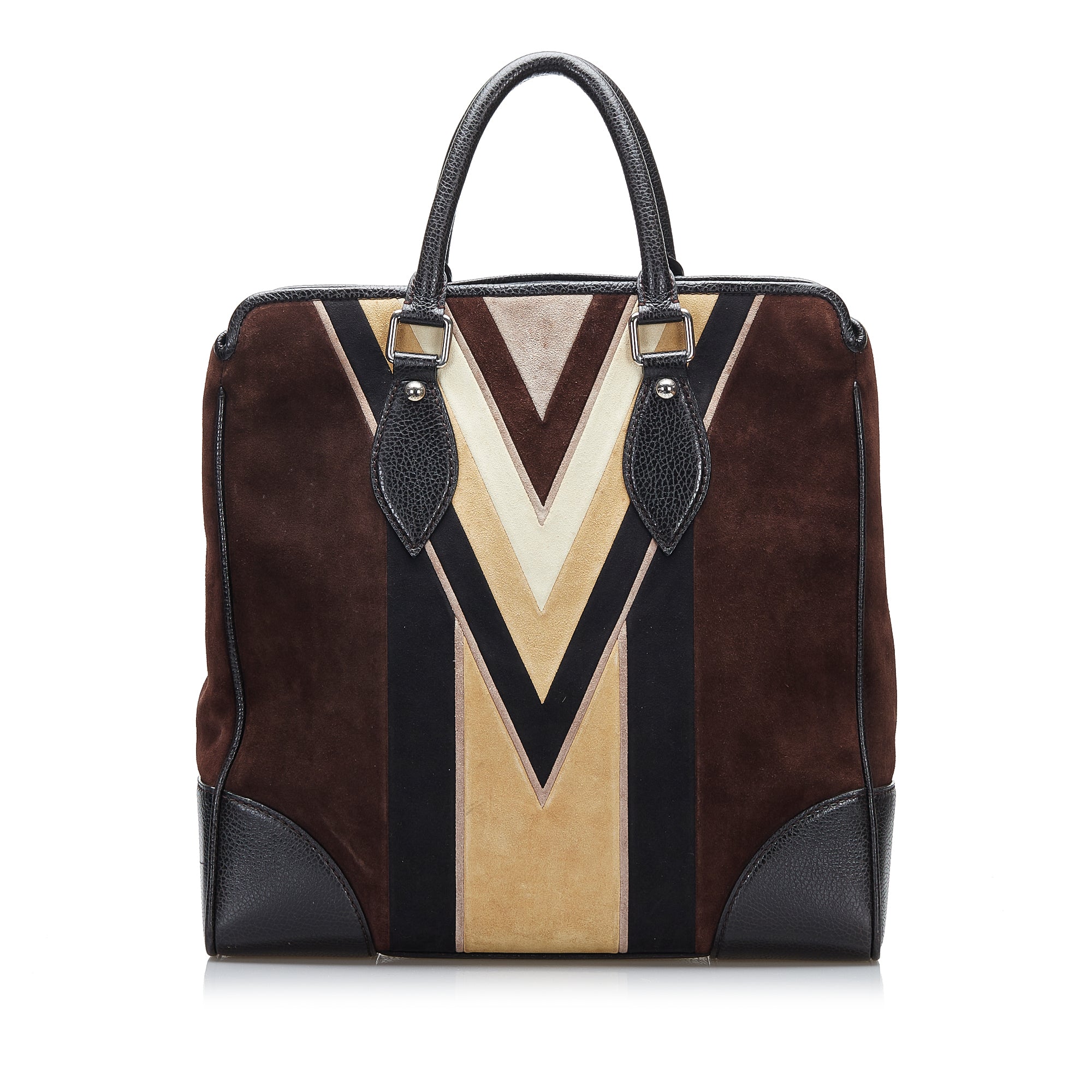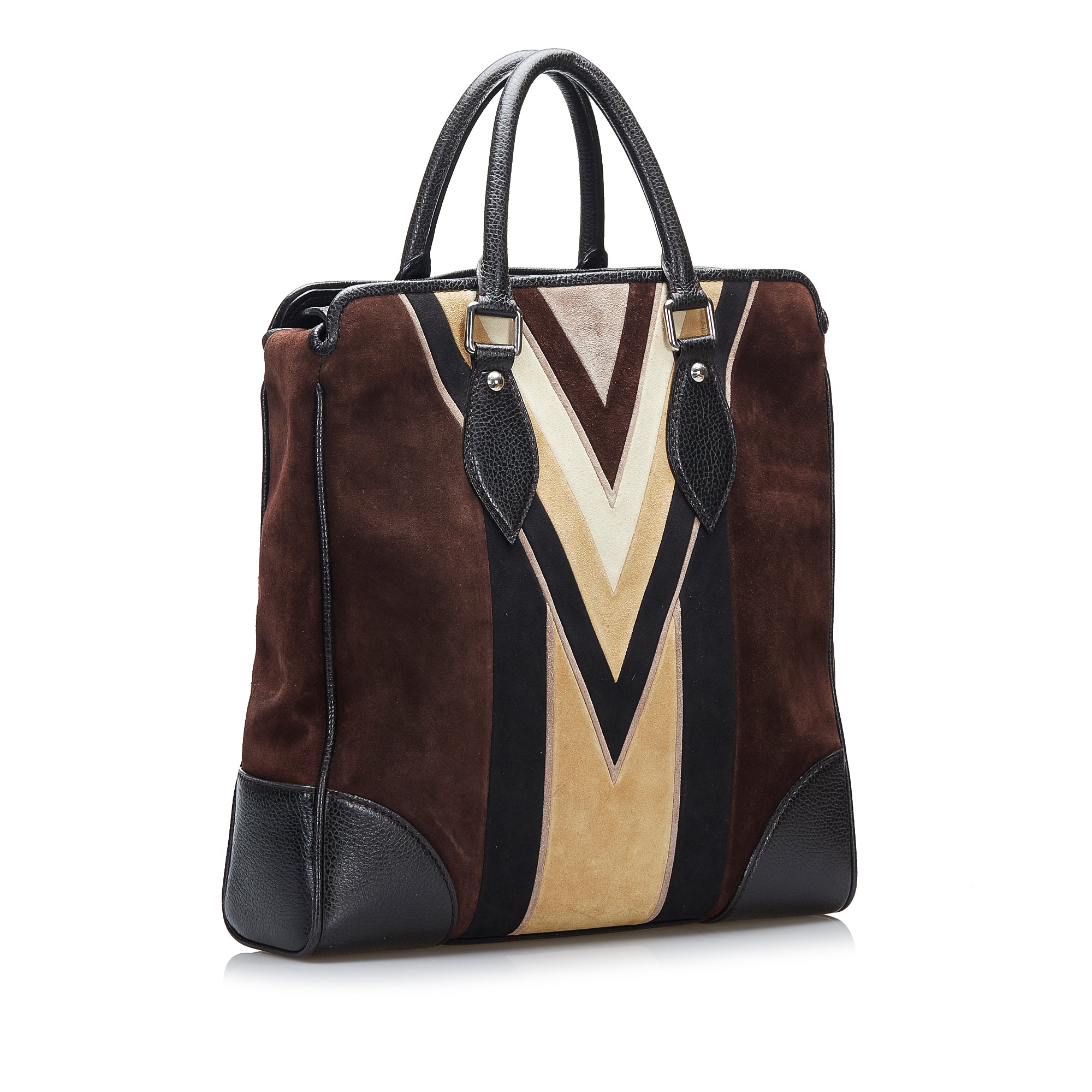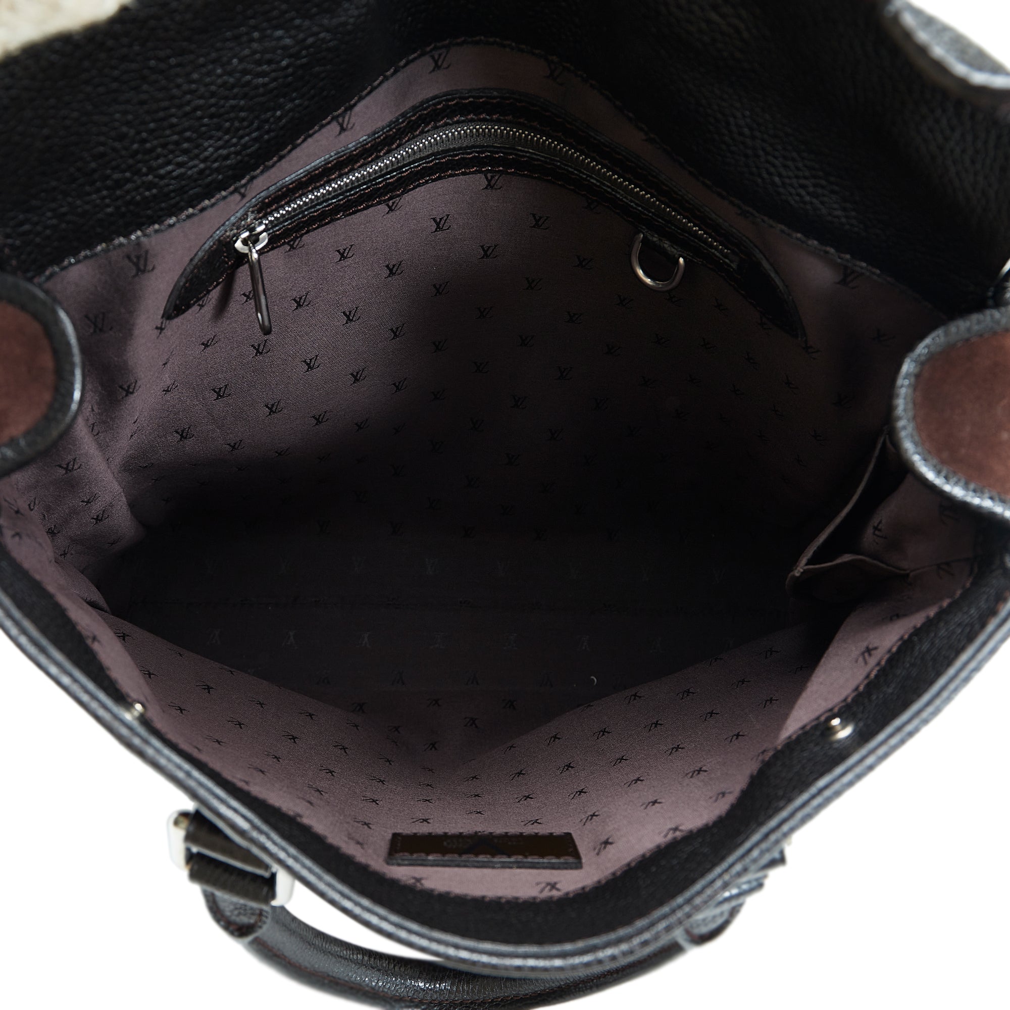 This exceptional LV Innsbruck Cabas is crafted from dark brown suede and features trim and rolled handles in multicolored leather and suede, silver rings and clasps, an open top with a snap closure, and zippered and slip pockets inside. The Bag is best carried by hand.