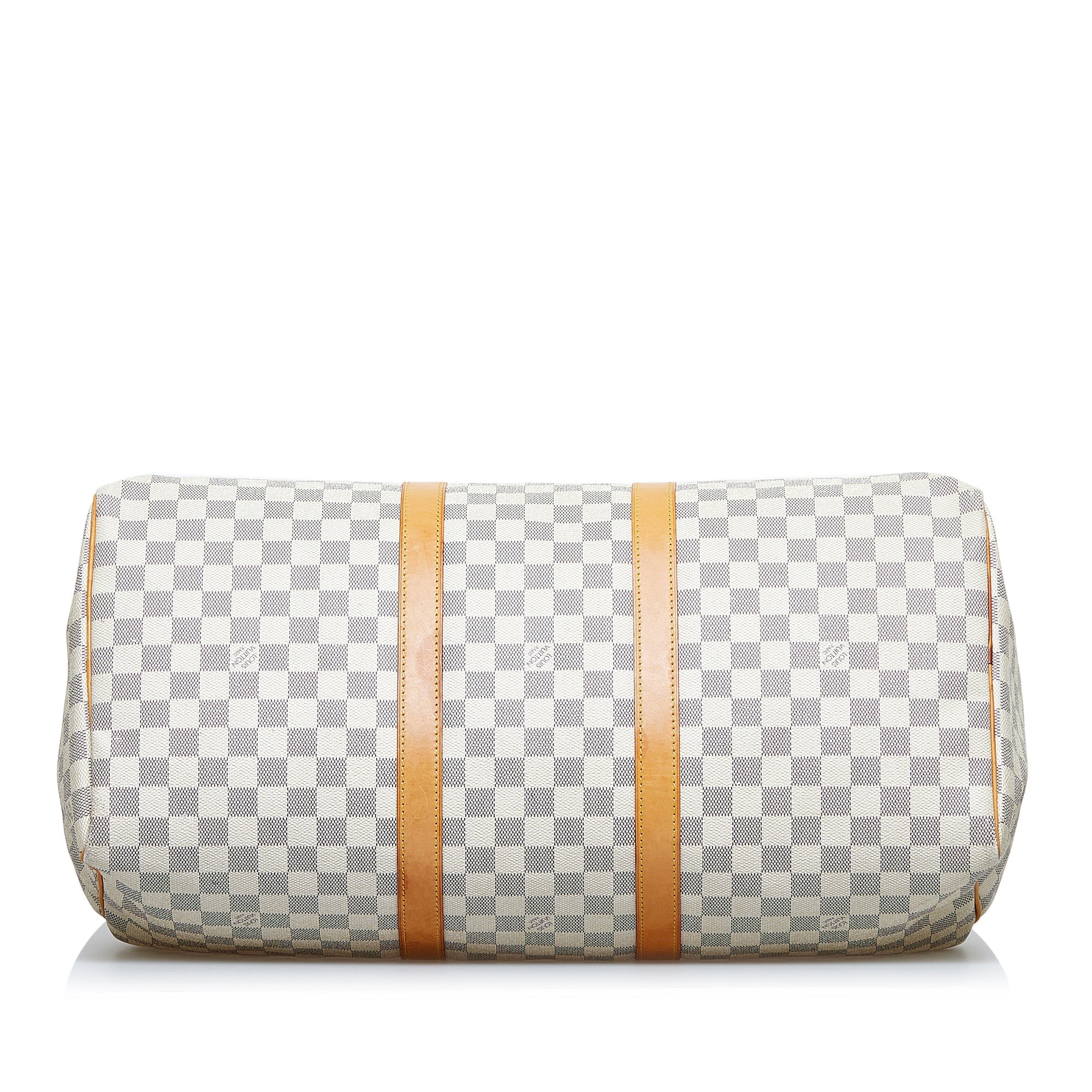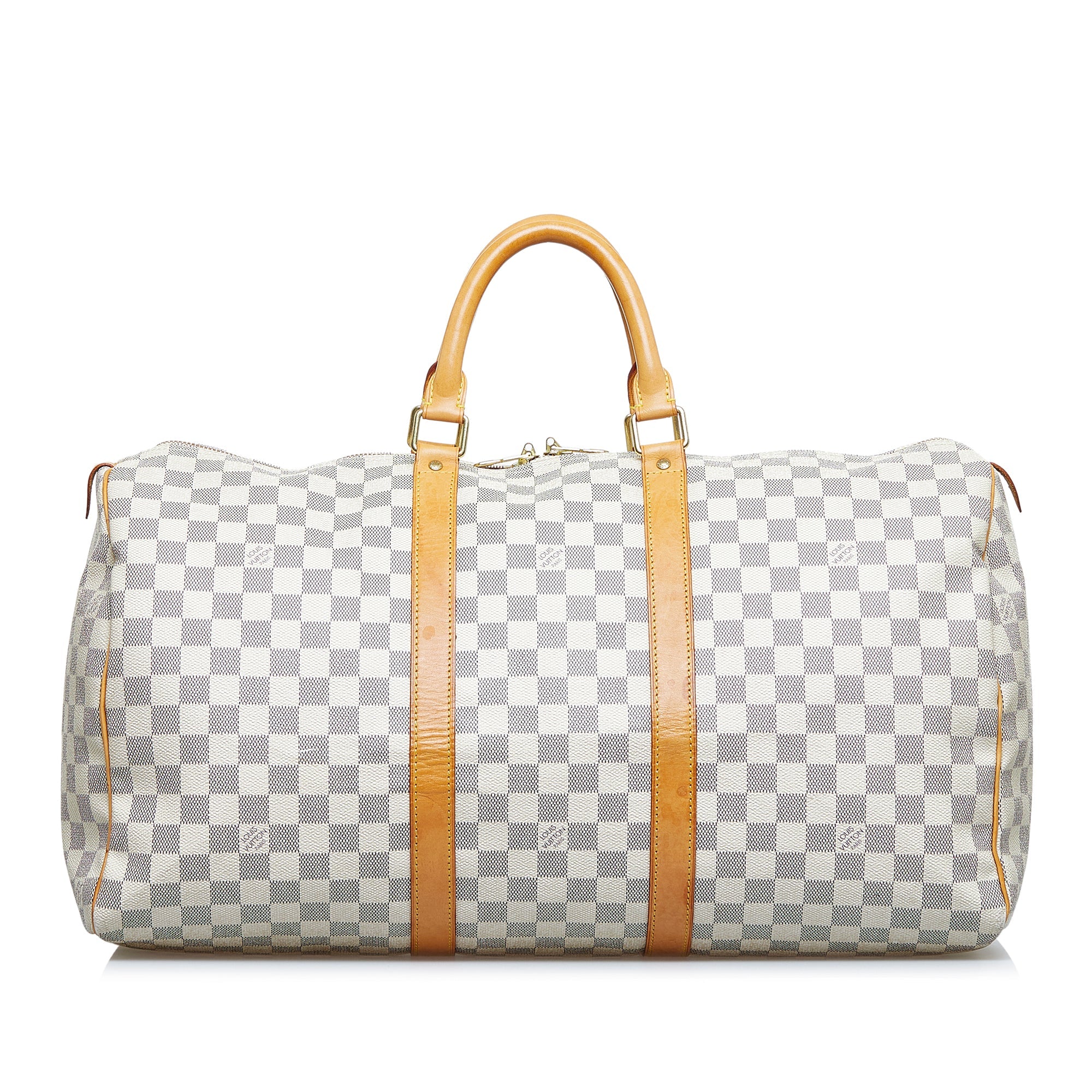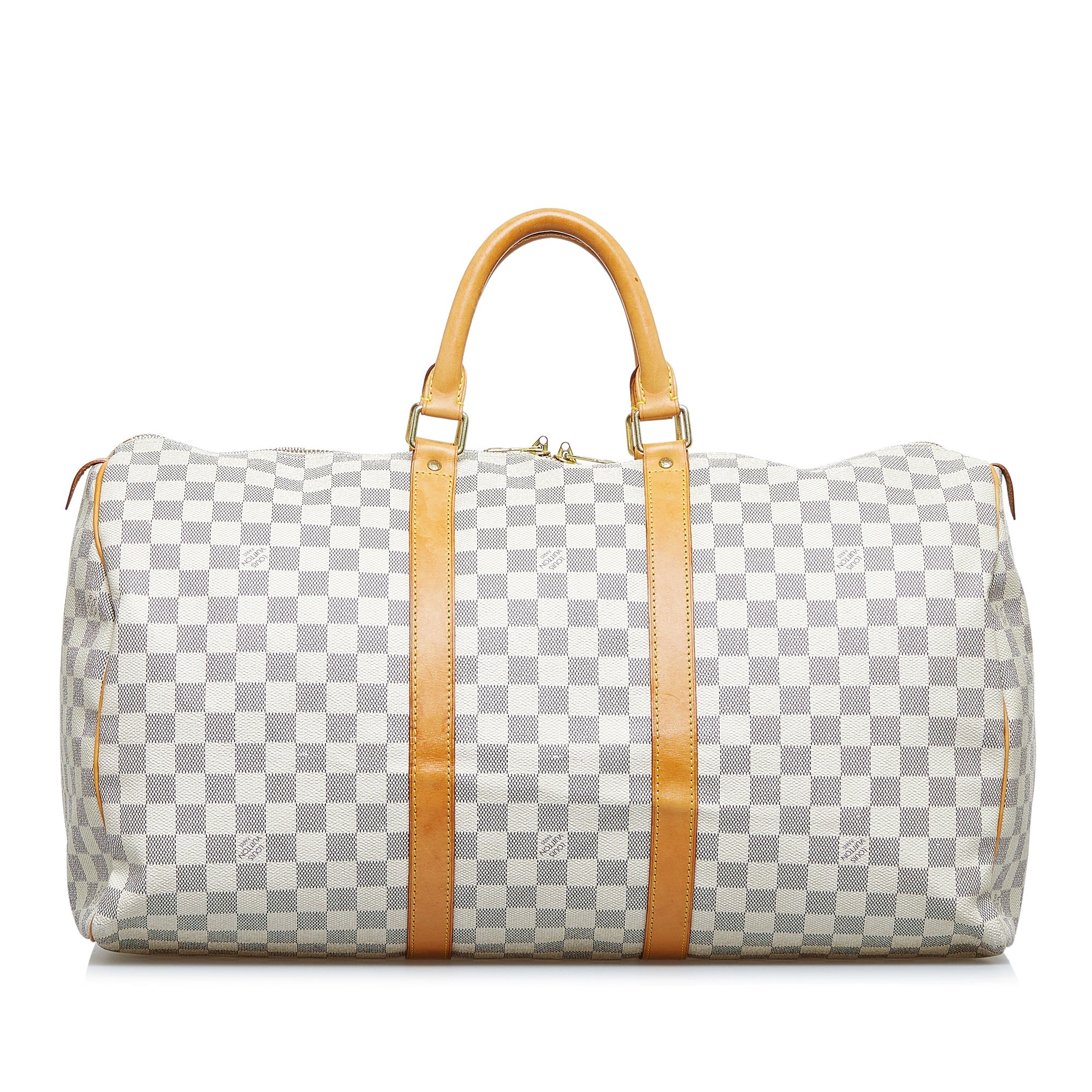 The LV Keepall 50 is a true classic from the LV travel bag collection. It is made of the popular checkerboard Damier Azur Canvas and features a double gold-tone brass zipper. A great companion for a weekend trip.