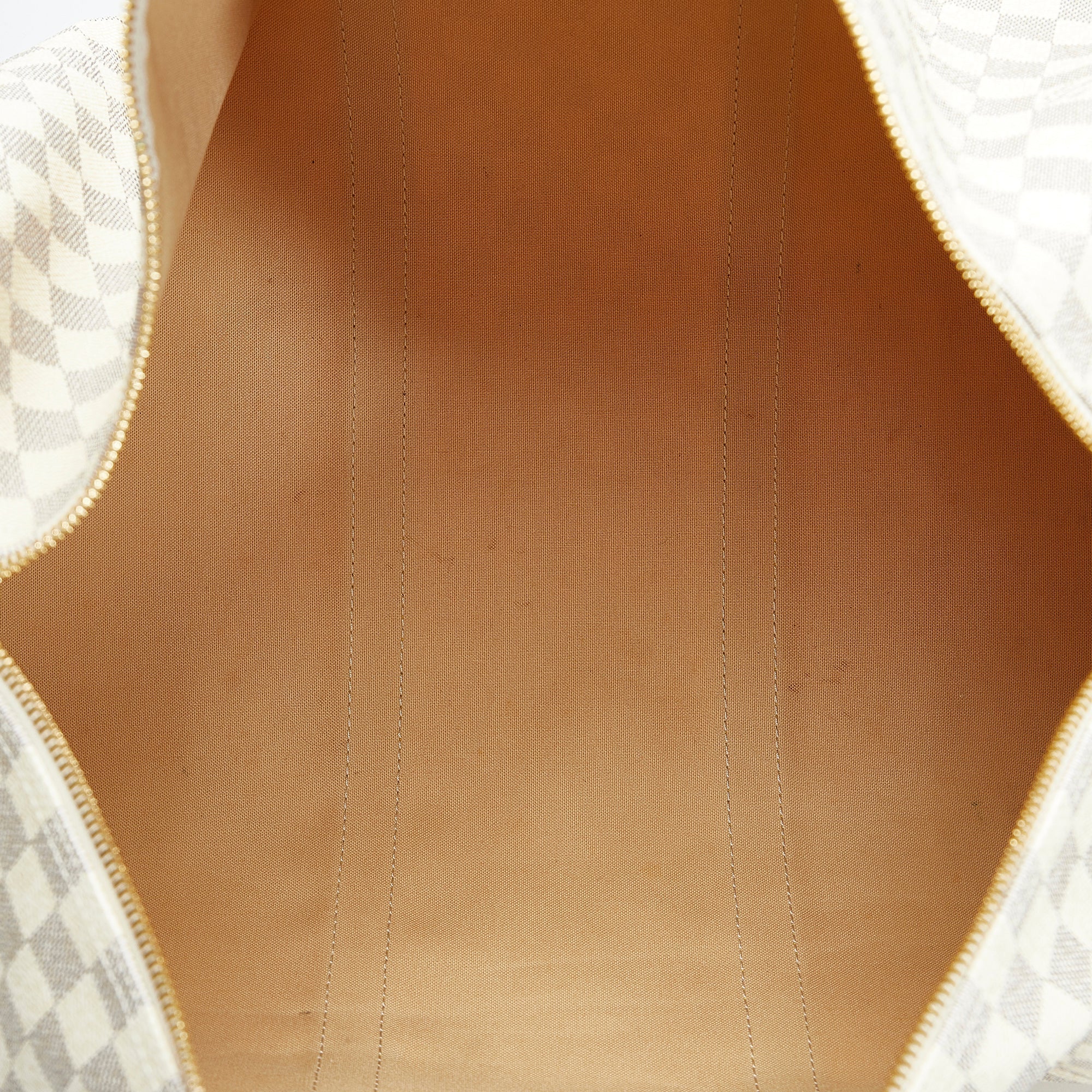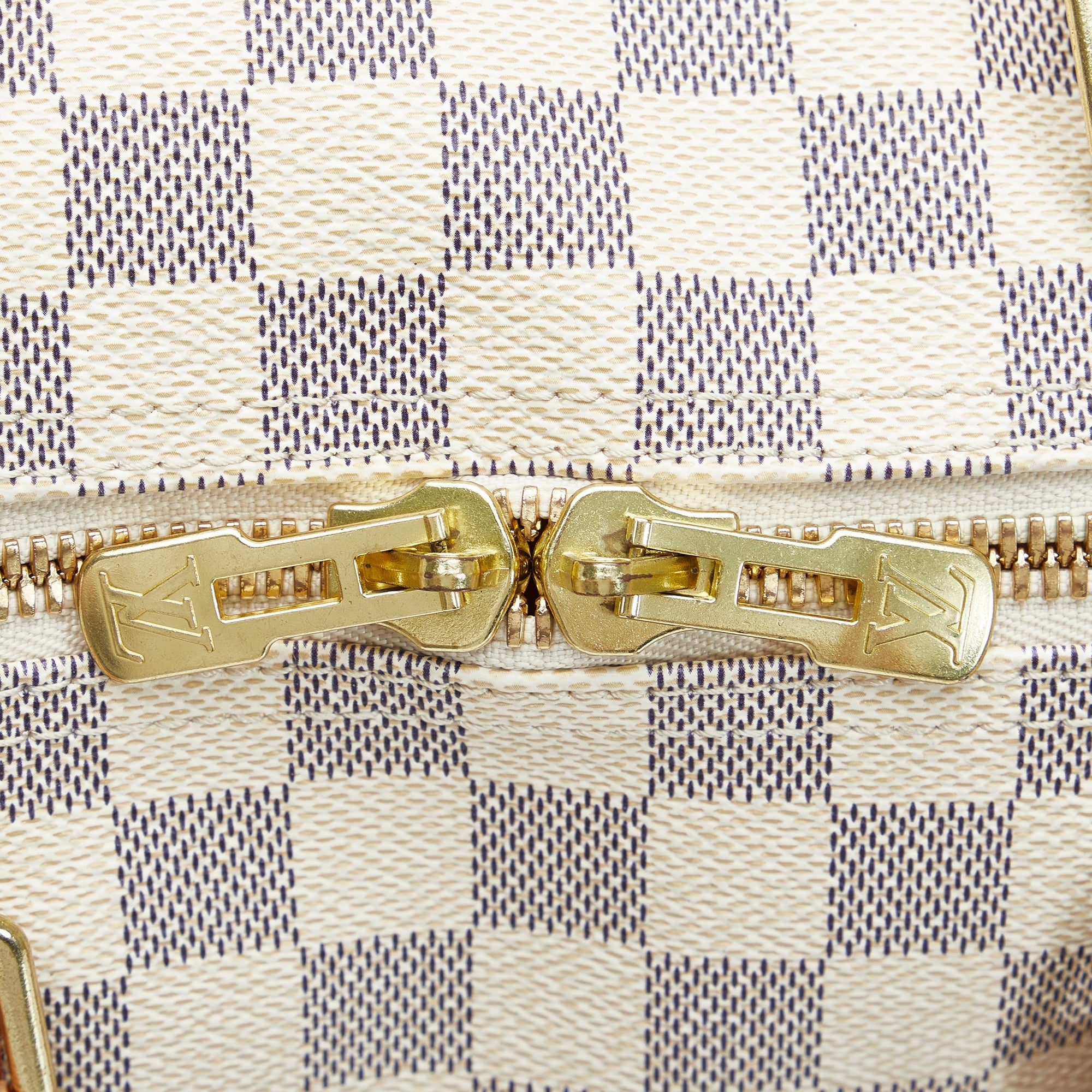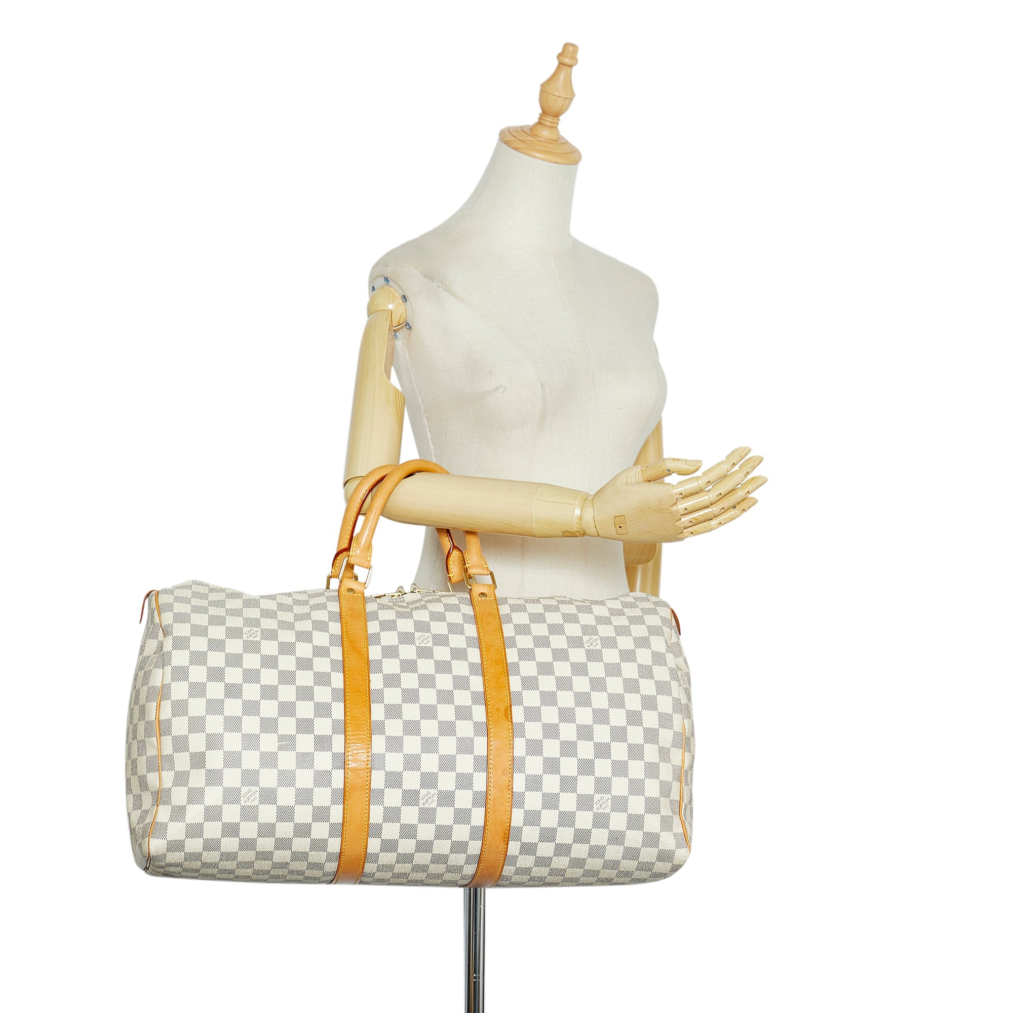The LV Keepall 50 is a true classic from the LV travel bag collection. It is made of the popular checkerboard Damier Azur Canvas and features a double gold-tone brass zipper. A great companion for a weekend trip.
