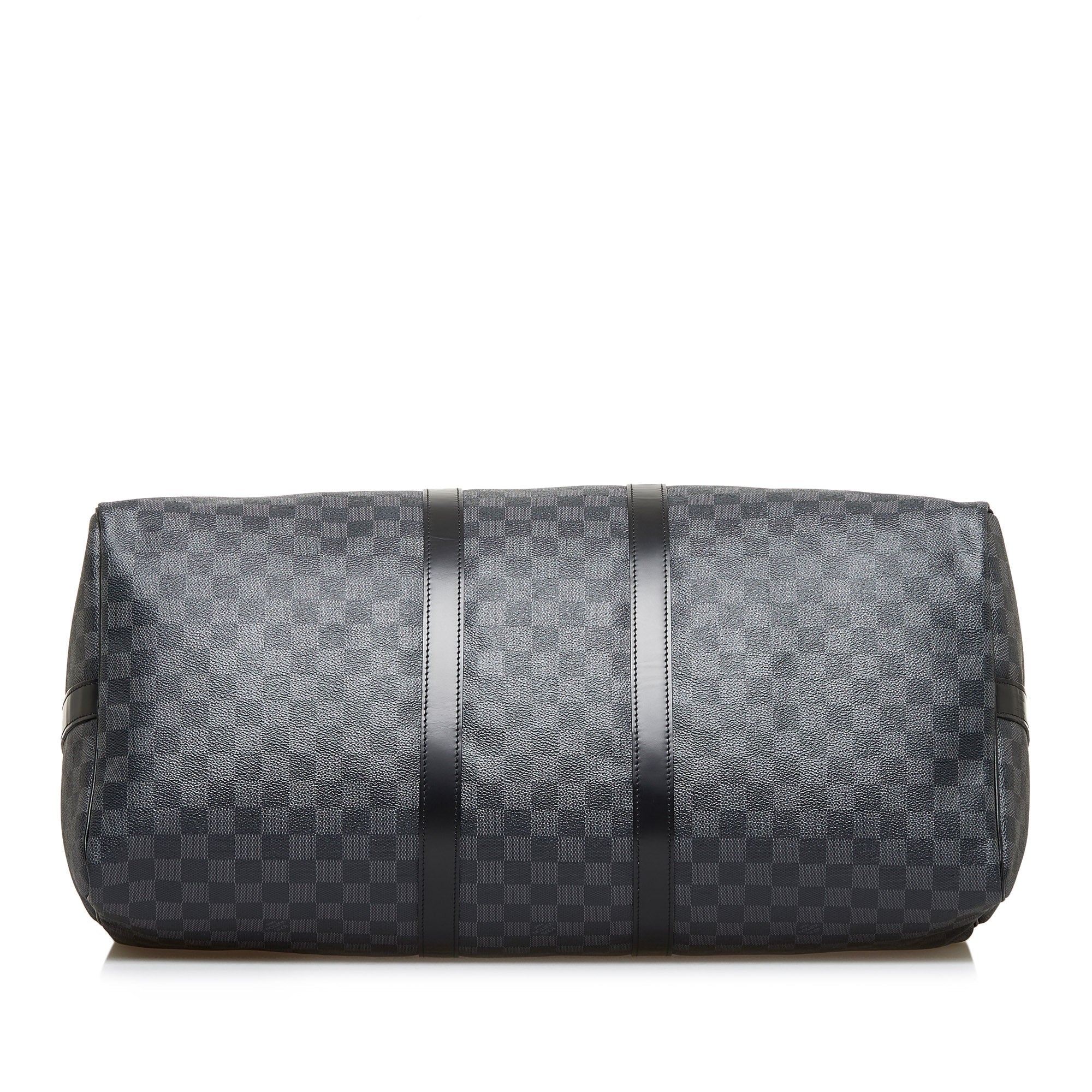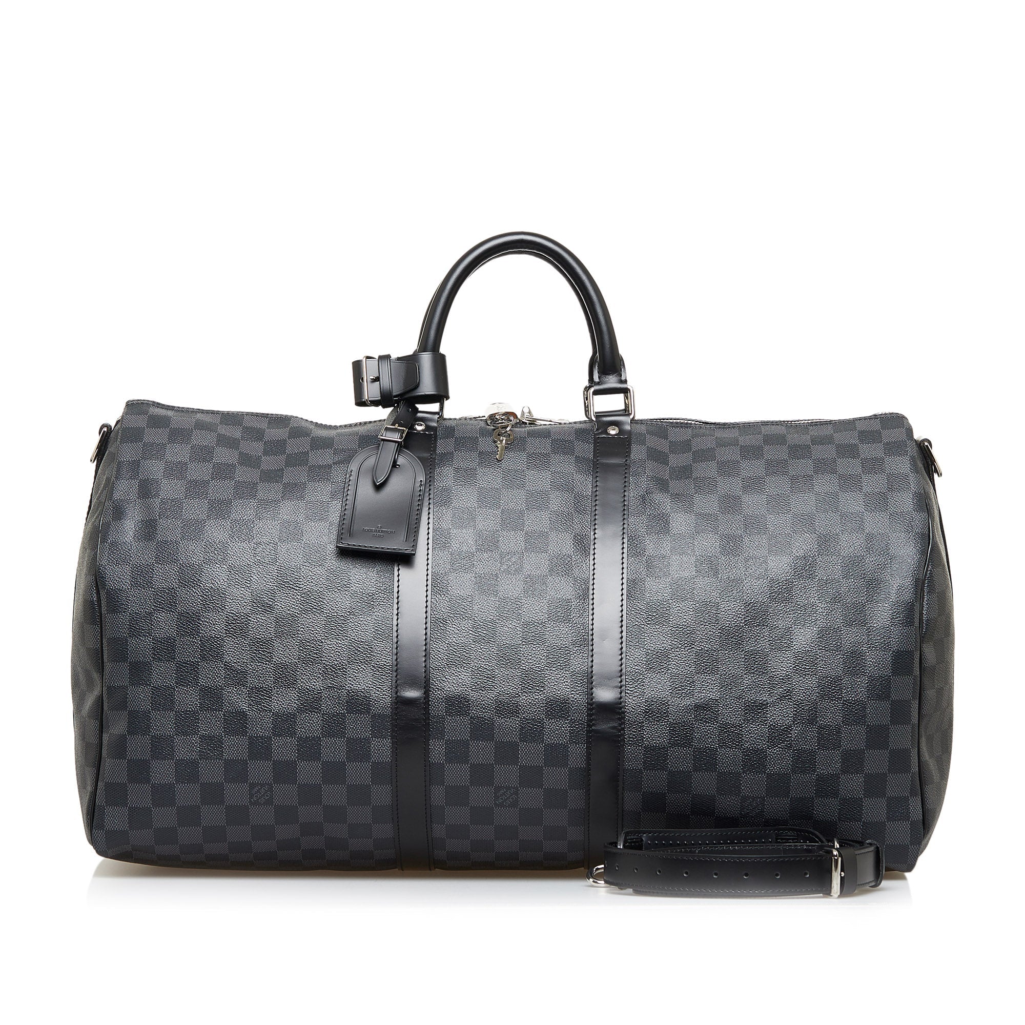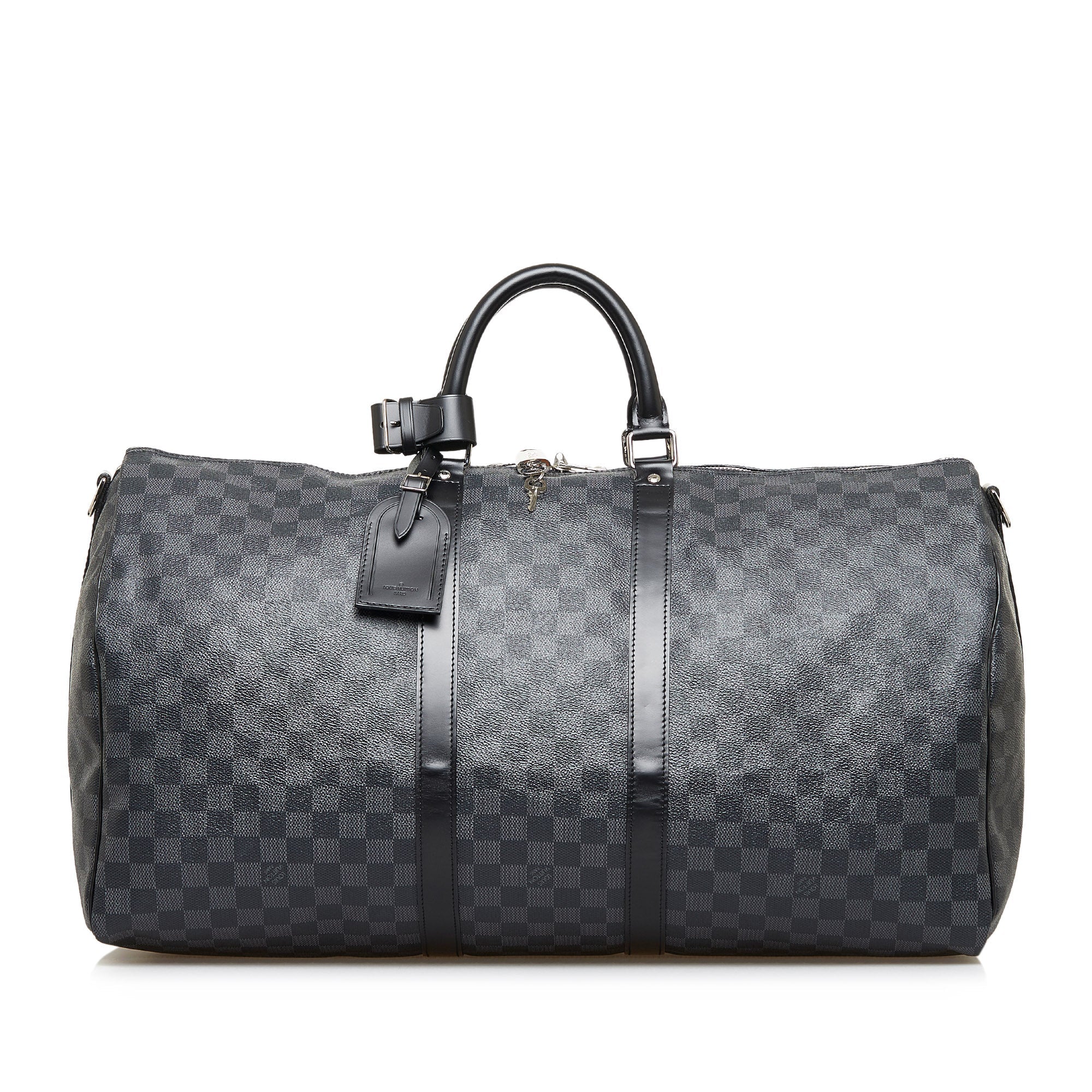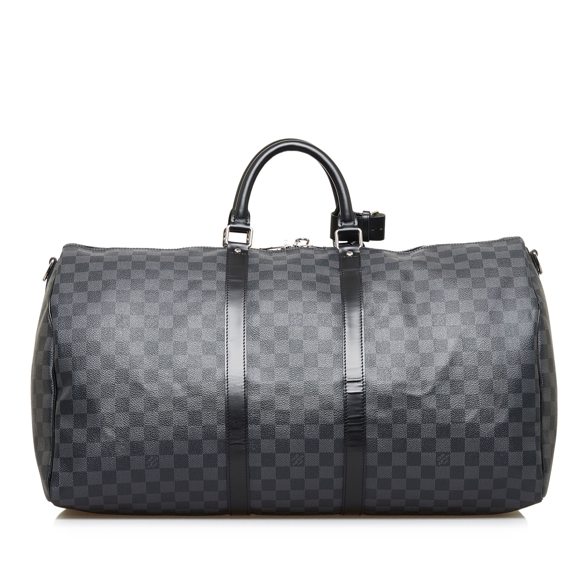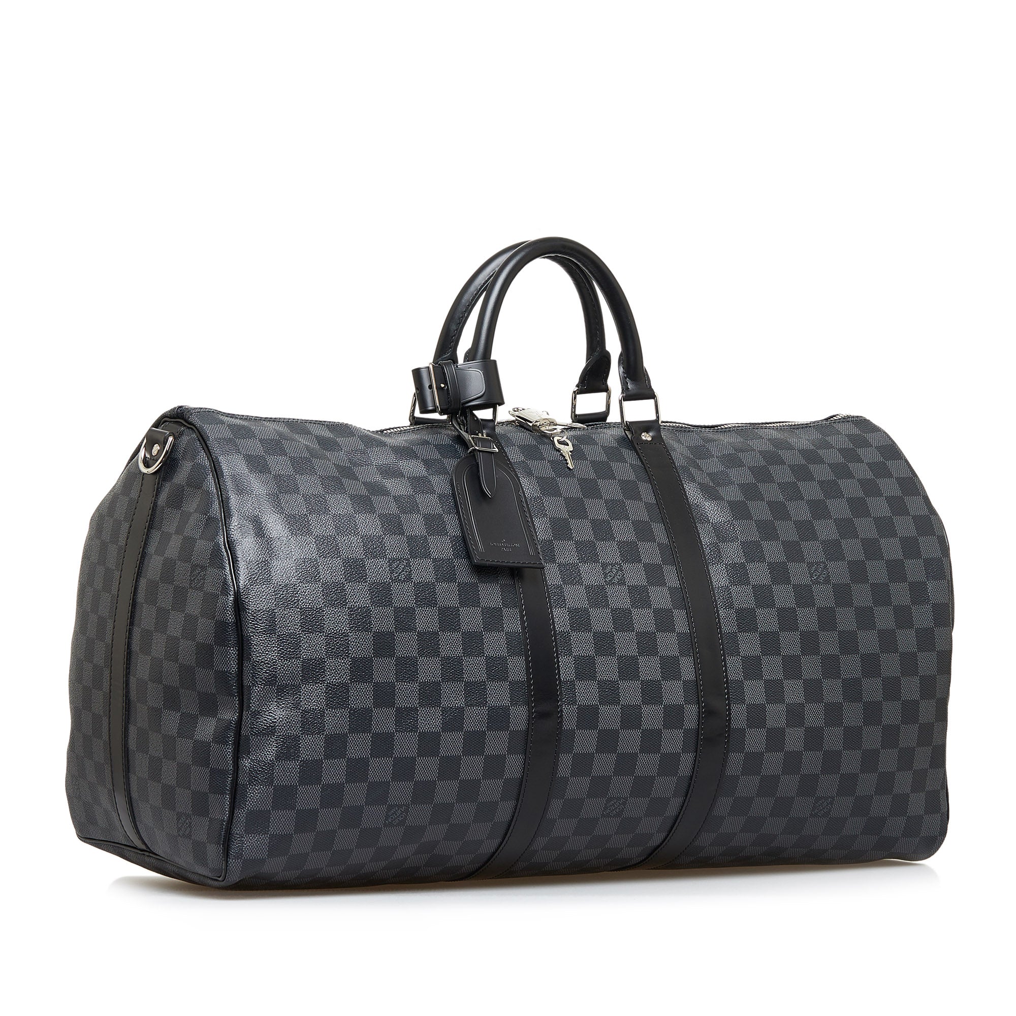 The LV Keepall 55 is a true classic from the LV travel bag collection. This specimen was made from Damier Graphite Canvas. The spacious Bag features a double brass zipper at the top opening. Black leather handles and trim create the signature LV look. A great companion for a weekend trip.