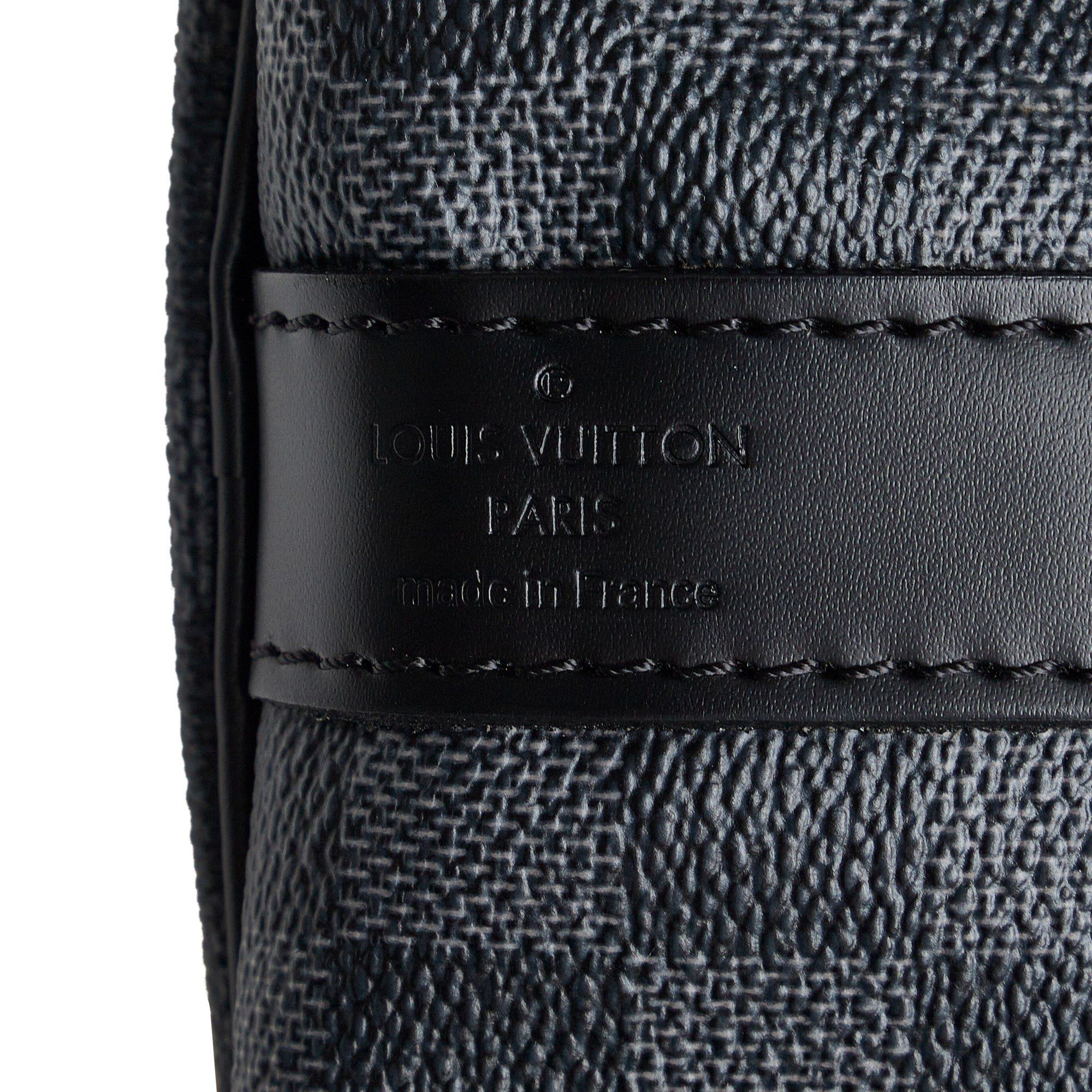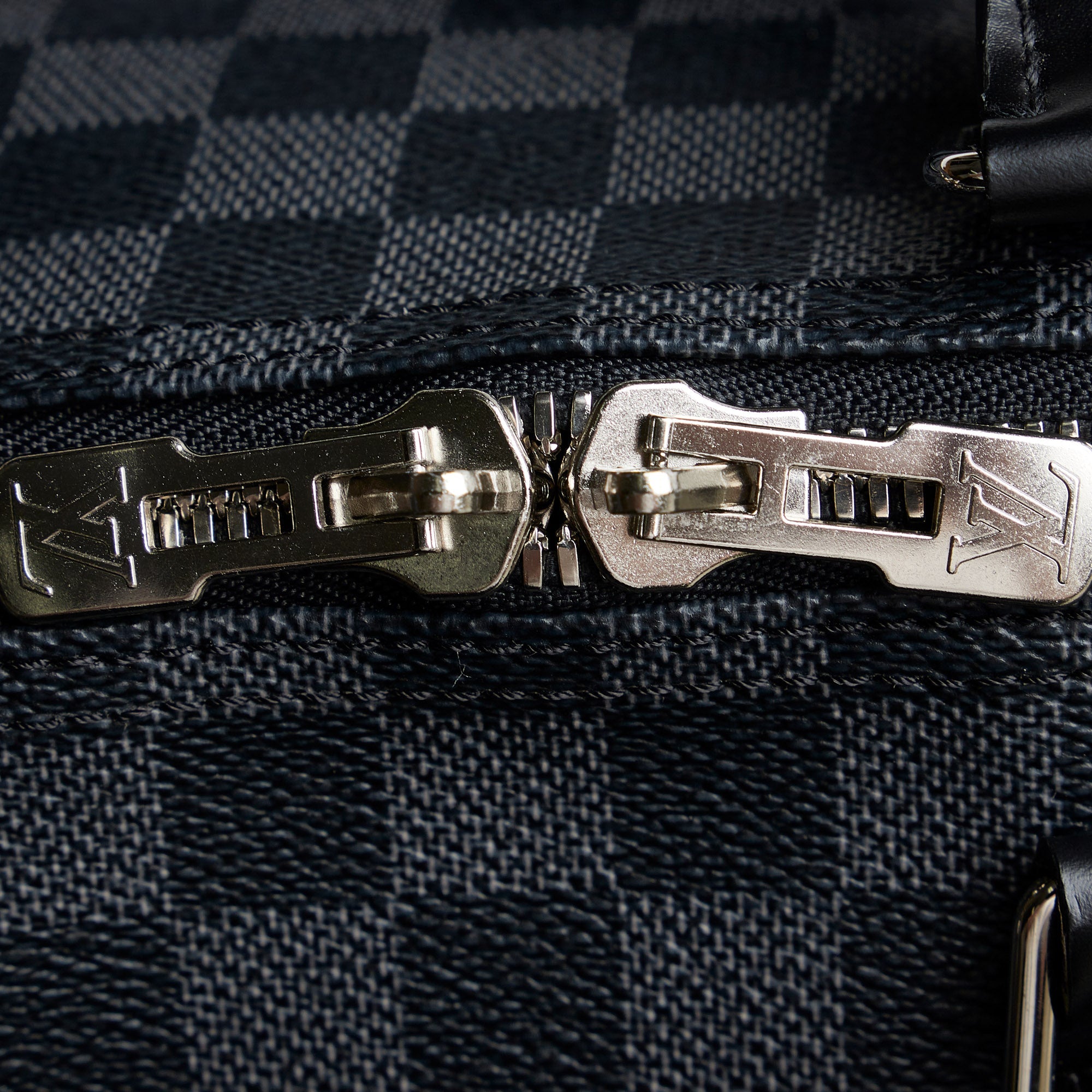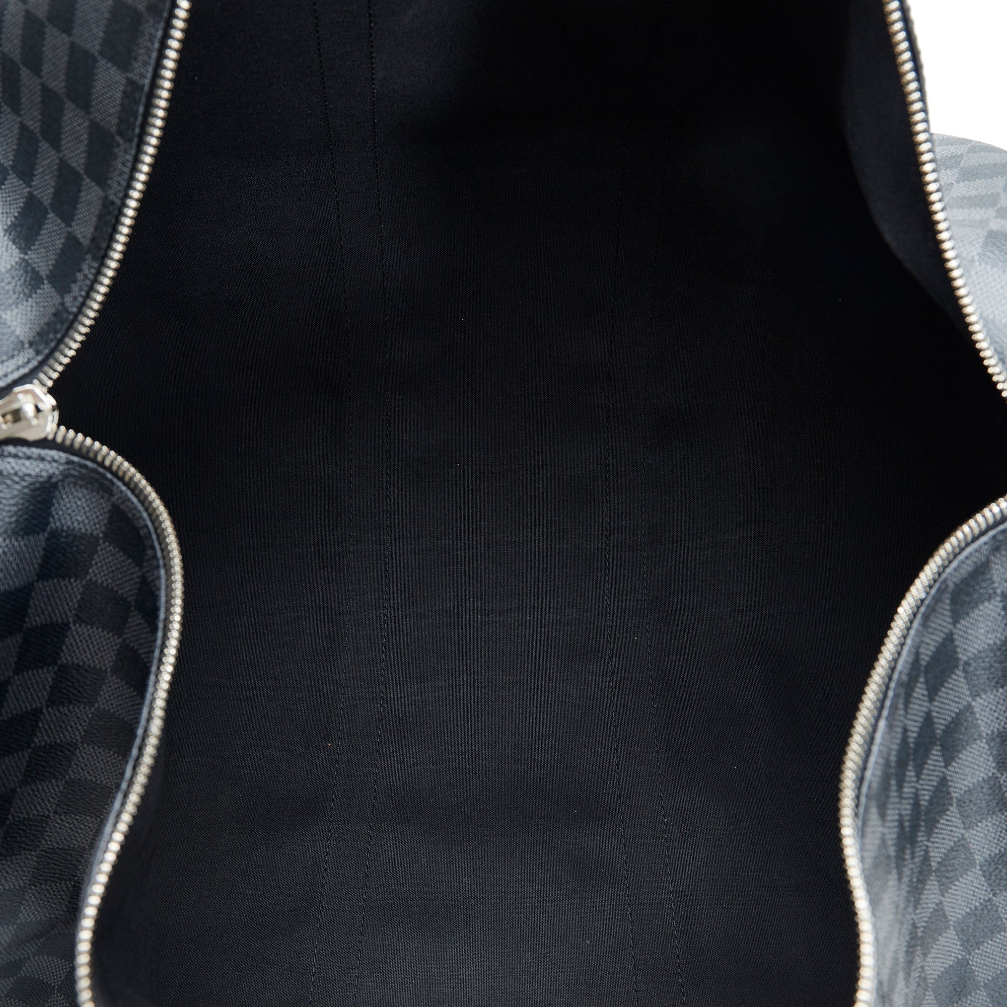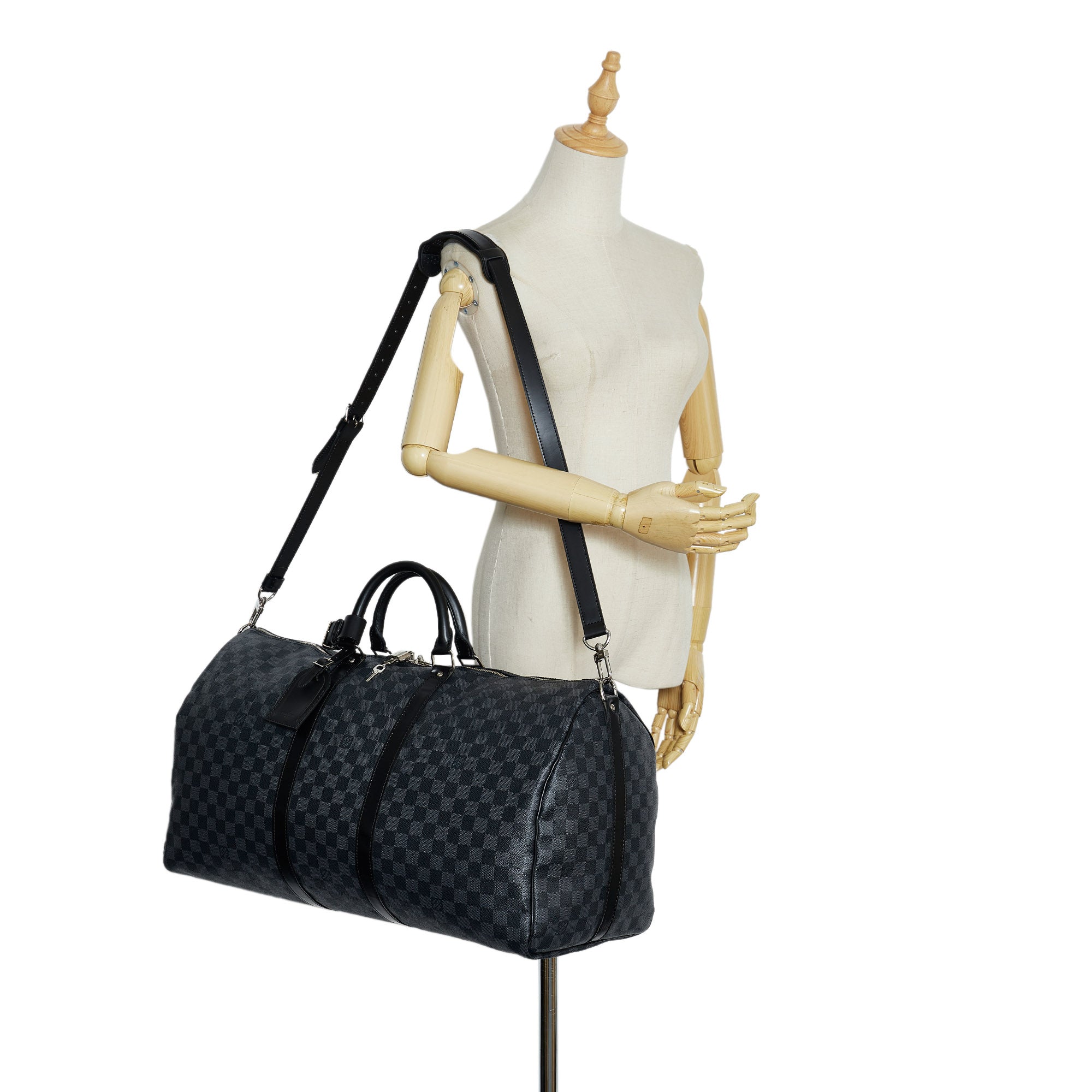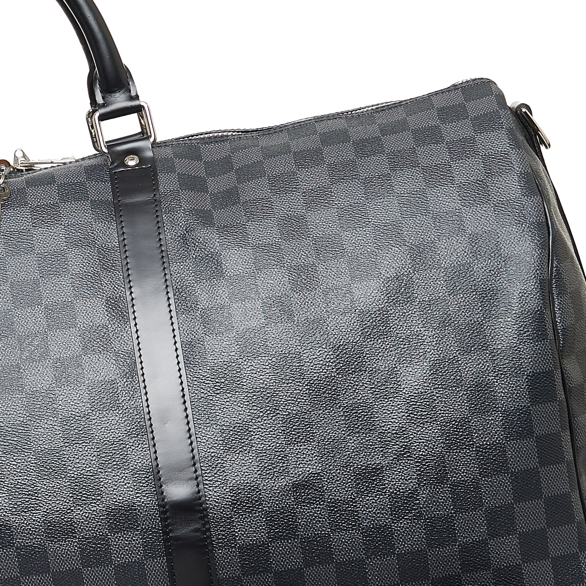 The LV Keepall 55 is a true classic from the LV travel bag collection. This specimen was made from Damier Graphite Canvas. The spacious Bag features a double brass zipper at the top opening. Black leather handles and trim create the signature LV look. A great companion for a weekend trip.