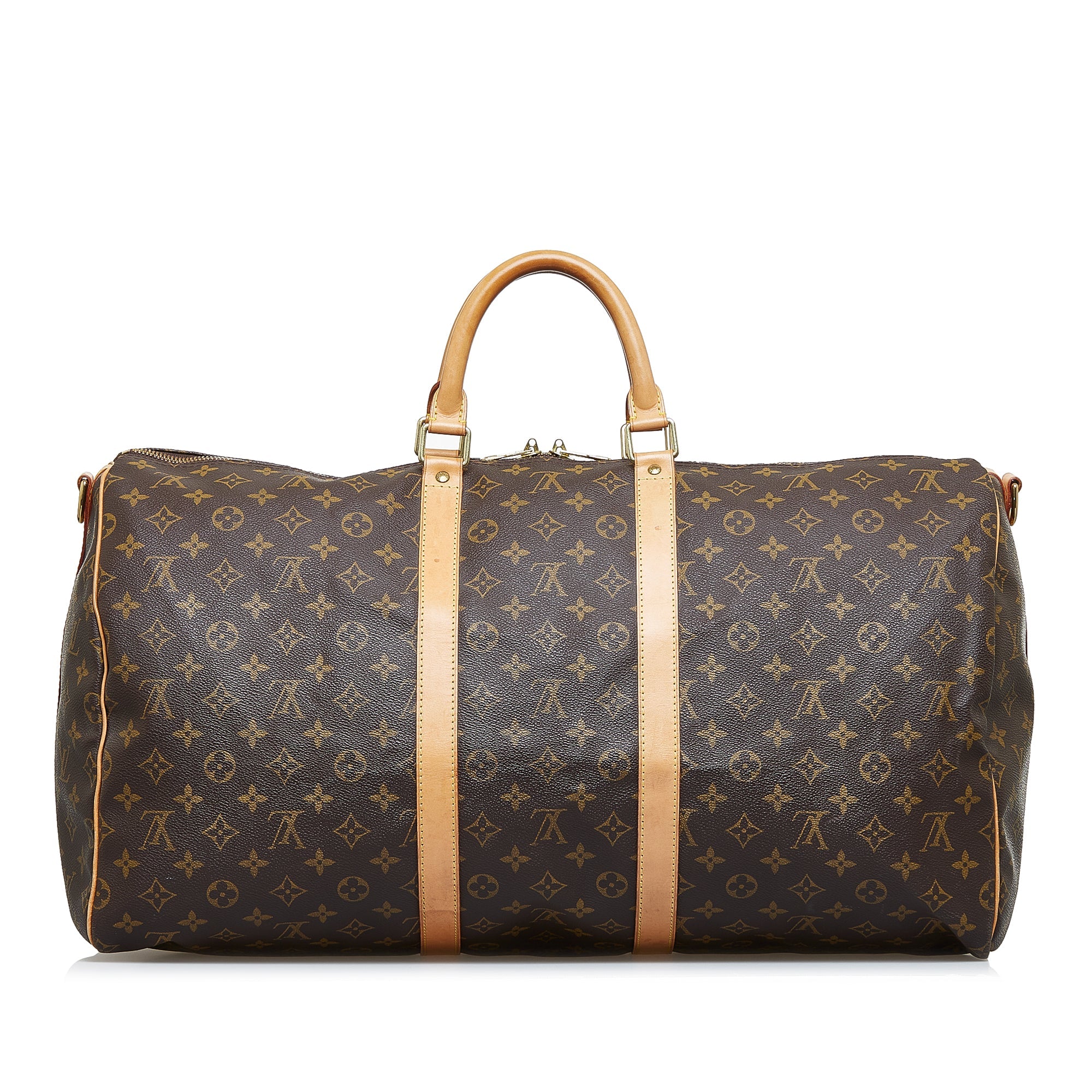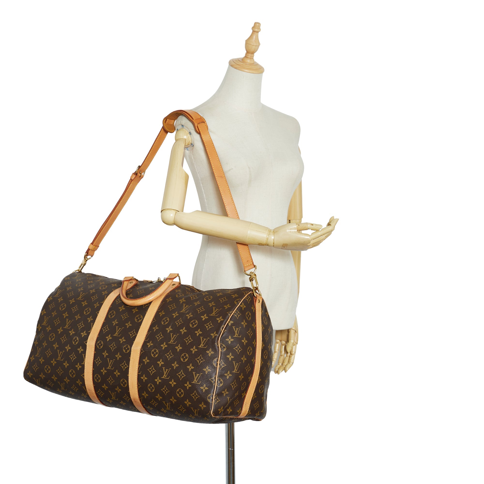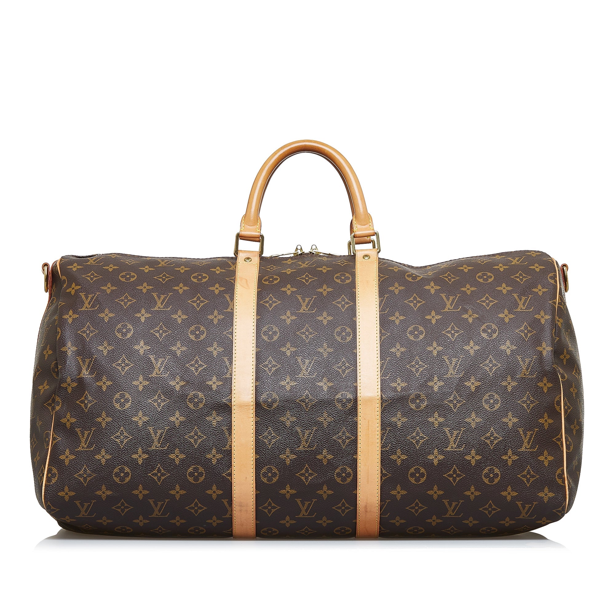 The LV Keepall 55 Bandoulière is a true classic from the LV travel bag collection. This one has been crafted from dark brown Monogram canvas. The spacious Bag features a double gold-tone brass zipper at the top opening. Light brown leather handles and trim create the signature LV look. A great companion for a weekend trip.