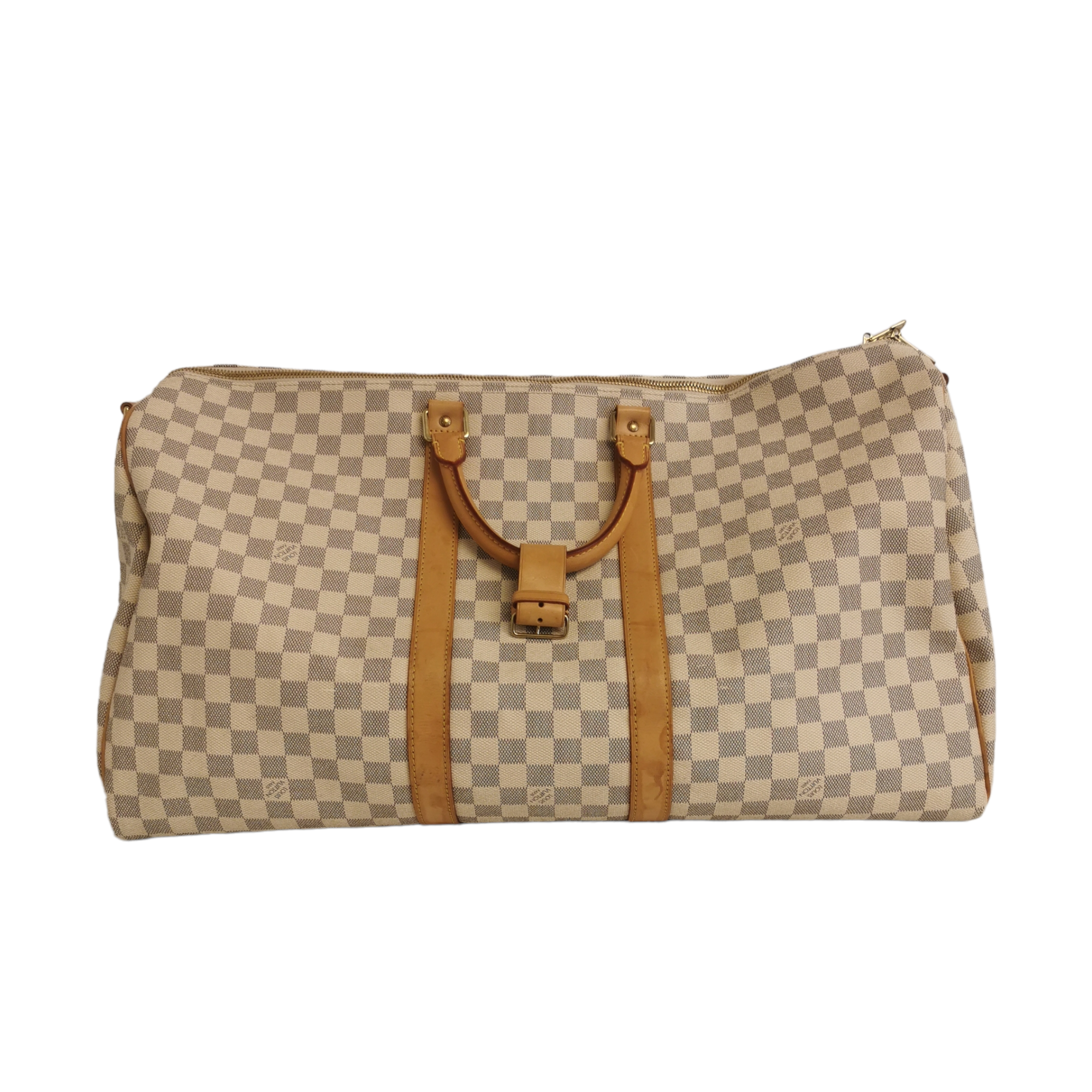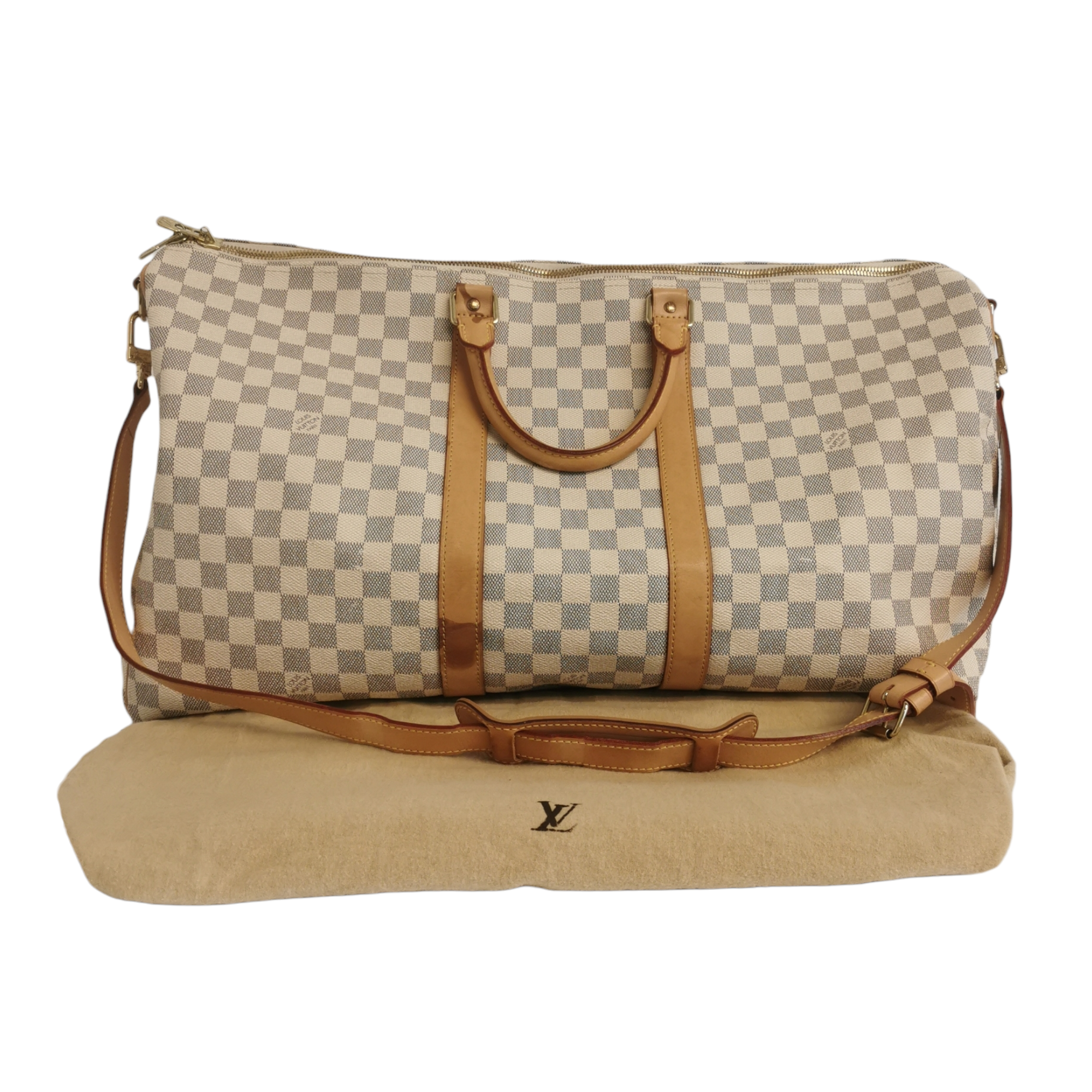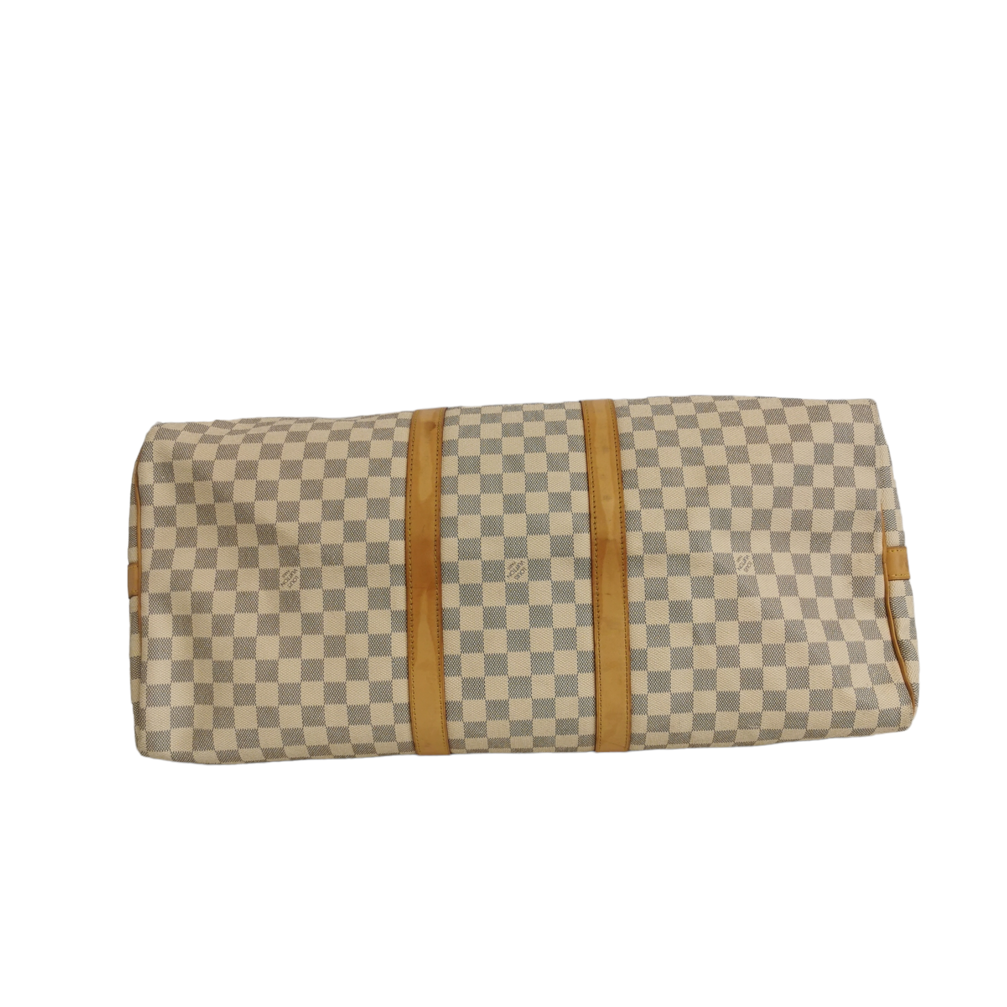 The LV Keepall Damier Azur is a true classic from the LV travel bag collection. This specimen was made from Azur Canvas. The spacious Bag features a double gold-tone zipper at the top opening. Light brown handles and trimmings of leather create the signature LV look. A great companion for a weekend trip.