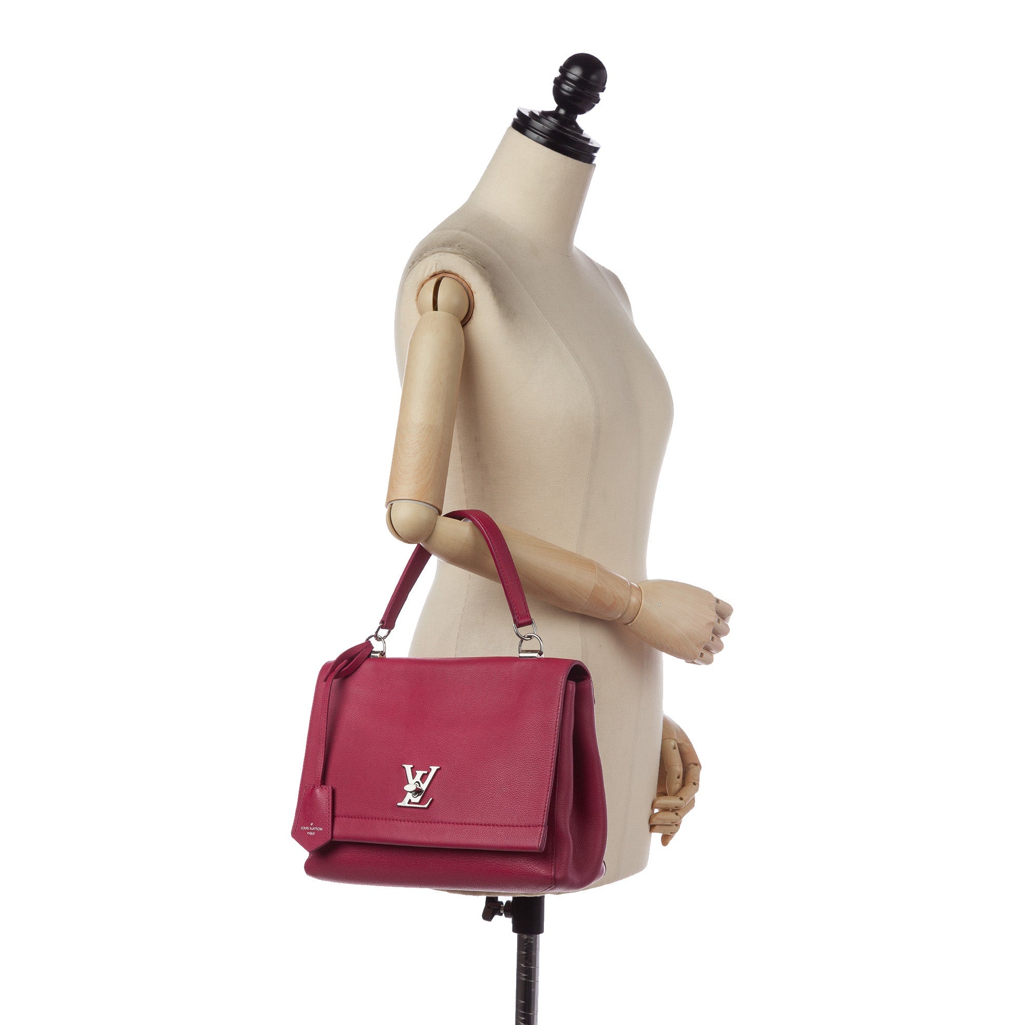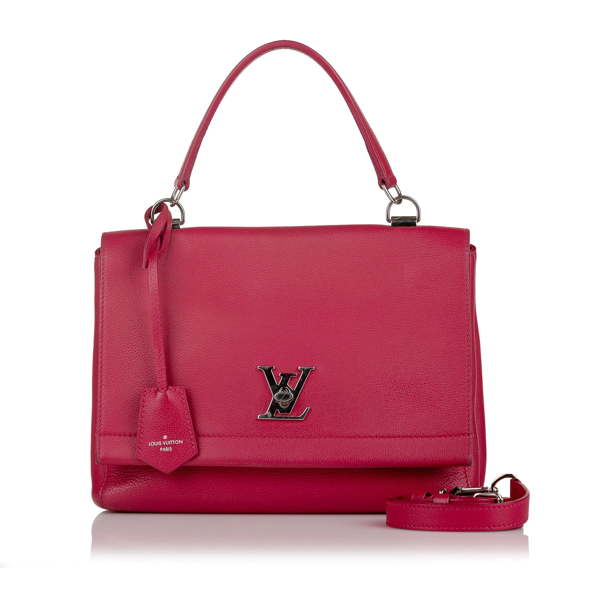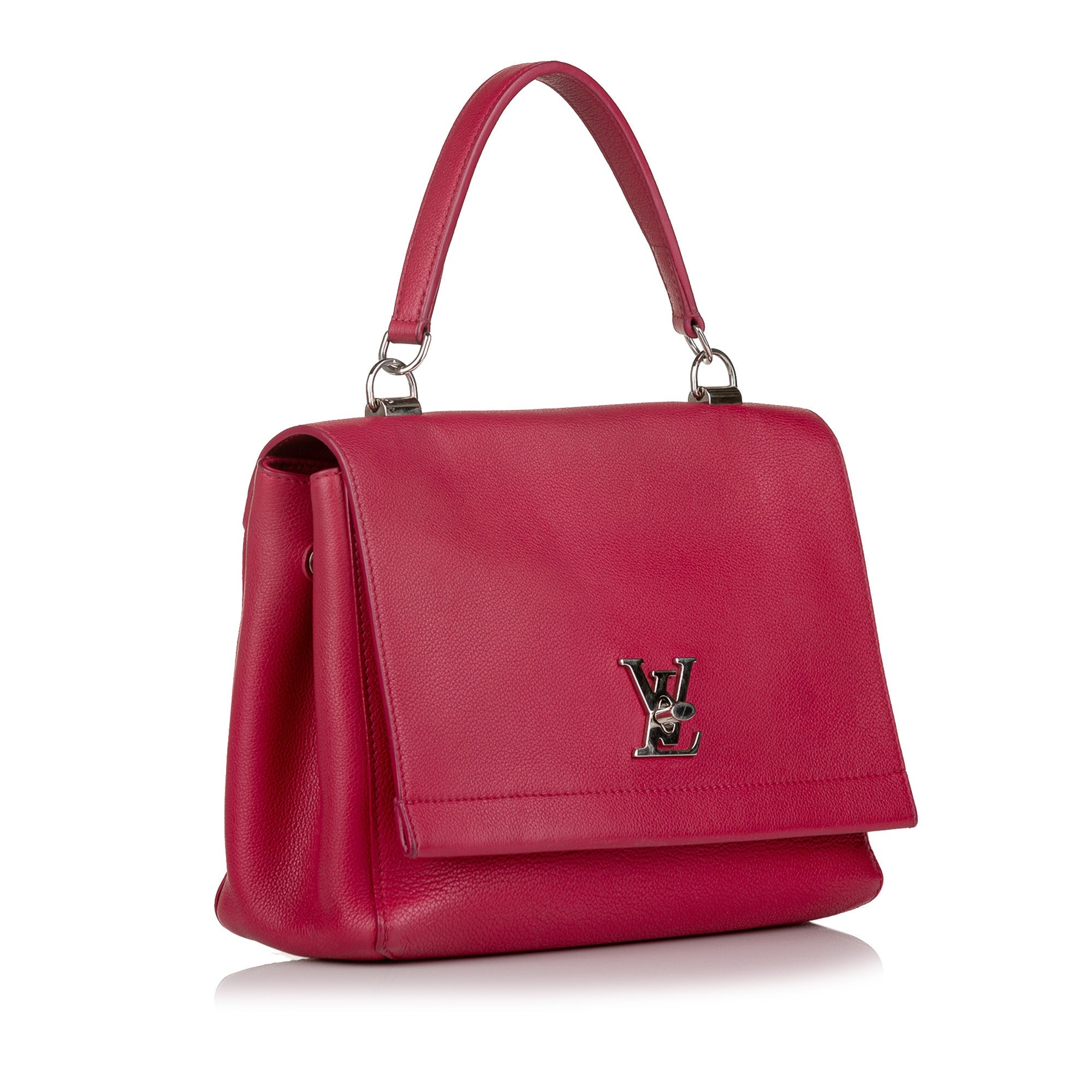 This beautiful LV Lockme II was made of pink leather. The Bag features a flat leather handle, a detachable shoulder strap, a flap with a silver twist closure and slip pockets inside. The Bag is worn in the hand or arm , but also over the shoulder thanks to the removable strap.