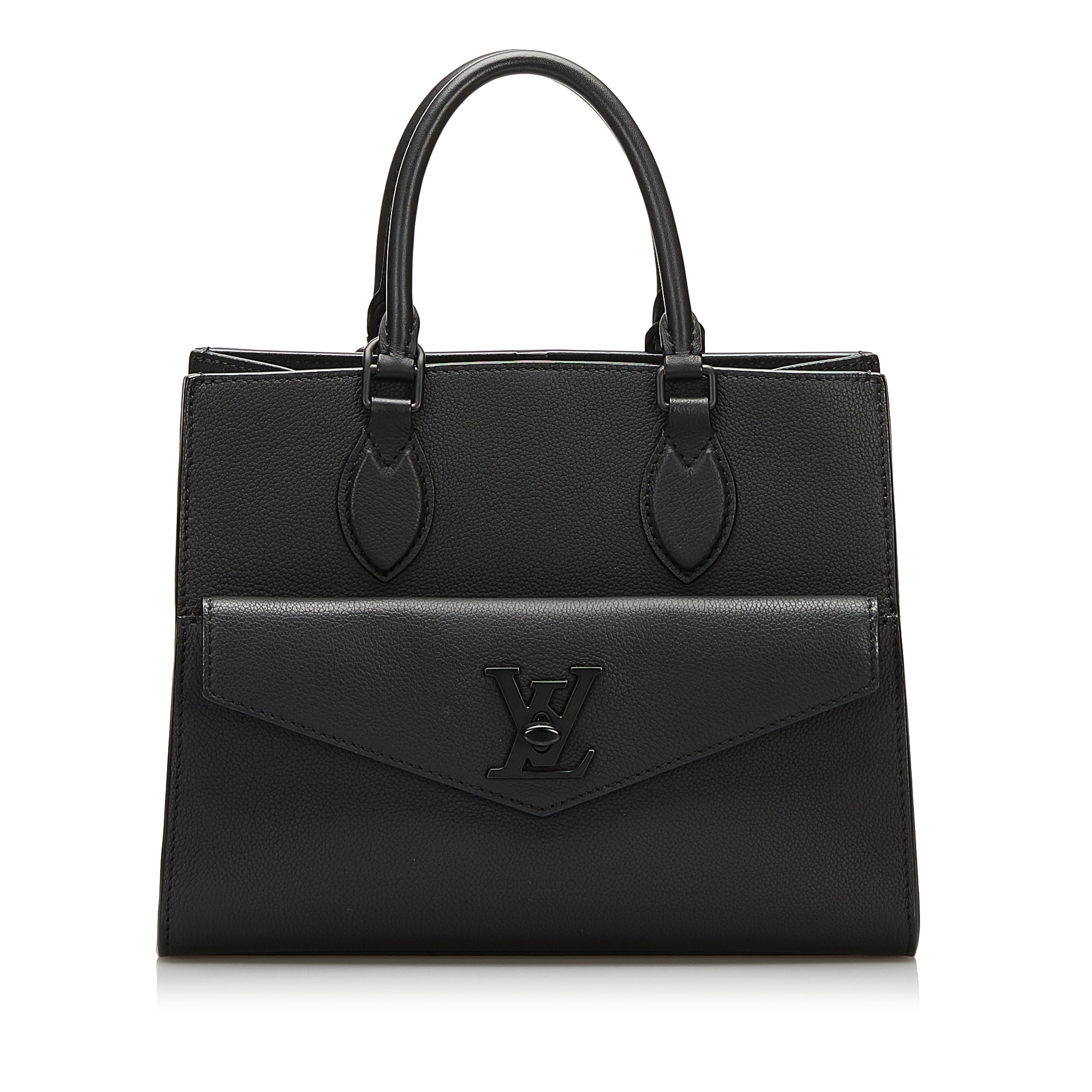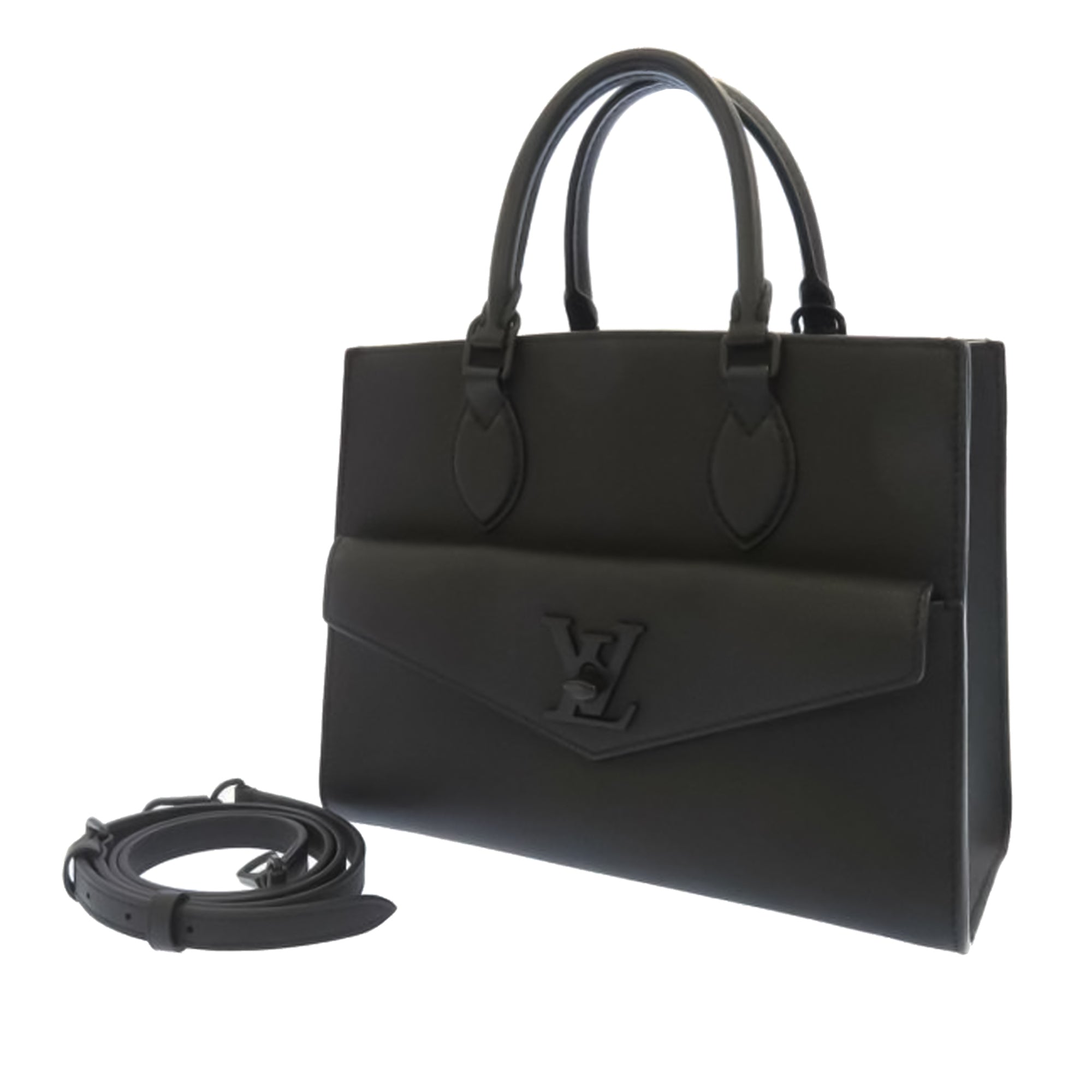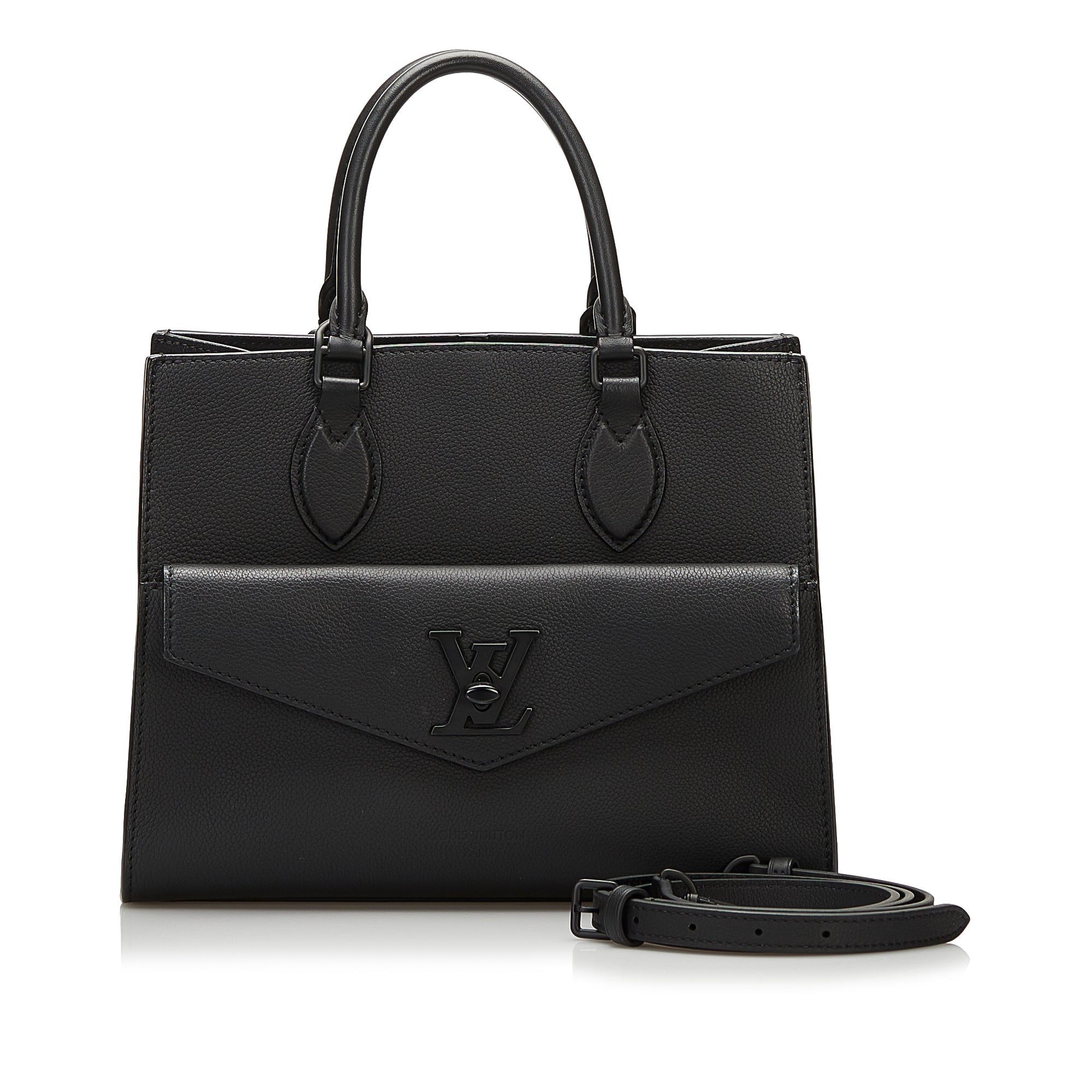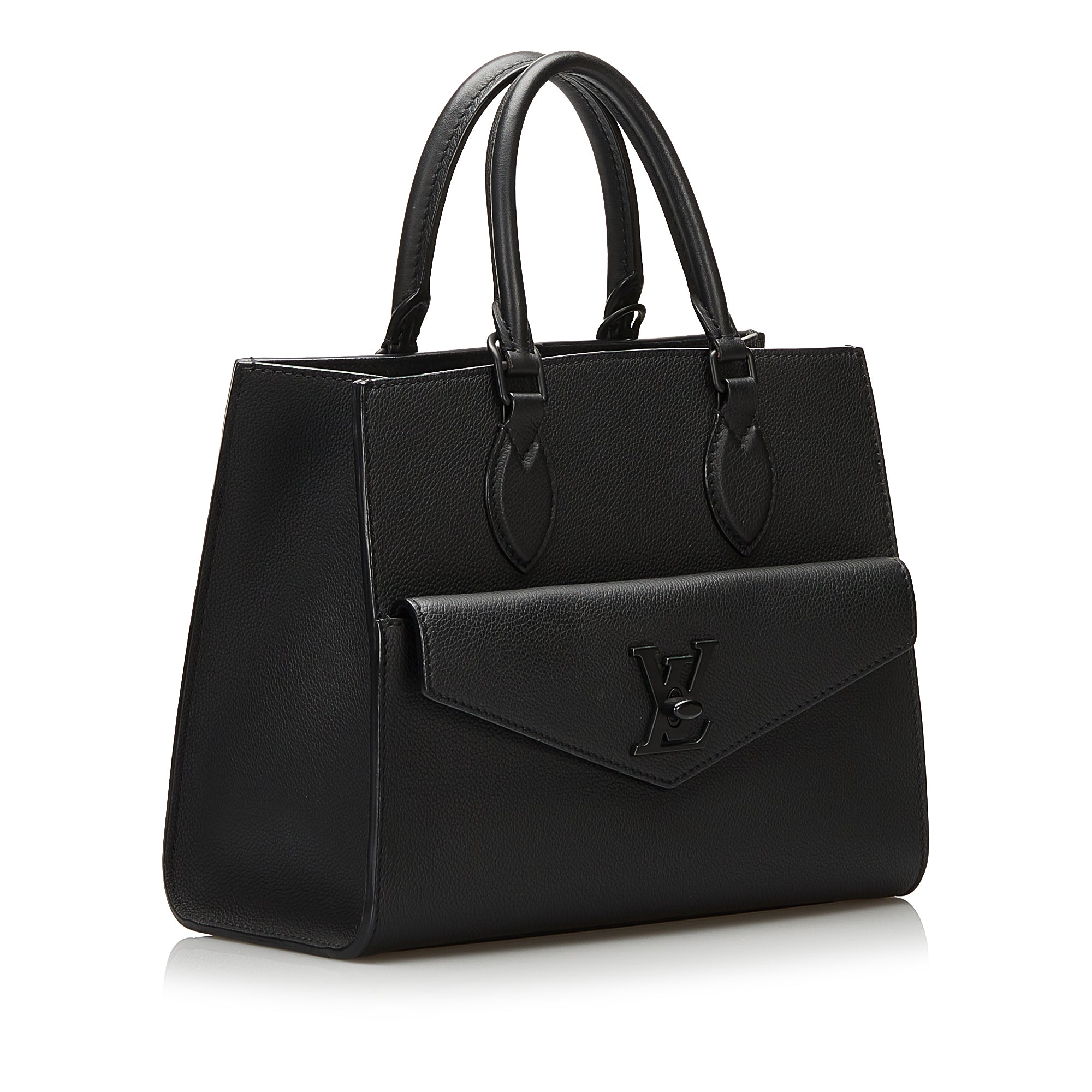 This LV Lockme Go Tote is made of black calfskin. The Bag features a front flap pocket with the signature LV twist closure, two rolled top handles, an open top and a detachable shoulder strap. The Bag Has interior compartments and an interior zippered pocket. It is best worn over the shoulder or over the arm.