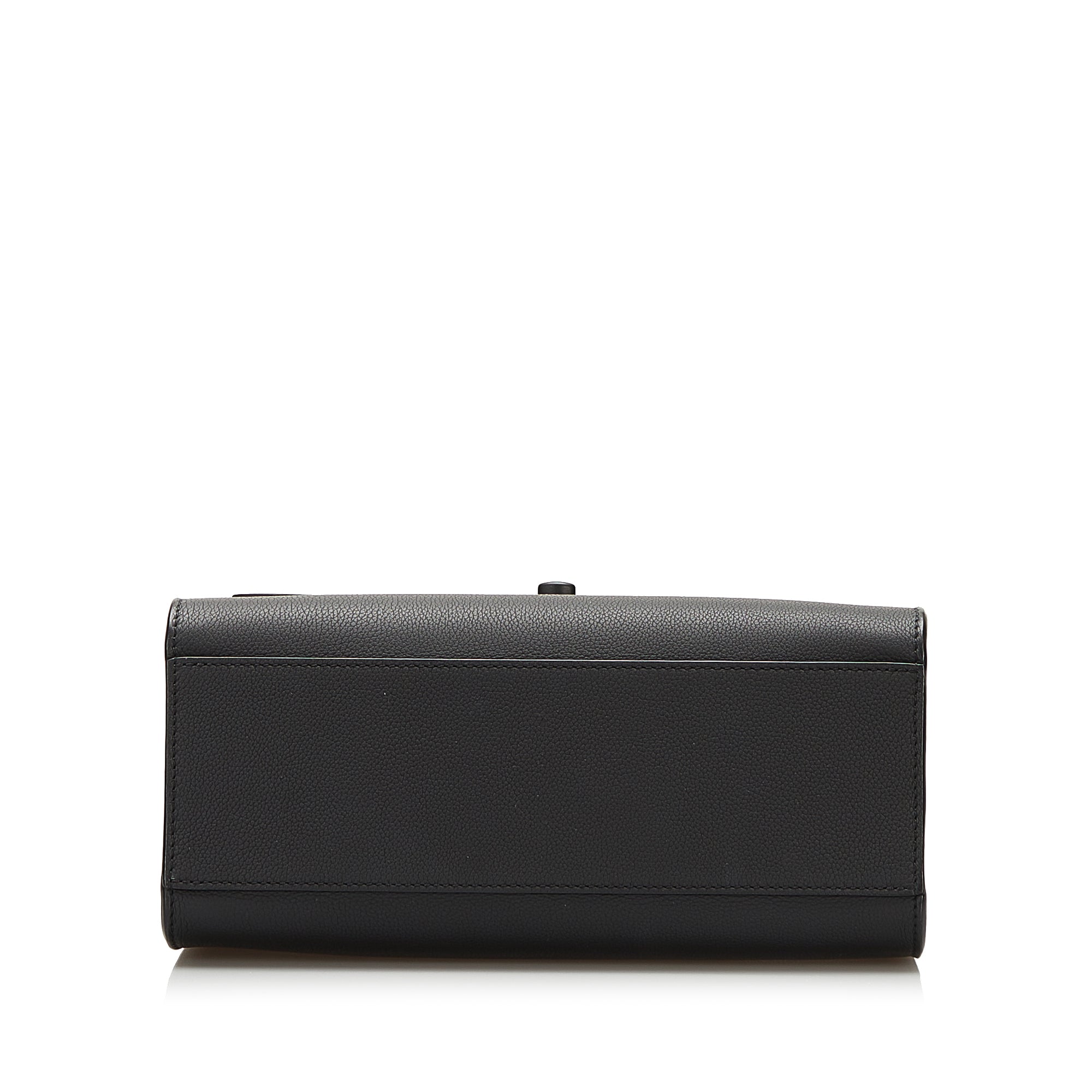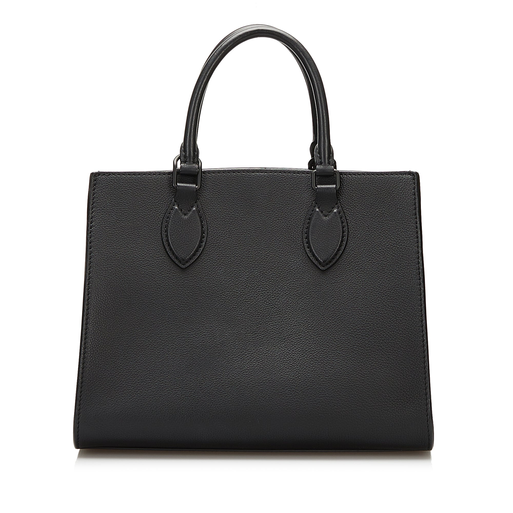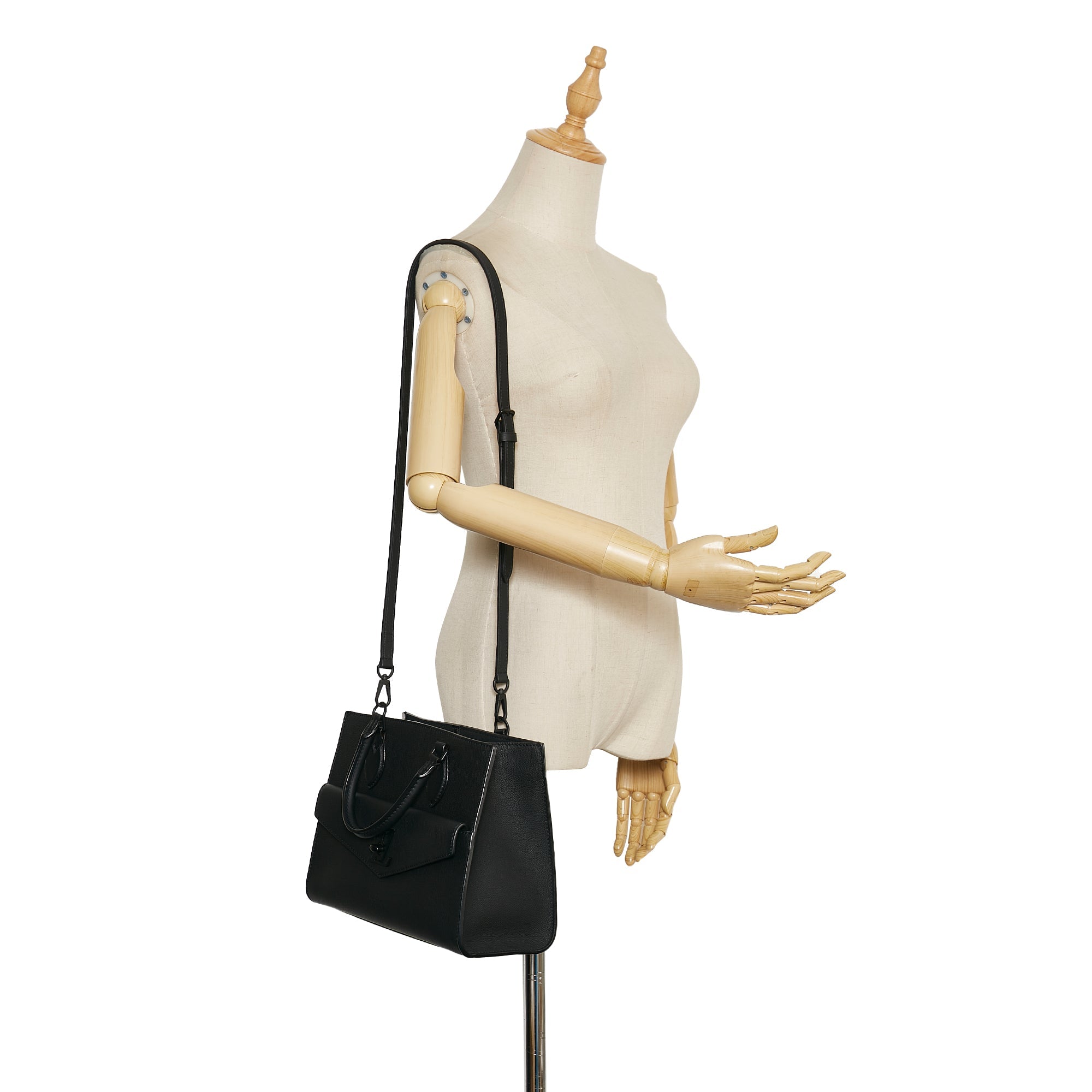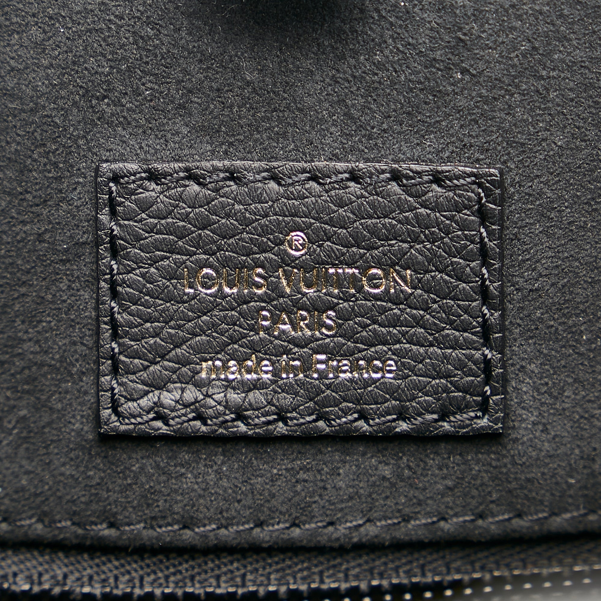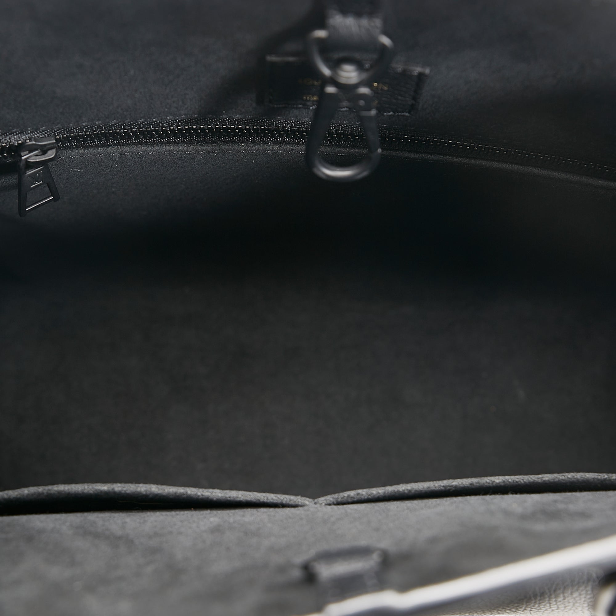 This LV Lockme Go Tote is made of black calfskin. The Bag features a front flap pocket with the signature LV twist closure, two rolled top handles, an open top and a detachable shoulder strap. The Bag Has interior compartments and an interior zippered pocket. It is best worn over the shoulder or over the arm.