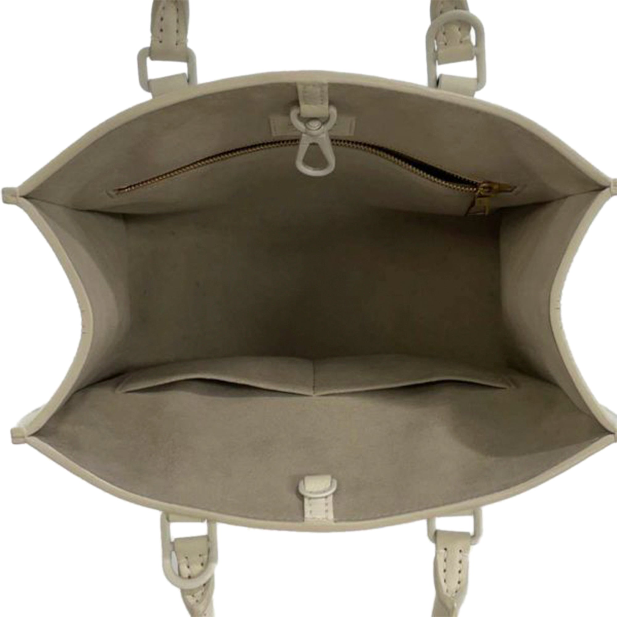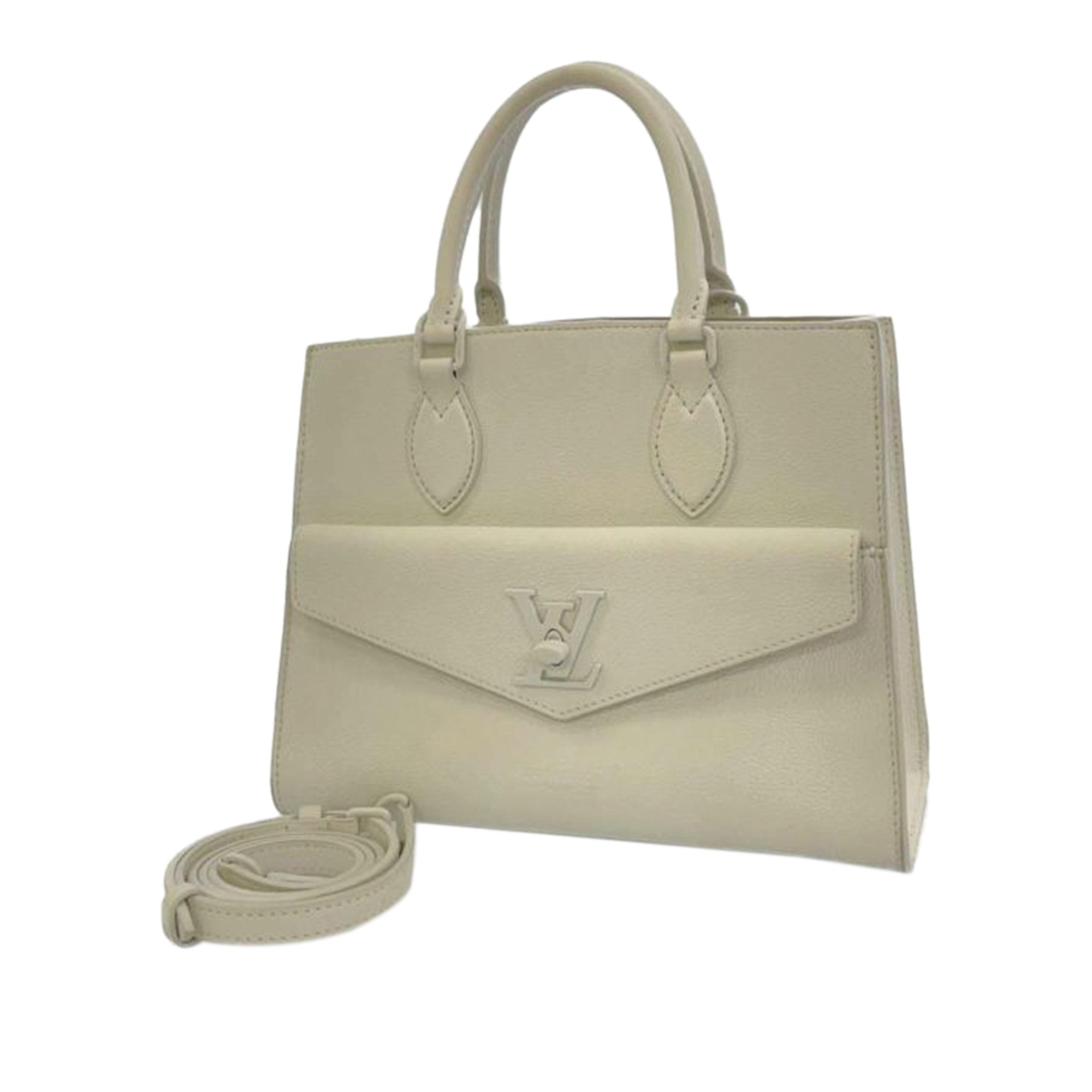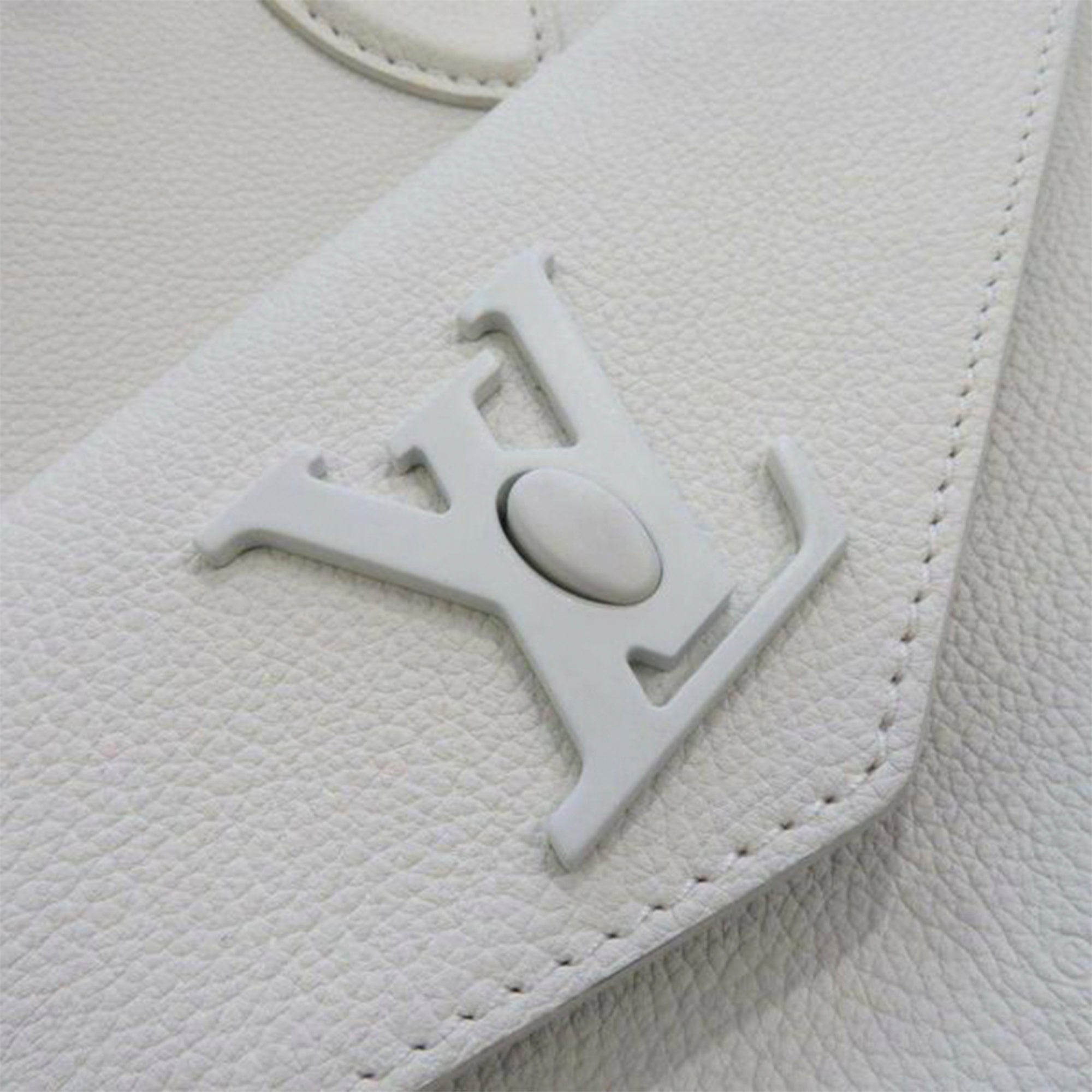 This LV Lockme Go Tote is made of white calfskin. The Bag features a front flap pocket with the signature LV twist closure, two rolled top handles, an open top and a detachable shoulder strap. The Bag Has interior compartments and an interior zippered pocket. It is best worn over the shoulder or arm.
