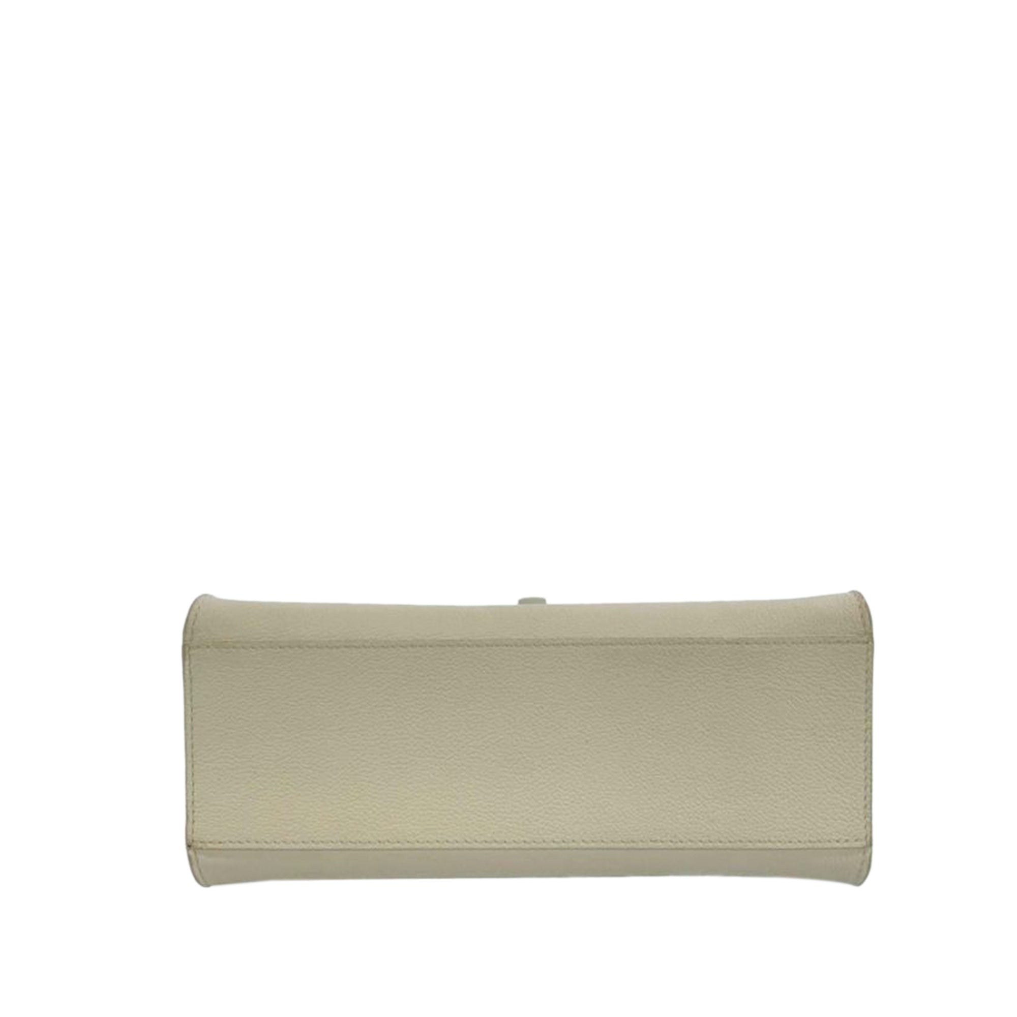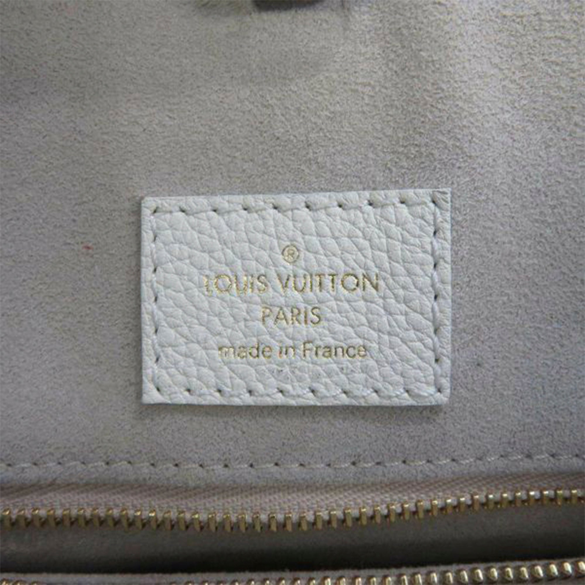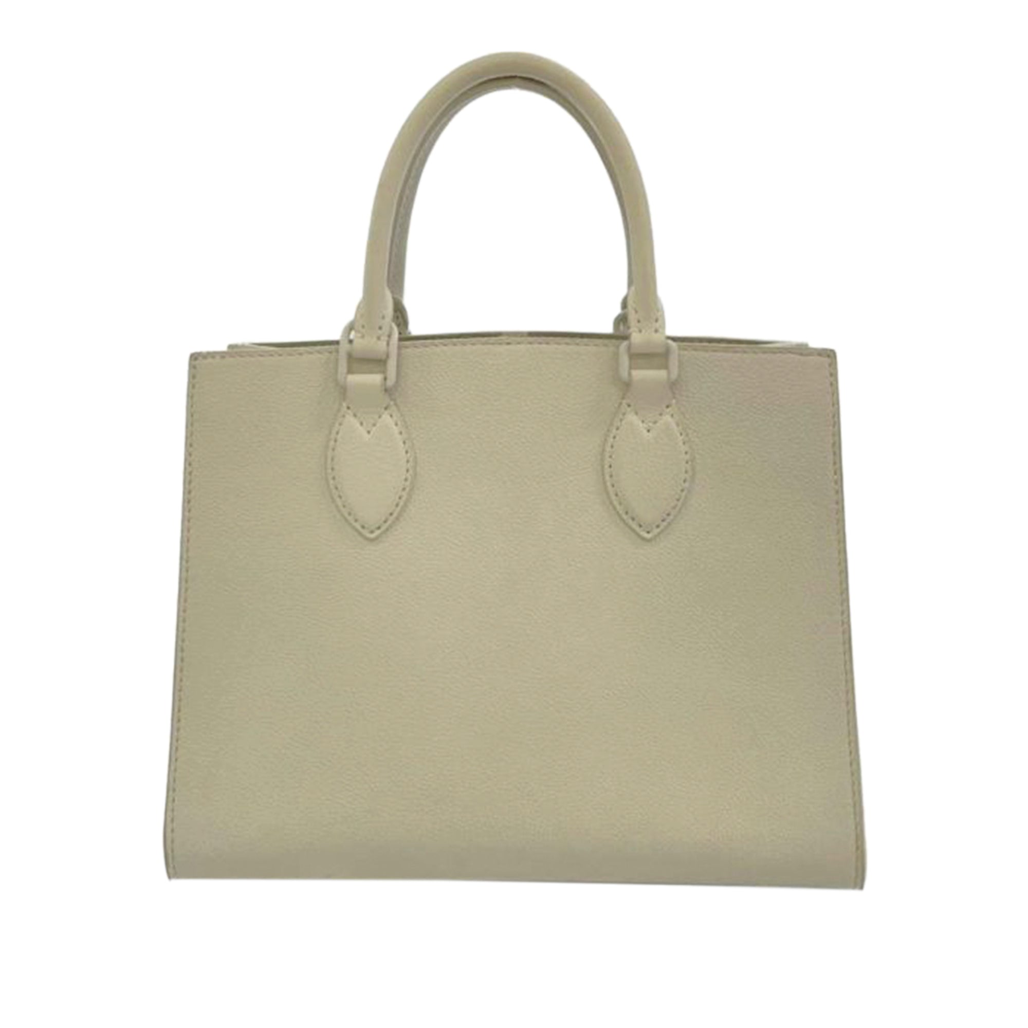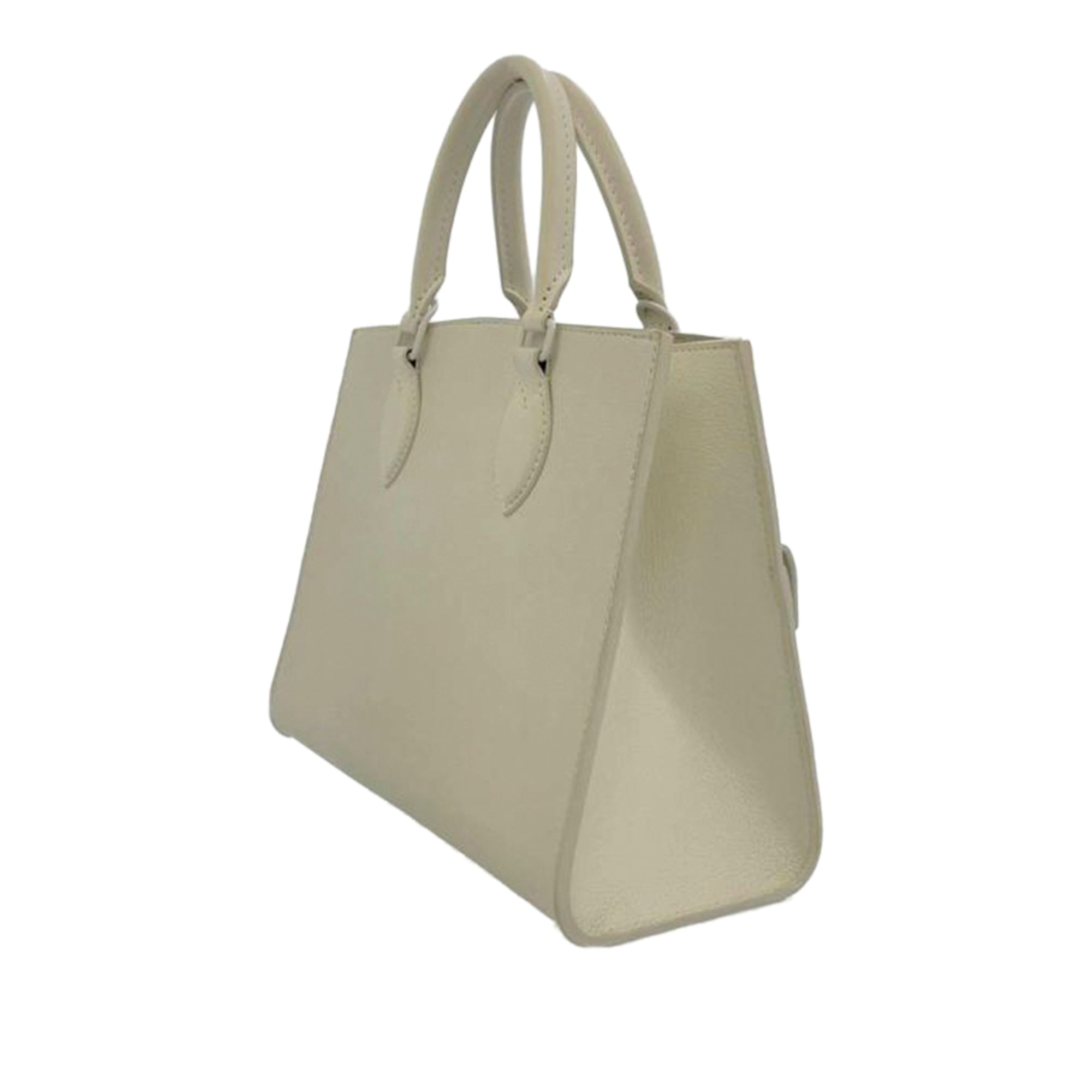 This LV Lockme Go Tote is made of white calfskin. The Bag features a front flap pocket with the signature LV twist closure, two rolled top handles, an open top and a detachable shoulder strap. The Bag Has interior compartments and an interior zippered pocket. It is best worn over the shoulder or arm.