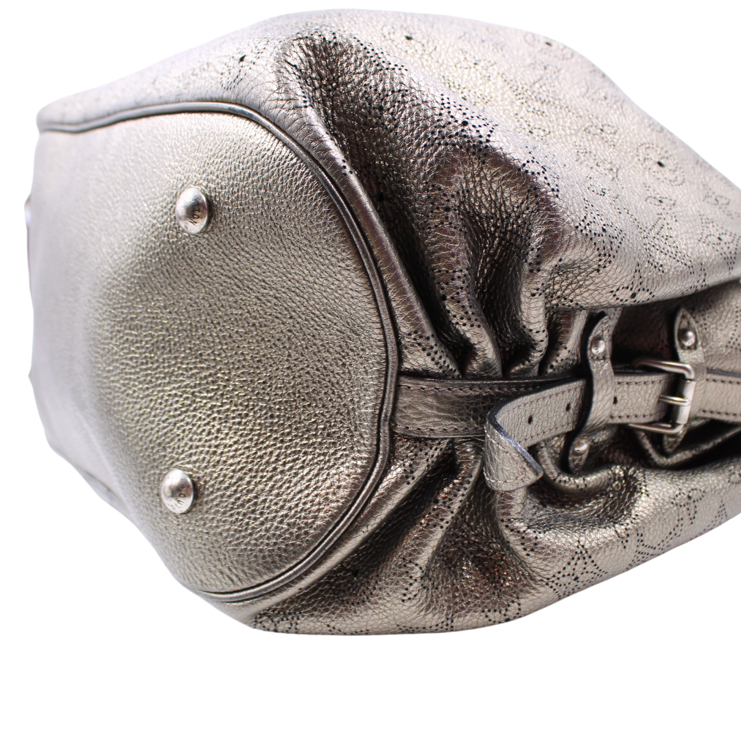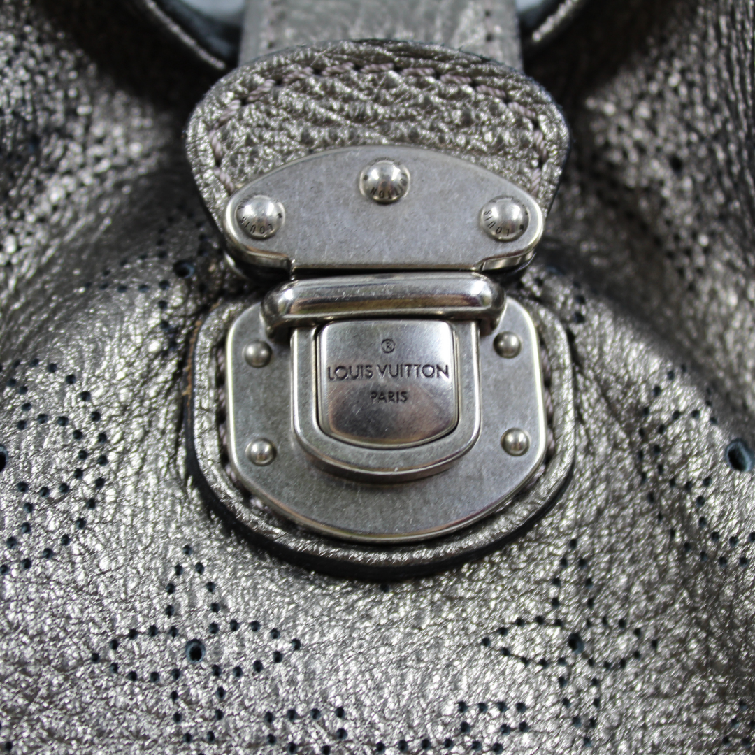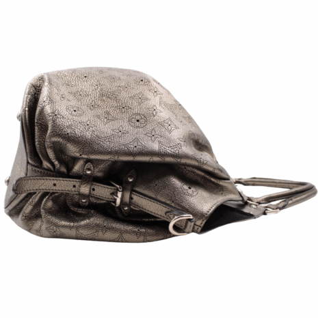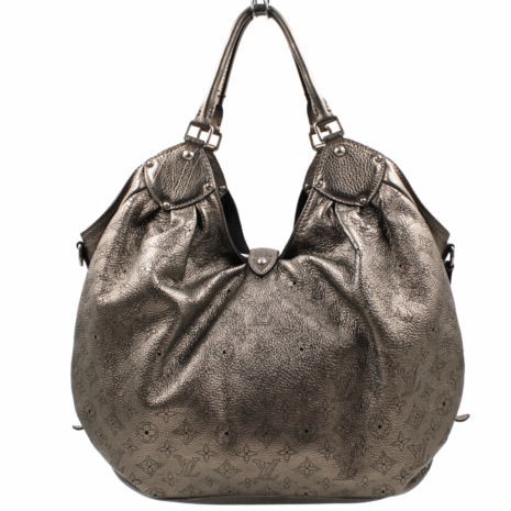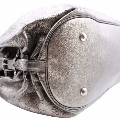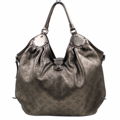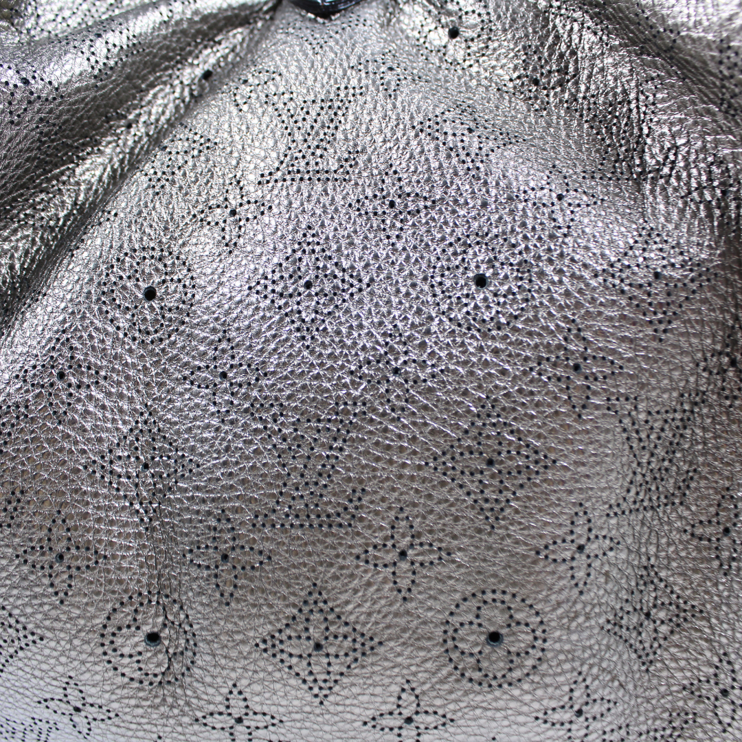 The LV Mahina XL Sable Top Handle Bag features a sleek design with silver mahina leather, adorned with the iconic LV logo throughout. The gun metal hardware and feet on the bottom of the bag provide durability and style. Easy access with it’s push clasp entry and a luxurious suede lined interior.