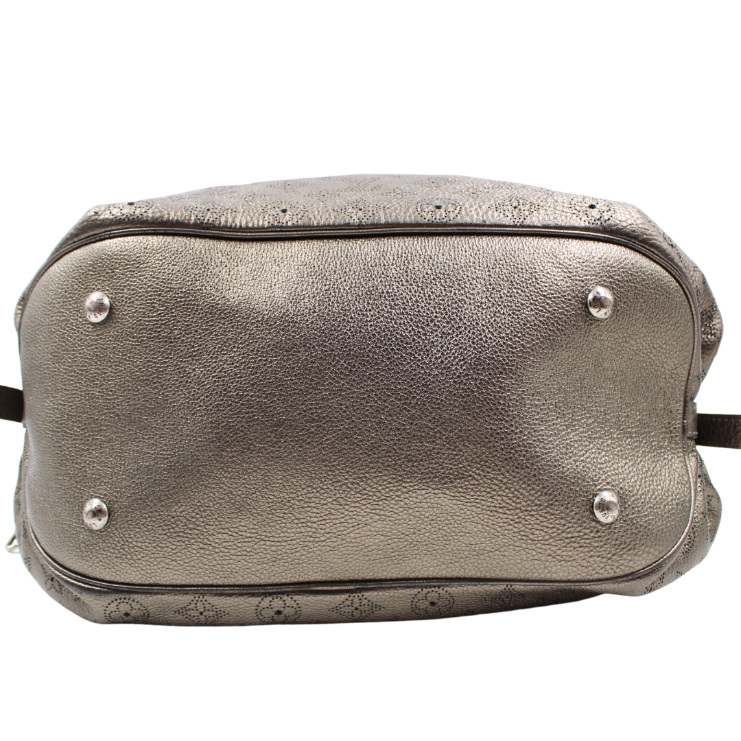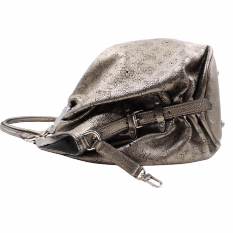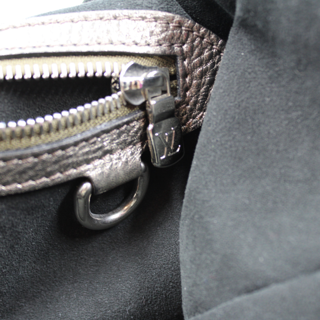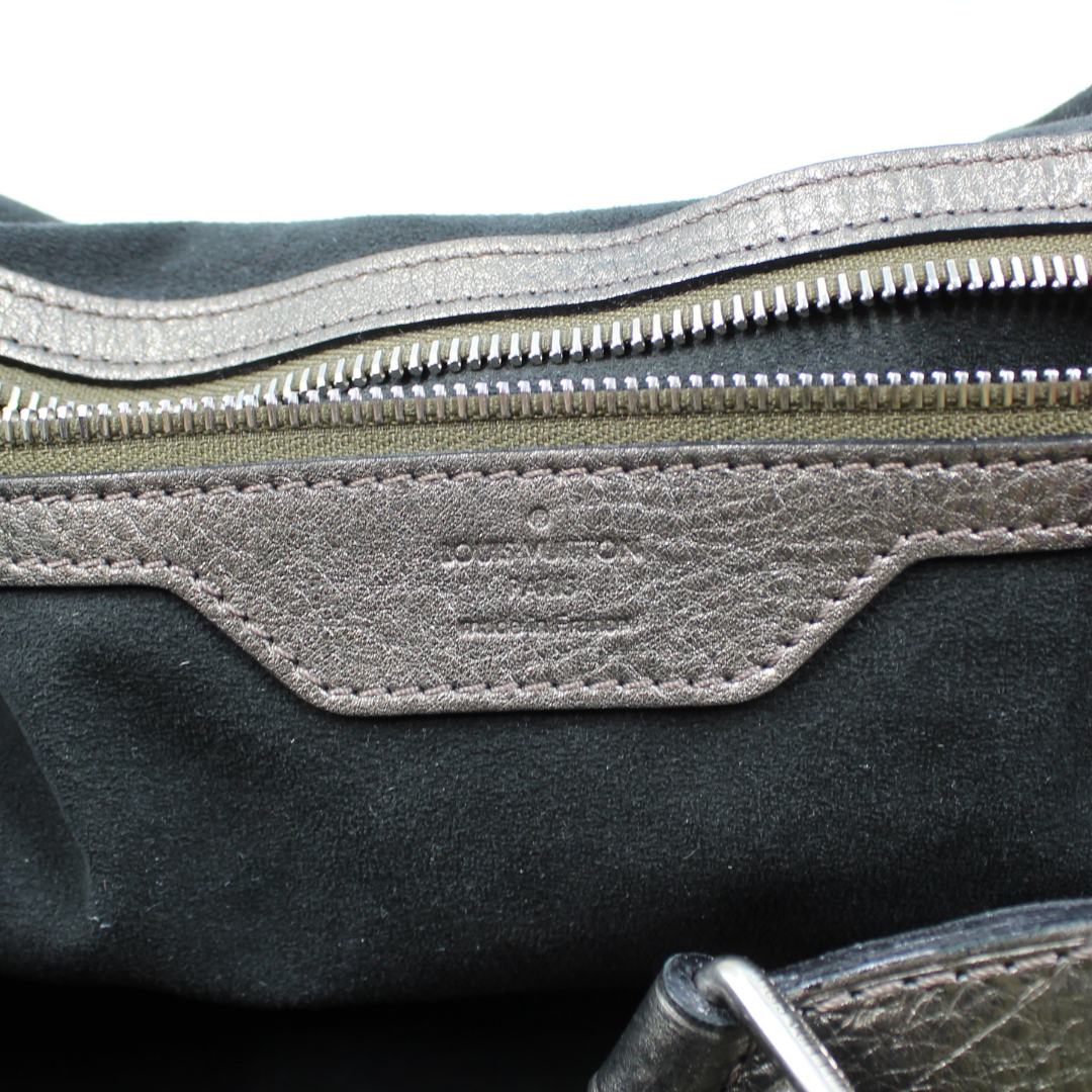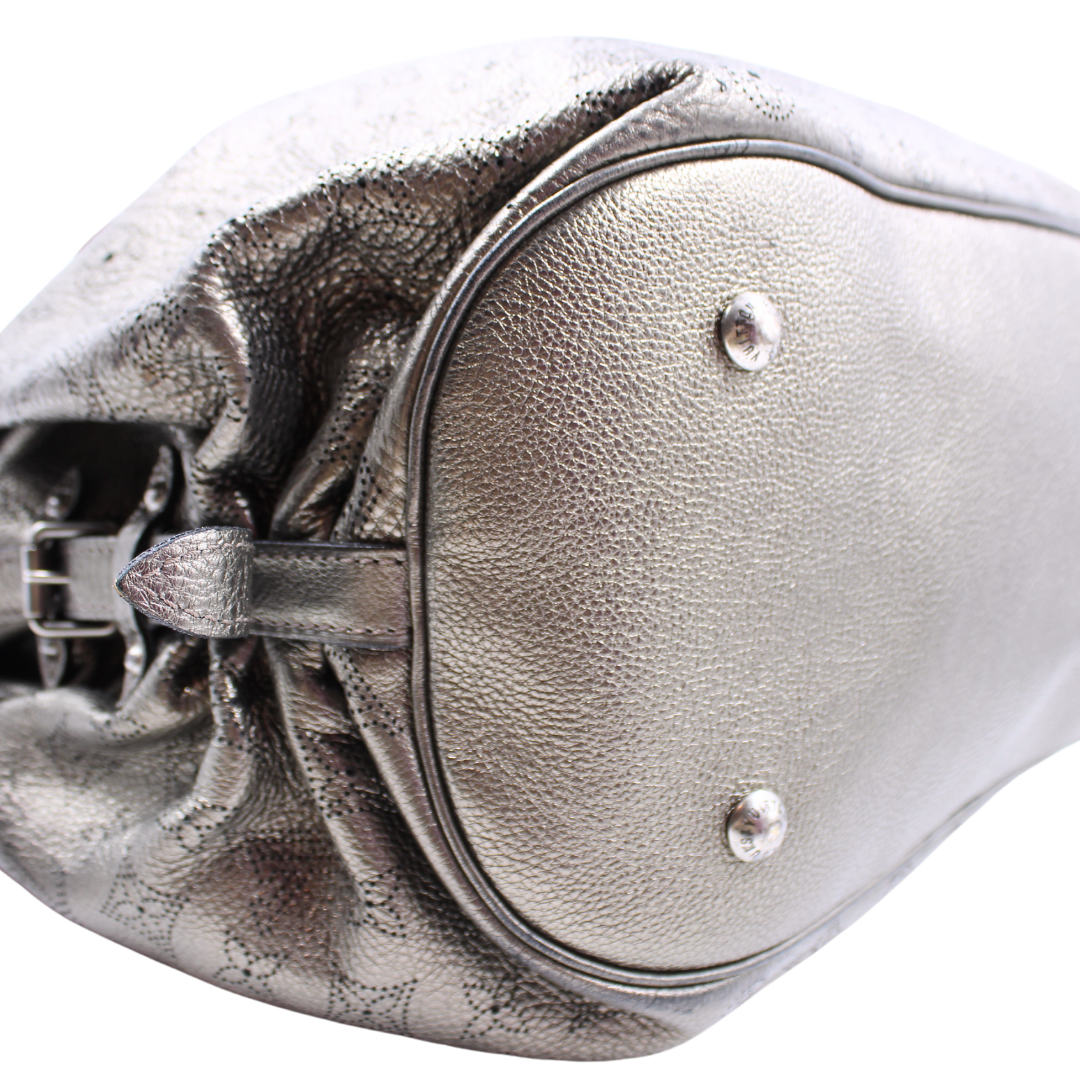 The LV Mahina XL Sable Top Handle Bag features a sleek design with silver mahina leather, adorned with the iconic LV logo throughout. The gun metal hardware and feet on the bottom of the bag provide durability and style. Easy access with it’s push clasp entry and a luxurious suede lined interior.