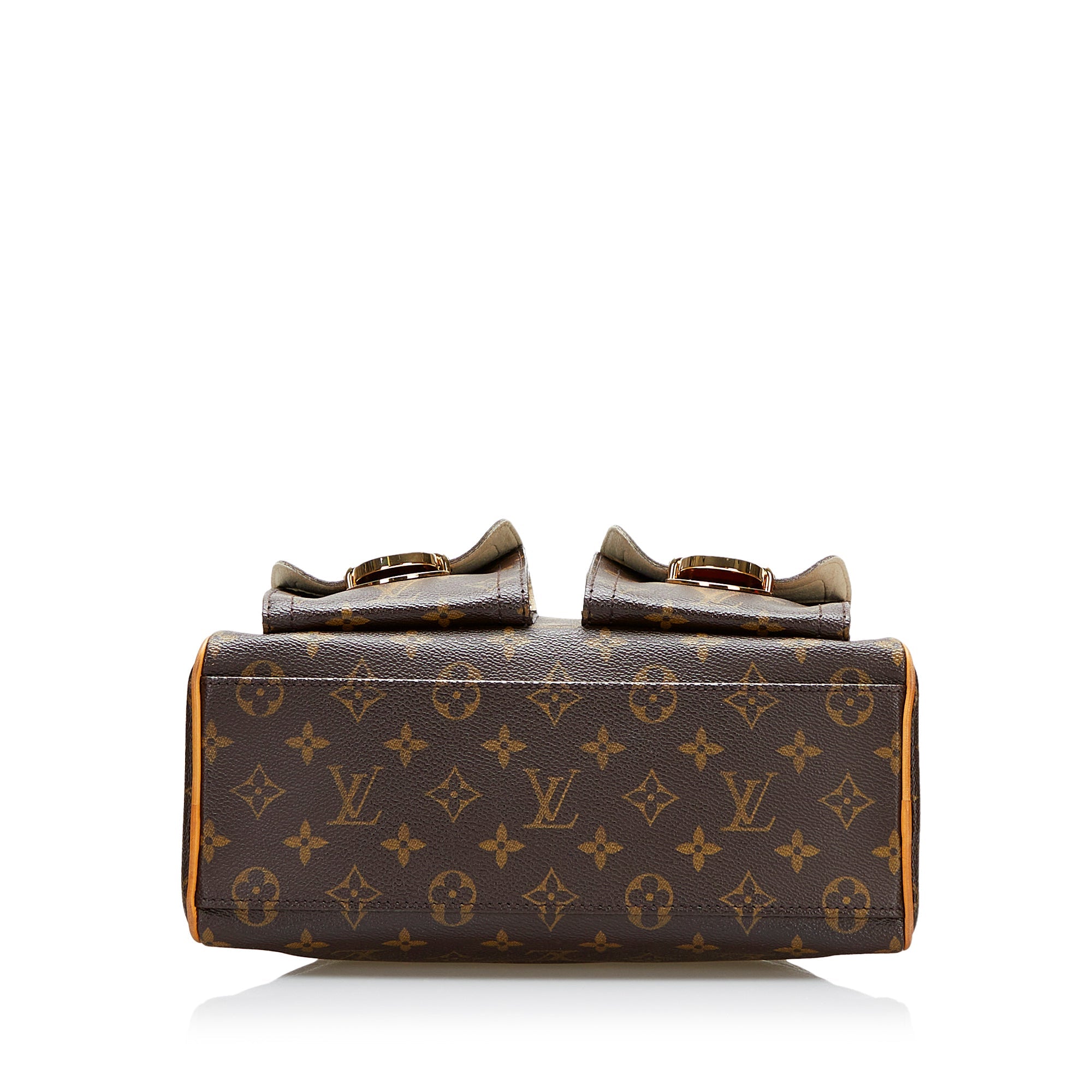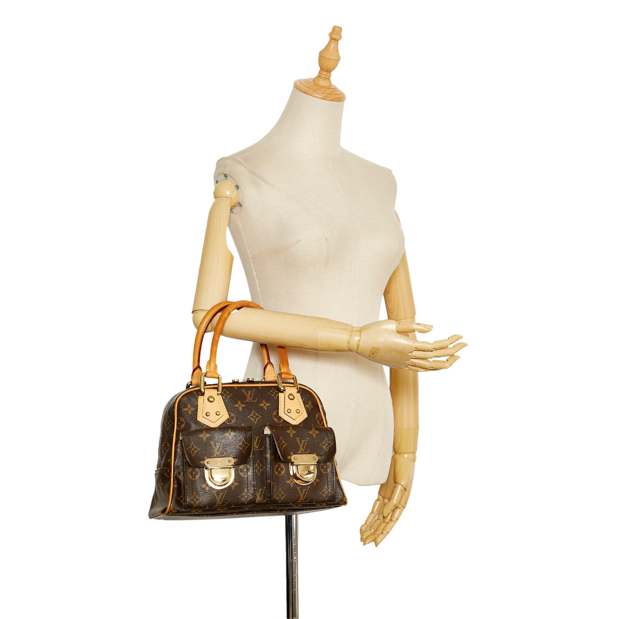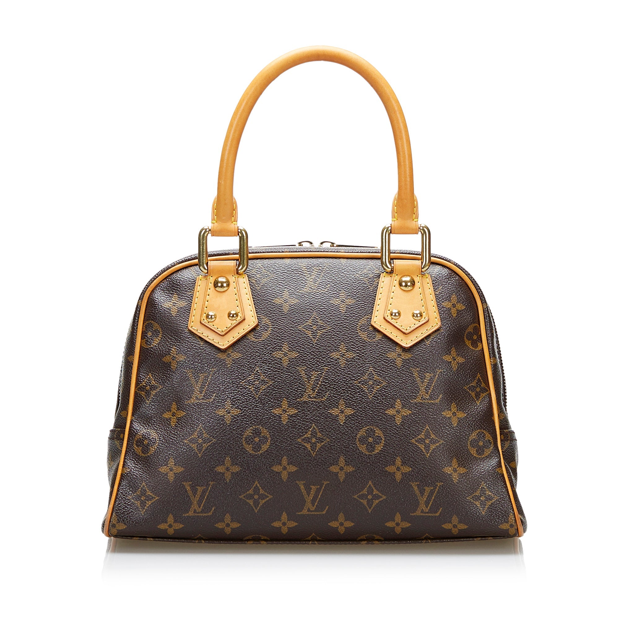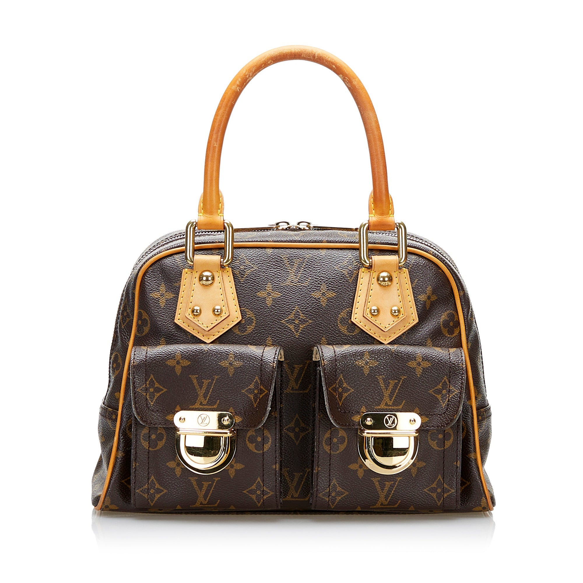 Welcome to New York! This charming LV Manhattan in the small PM version is made of Monogram canvas and features brown leather trim, gold details, rolled leather handles, top opening zipper, two front compartments with gold buckles and a slip pocket inside. the Bag is carried in the hand or in the arm.