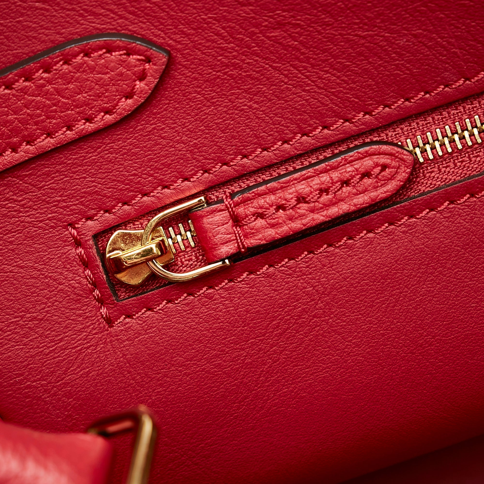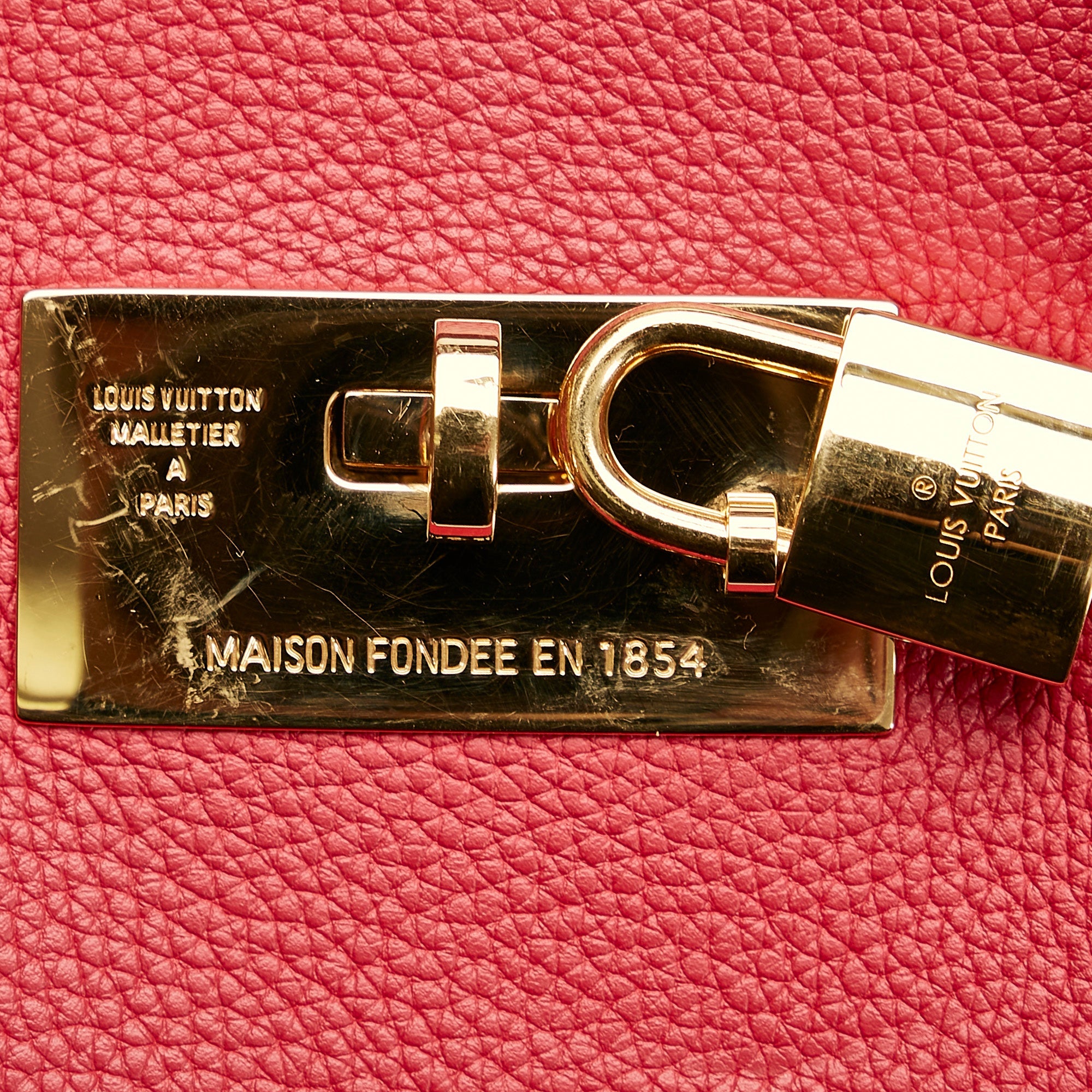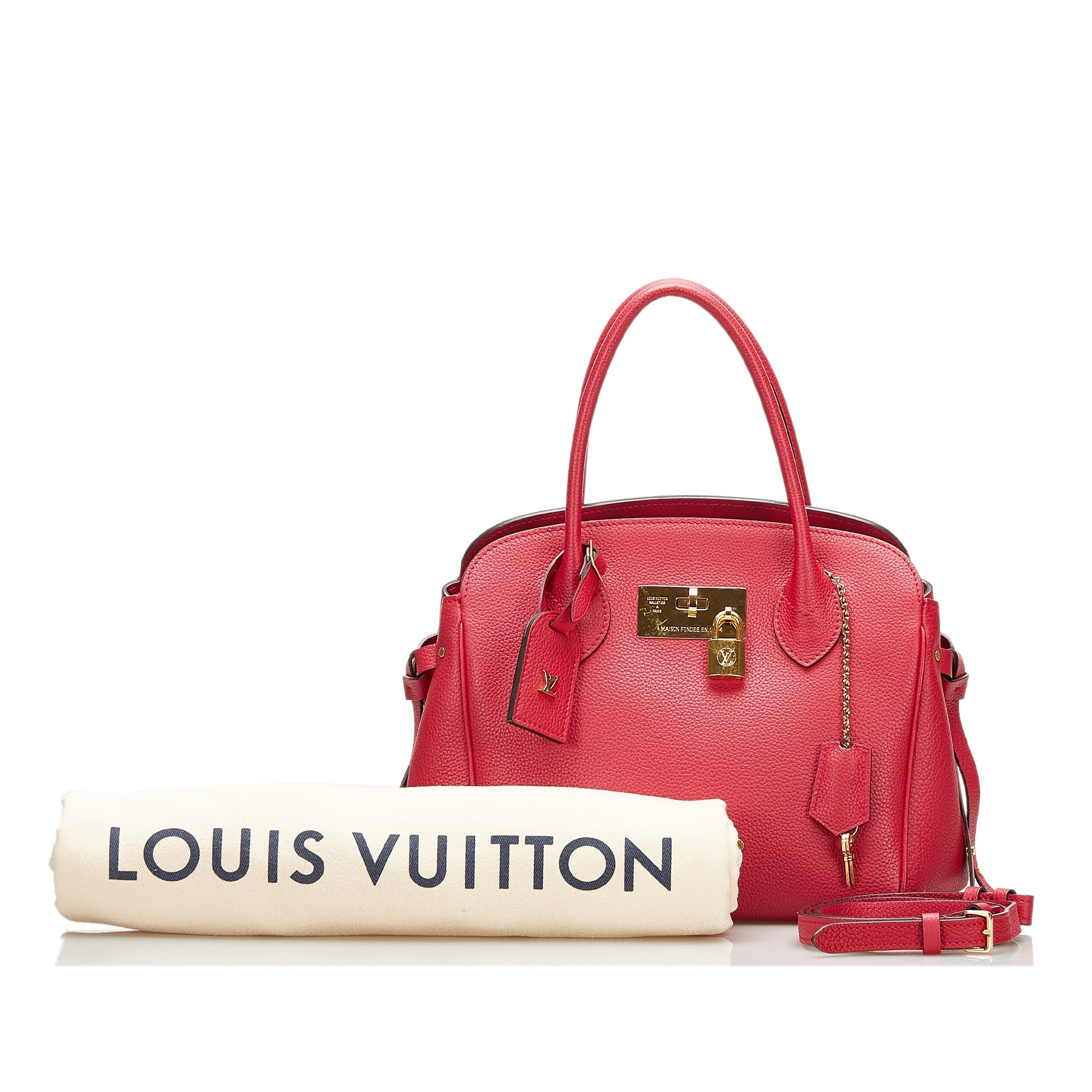 This LV Milla PM is made of red grained Veau Nuage leather. The Bag features gold detailing, rolled handles and an adjustable length leather shoulder strap, three interior pockets and a twist lock closure on the front. The closure can be further secured with a small padlock. The Bag is worn in hand and arm or loosely over the shoulder.