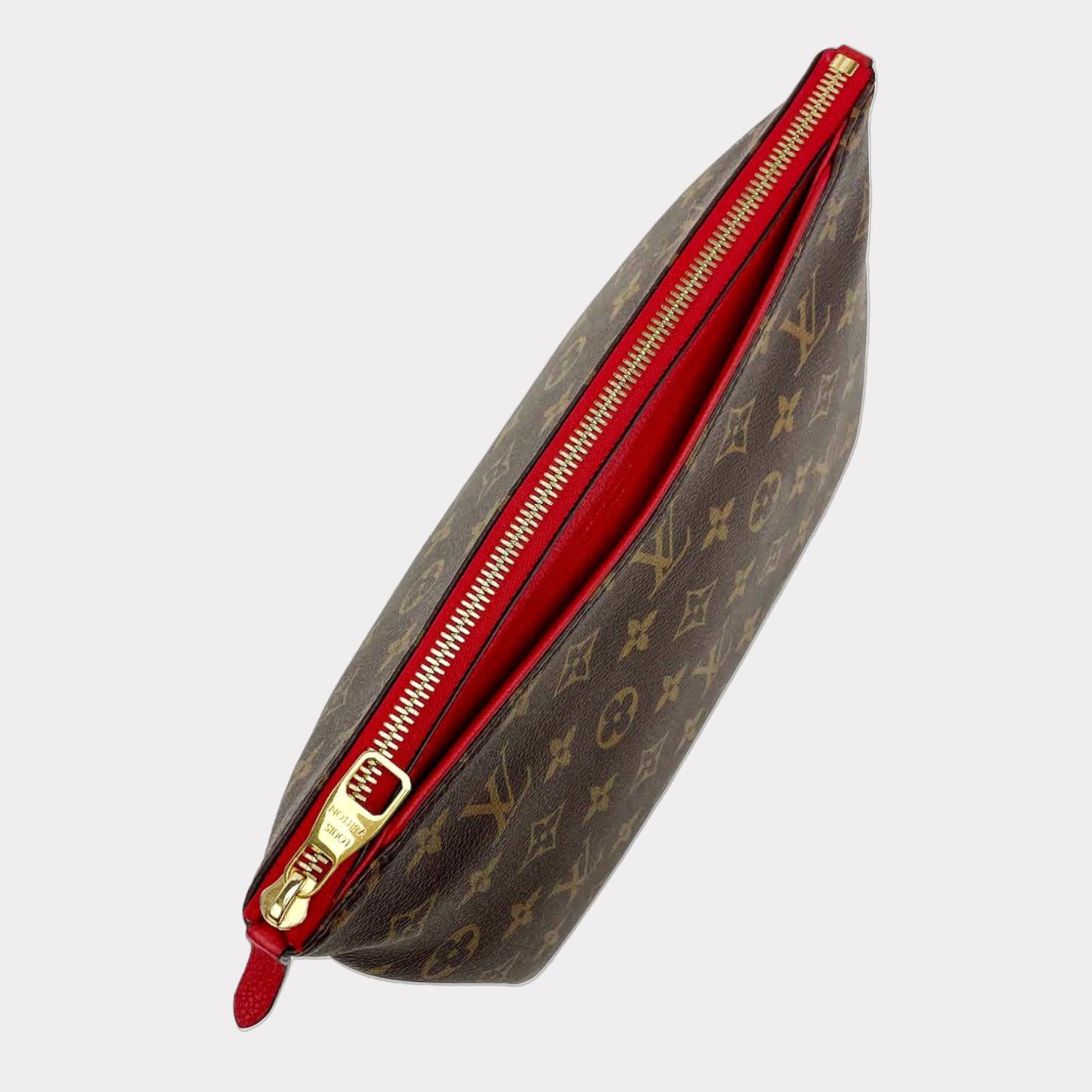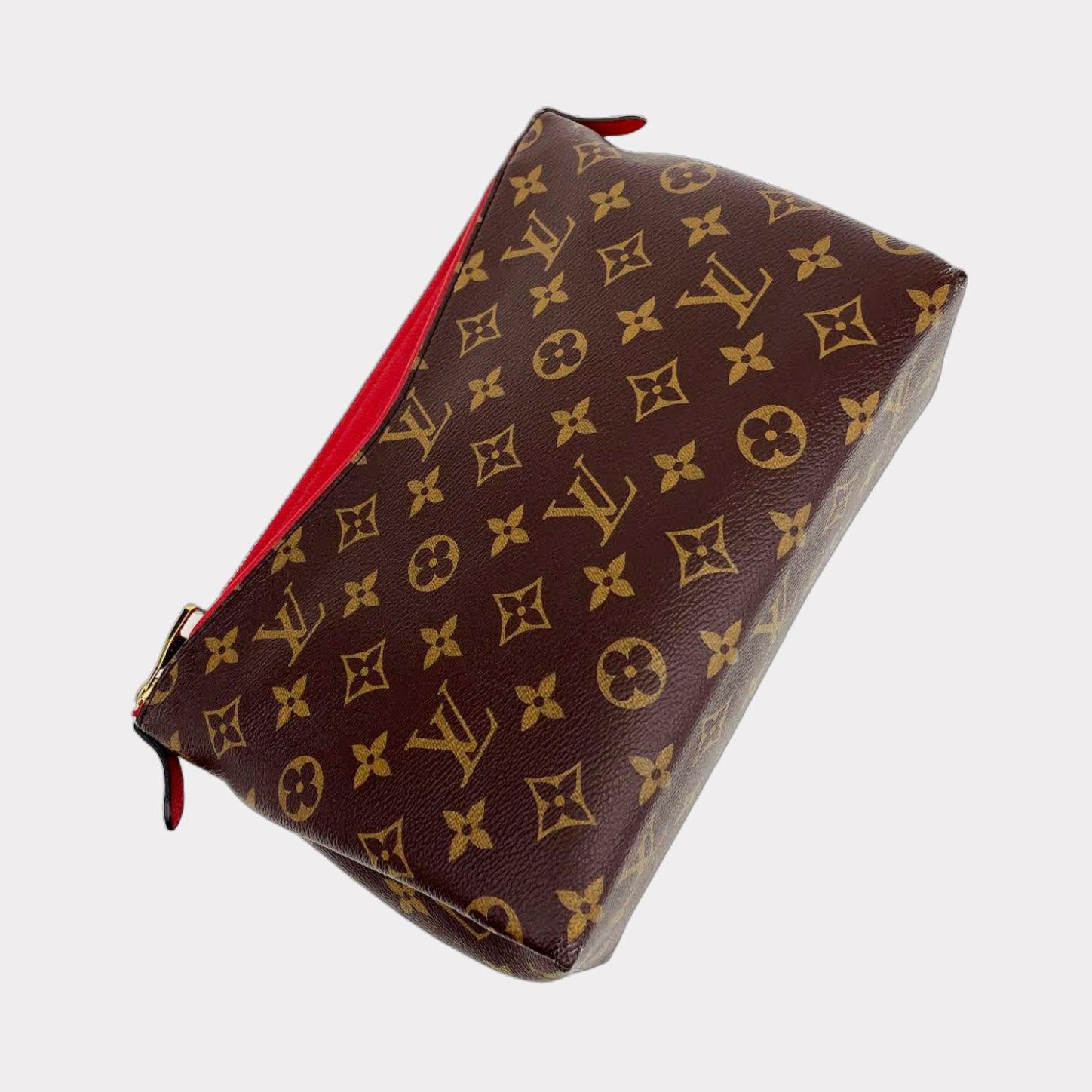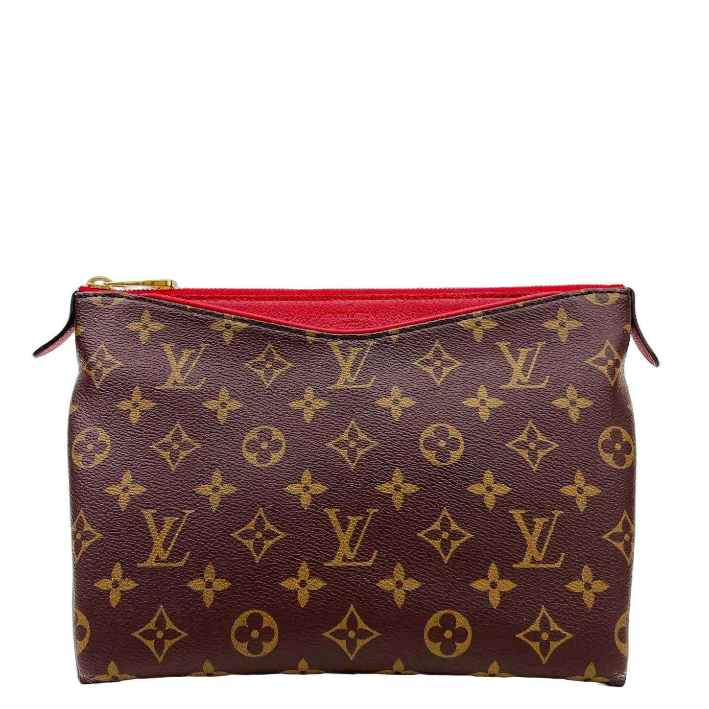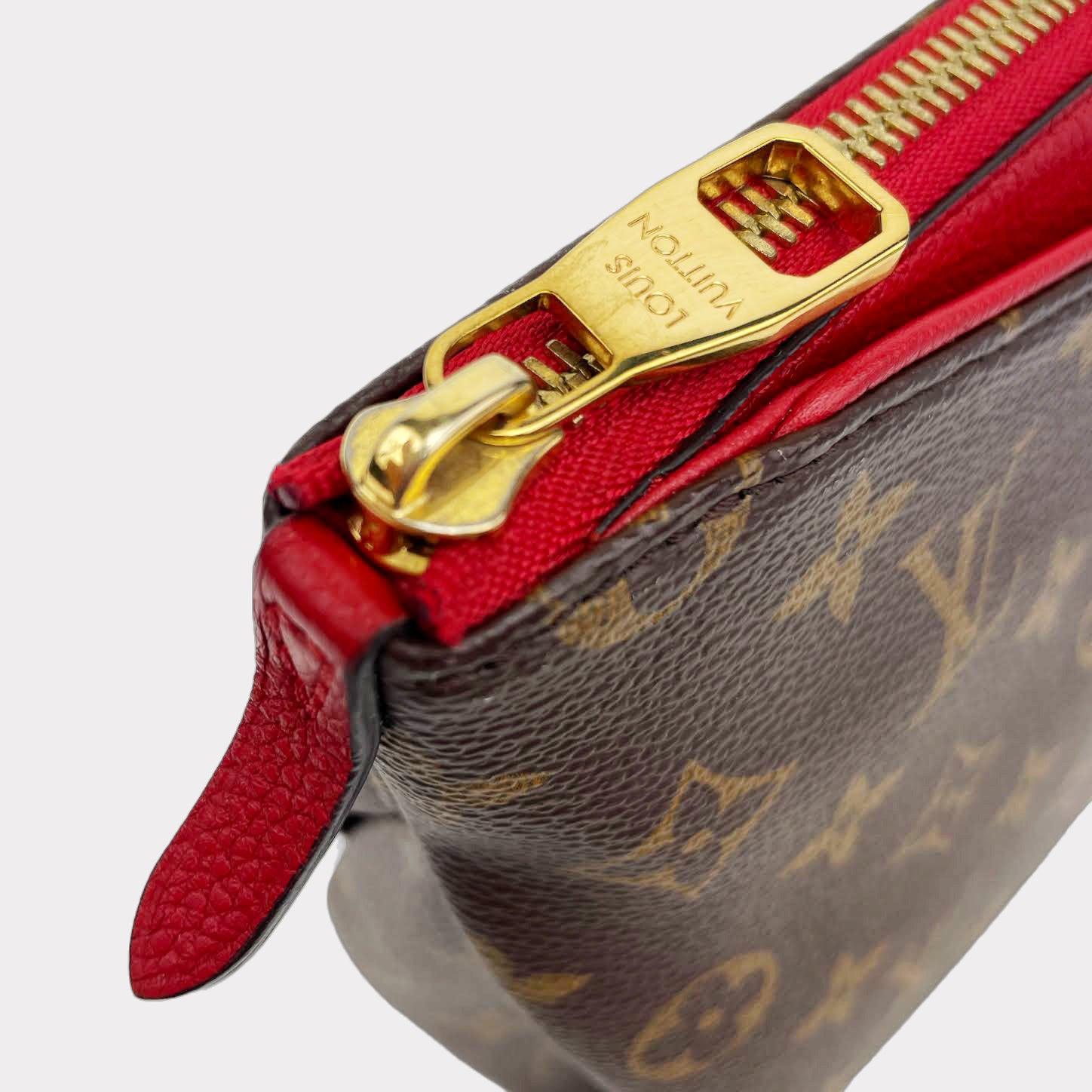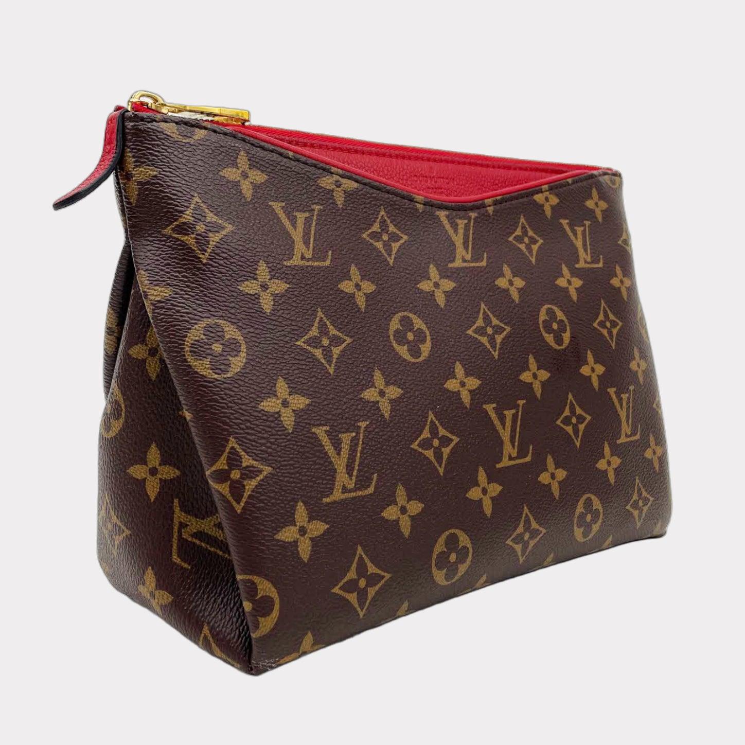 This cosmetic case is crafted of LV monogram on toile canvas, with red calfskin leather trim. The bag features a front pocket, and a brass top zipper that opens to a red leather interior with a zipper top closure.