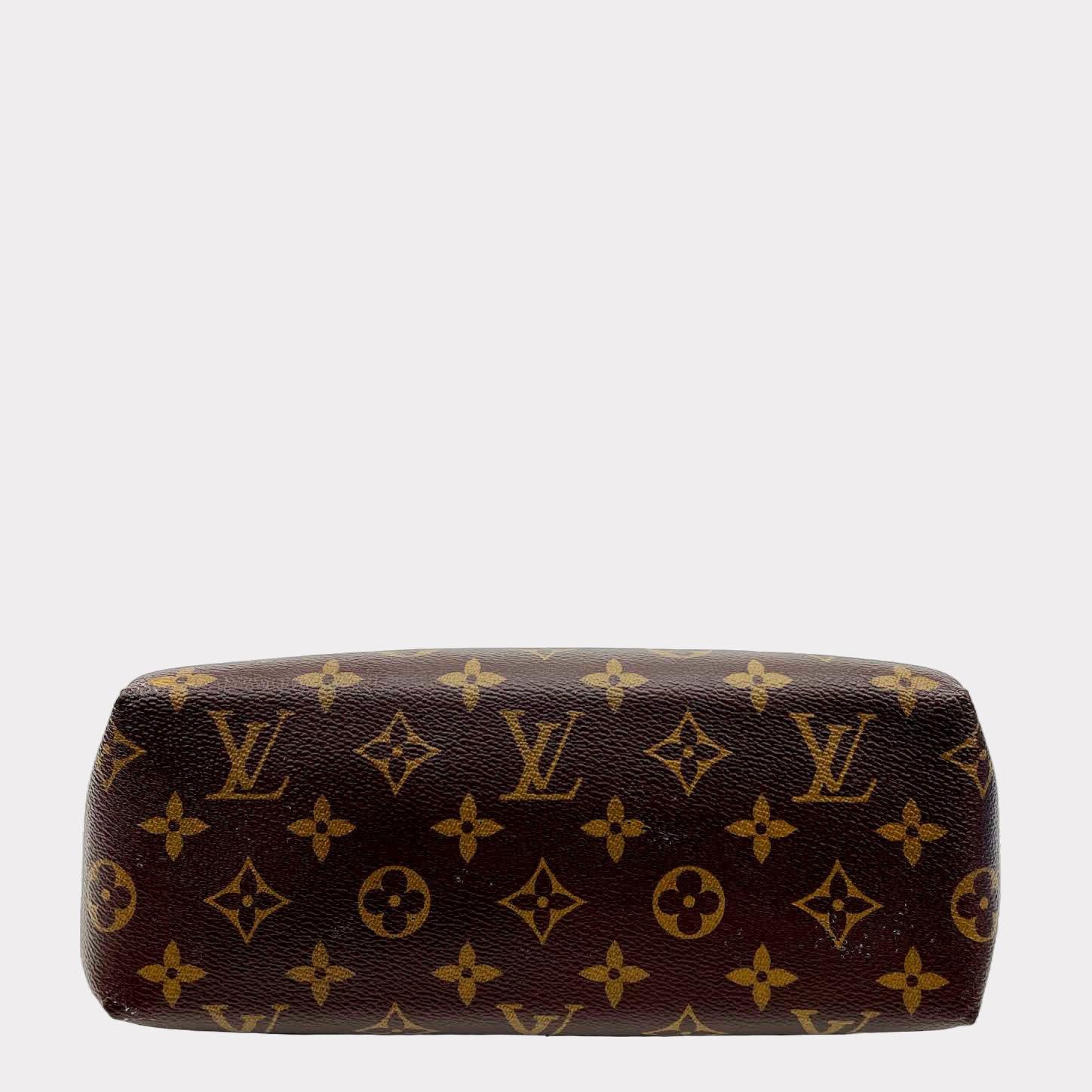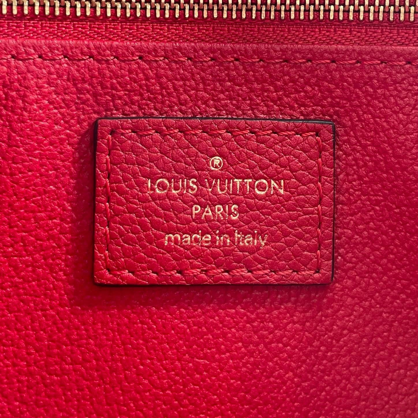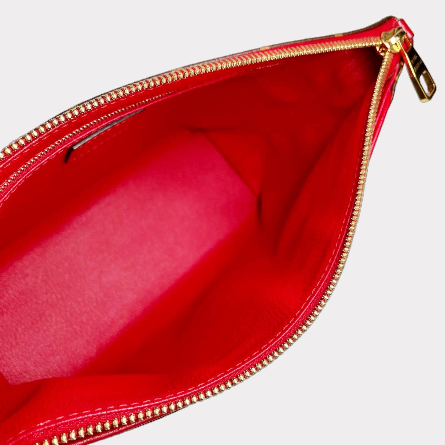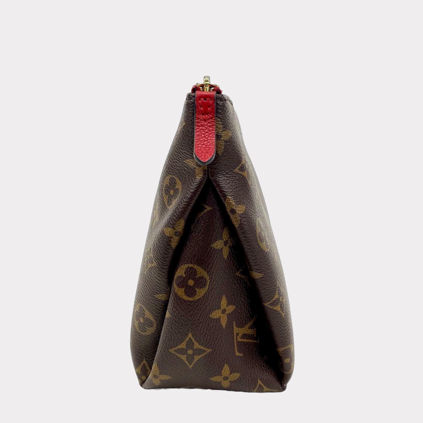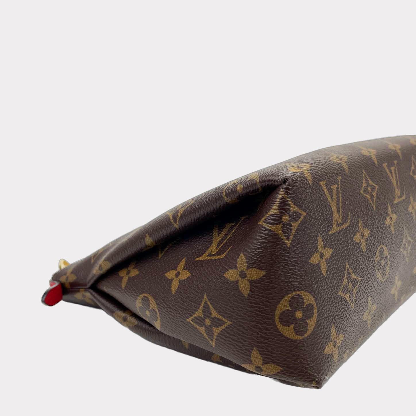 This cosmetic case is crafted of LV monogram on toile canvas, with red calfskin leather trim. The bag features a front pocket, and a brass top zipper that opens to a red leather interior with a zipper top closure.