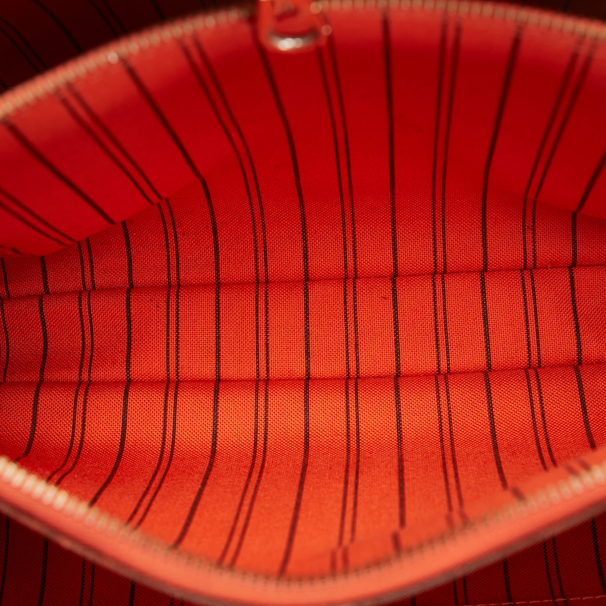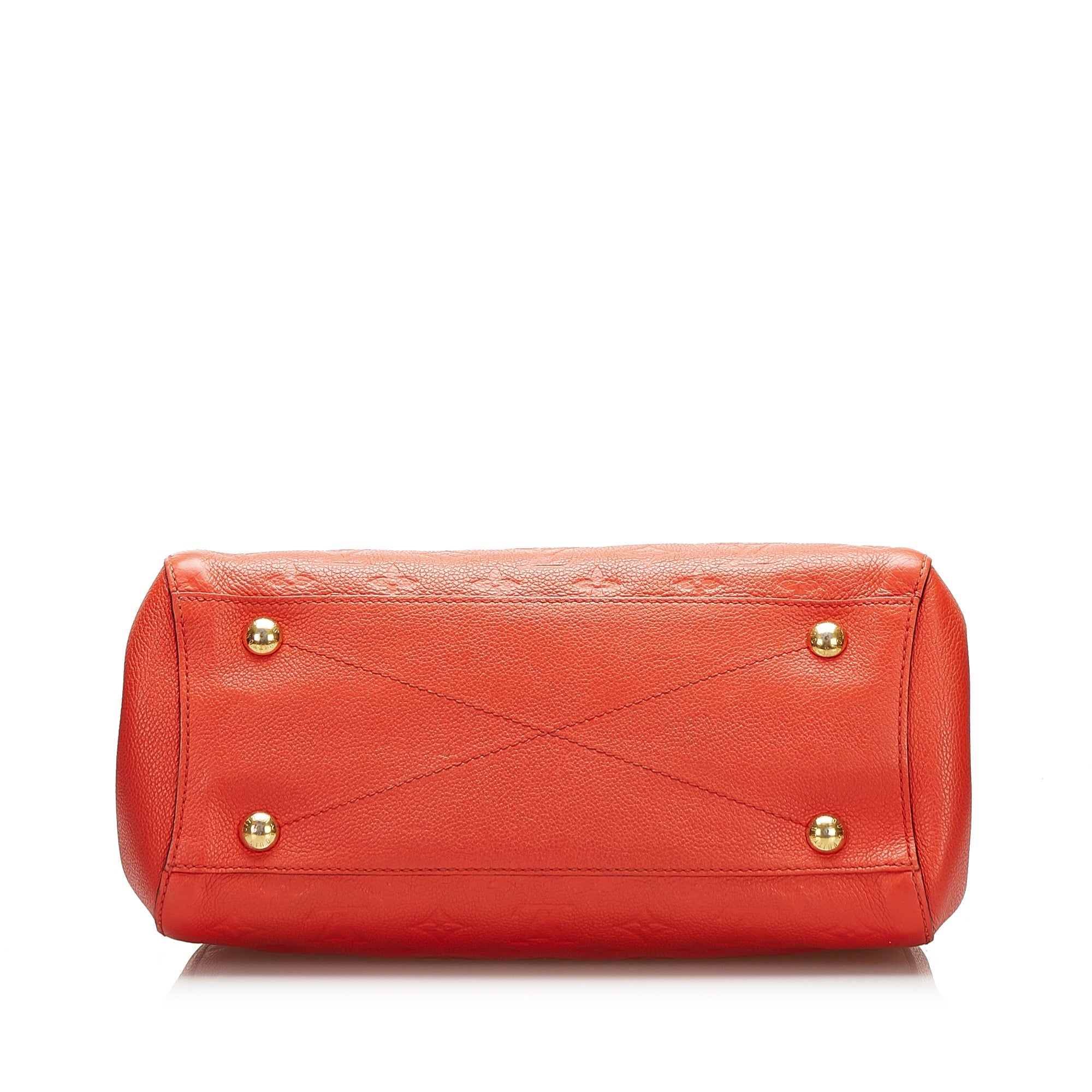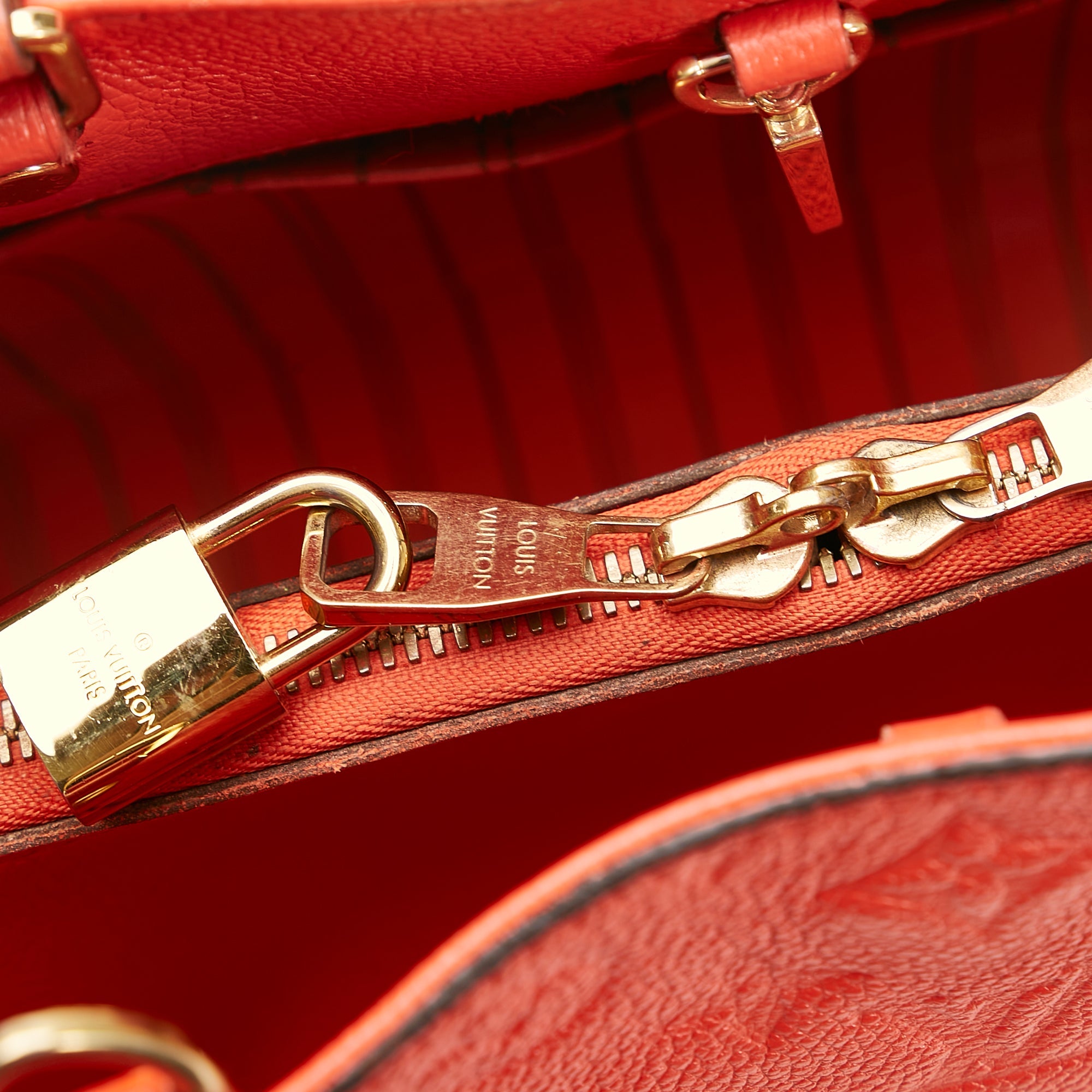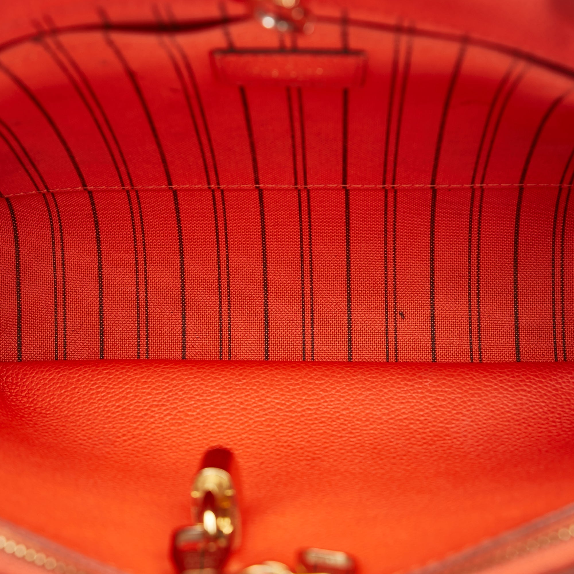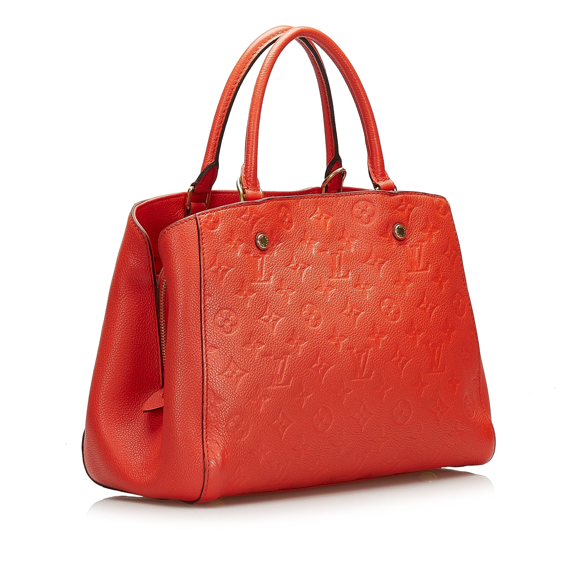Die LV Montaigne Handtasche wurde nach einer prachtvollen Einkaufsstrasse in Paris benannt. Dieses Modell wurde aus luxuriösem Rindsleder in Orange gefertigt und wird mit goldener Hardware ergänzt. Leicht eingefallene Seiten und ein schmalere Oberseite verleihen der Tasche eine souveräne Eleganz. Das Innenleben ist mit gestreiftem Textilfutter ausgekleidet und präsentiert sich äusserst vielfältig. Es verfügt über ein mittleres Reissverschlussfach, ein grösseres offenes Fach und 2 kleinere offene Fächer. Die Tasche ist mit zwei Griffen an der Oberseite sowie einem abnehmbaren Schulterriemen versehen, wodurch sie unterschiedliche Tragemöglichkeiten bietet und perfekt für den Alltag geeignet ist.