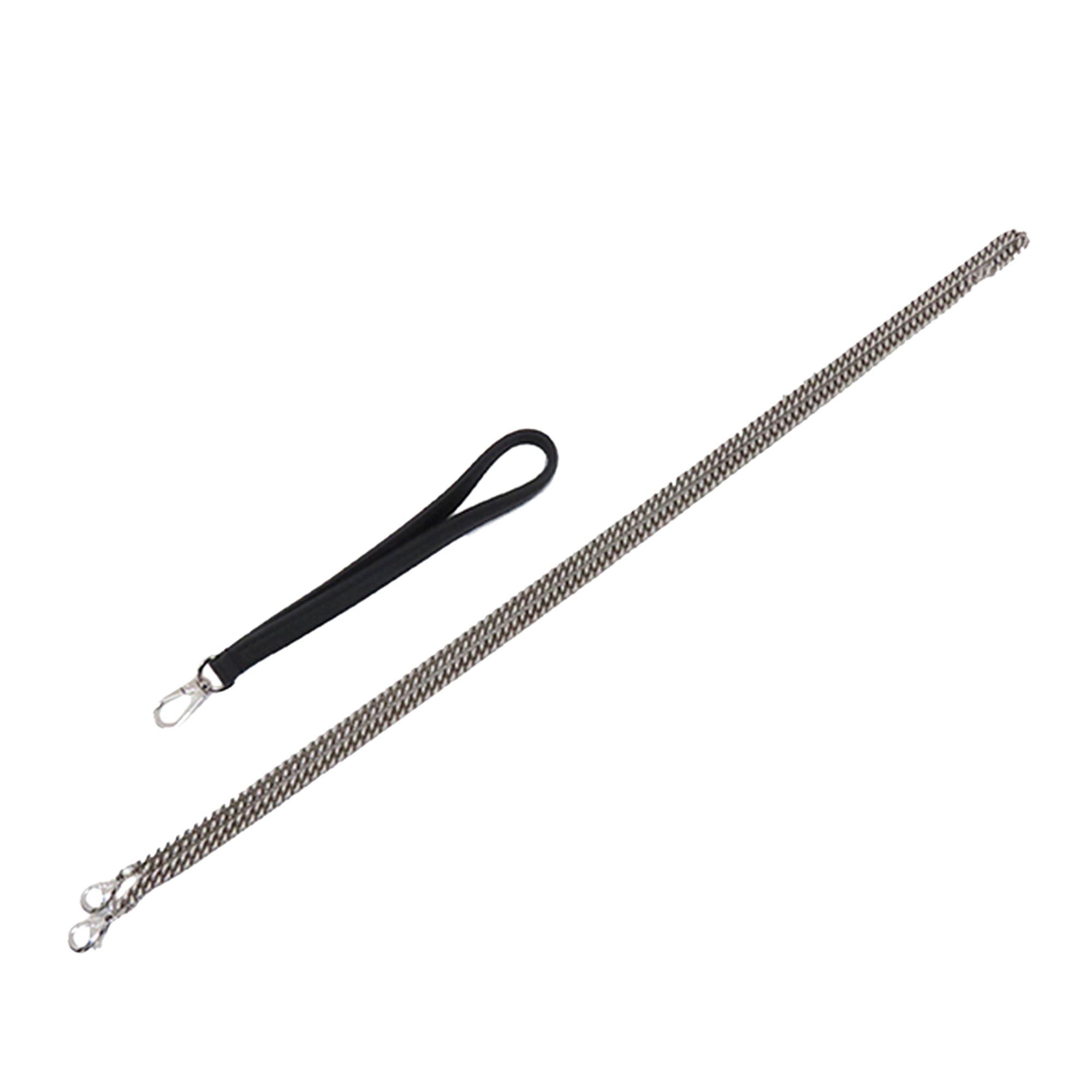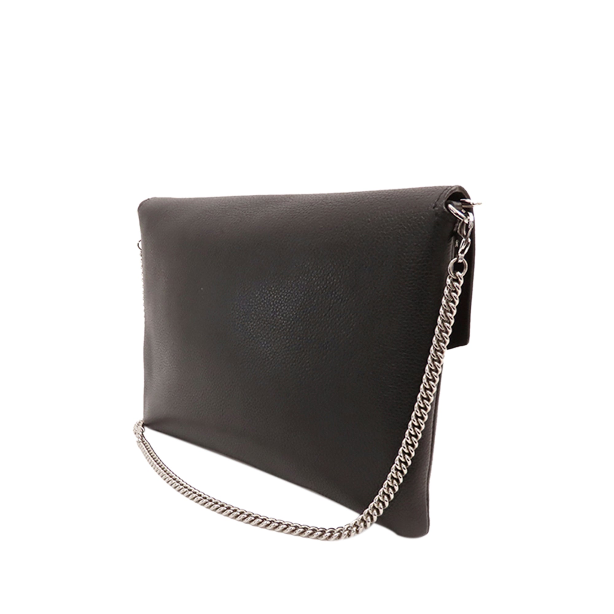 The MyLockMe Pochette is made of black leather, has a detachable silver-tone chain shoulder strap, a detachable flat leather wrist strap, a front flap with twist closure, an exterior slip pocket on the front, and zippered and slip pockets on the interior.