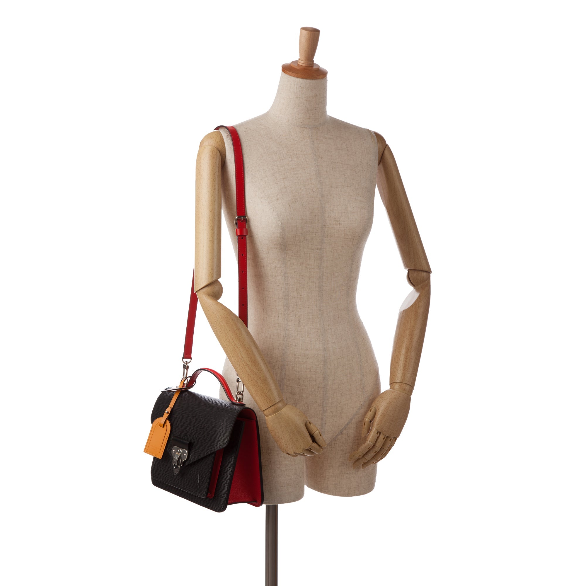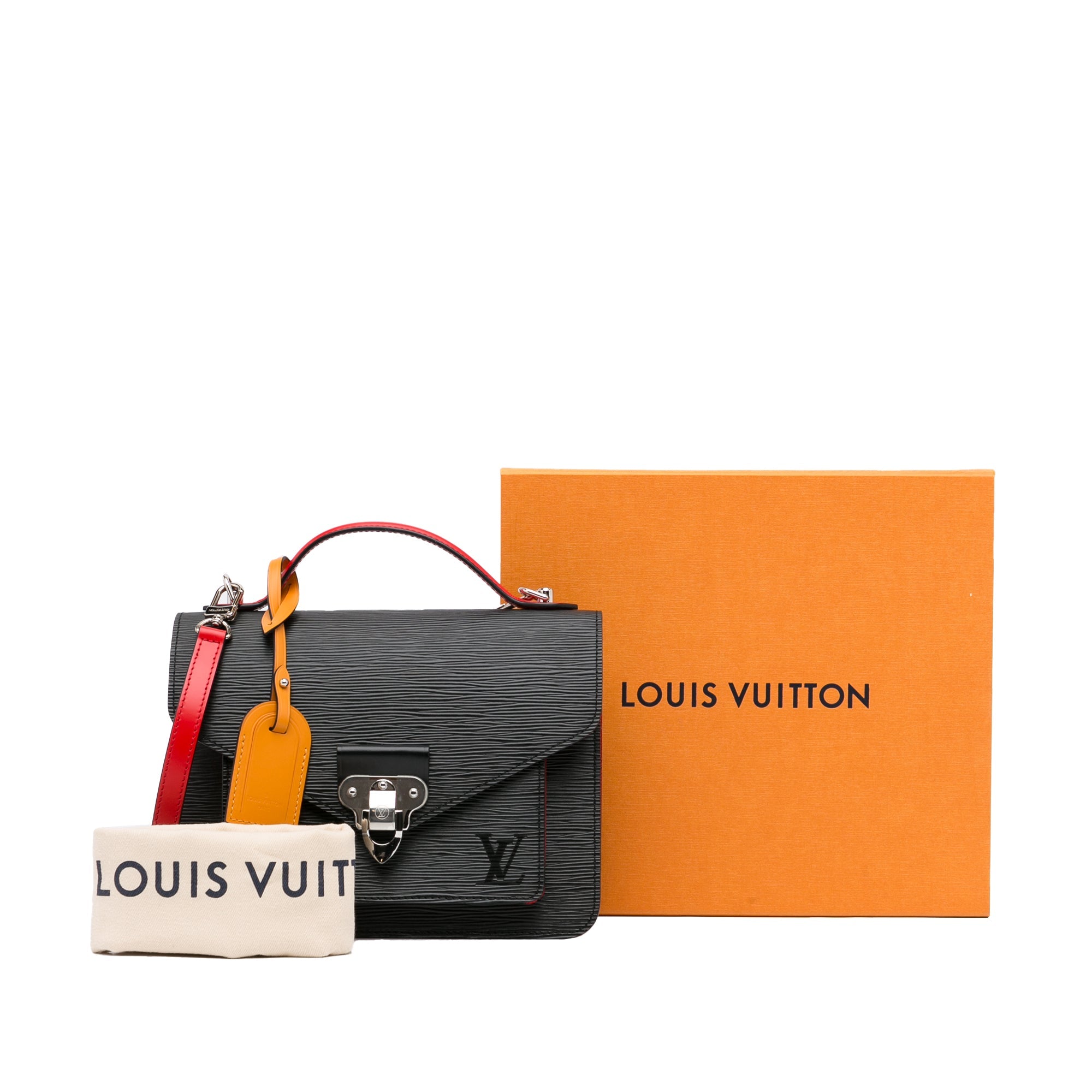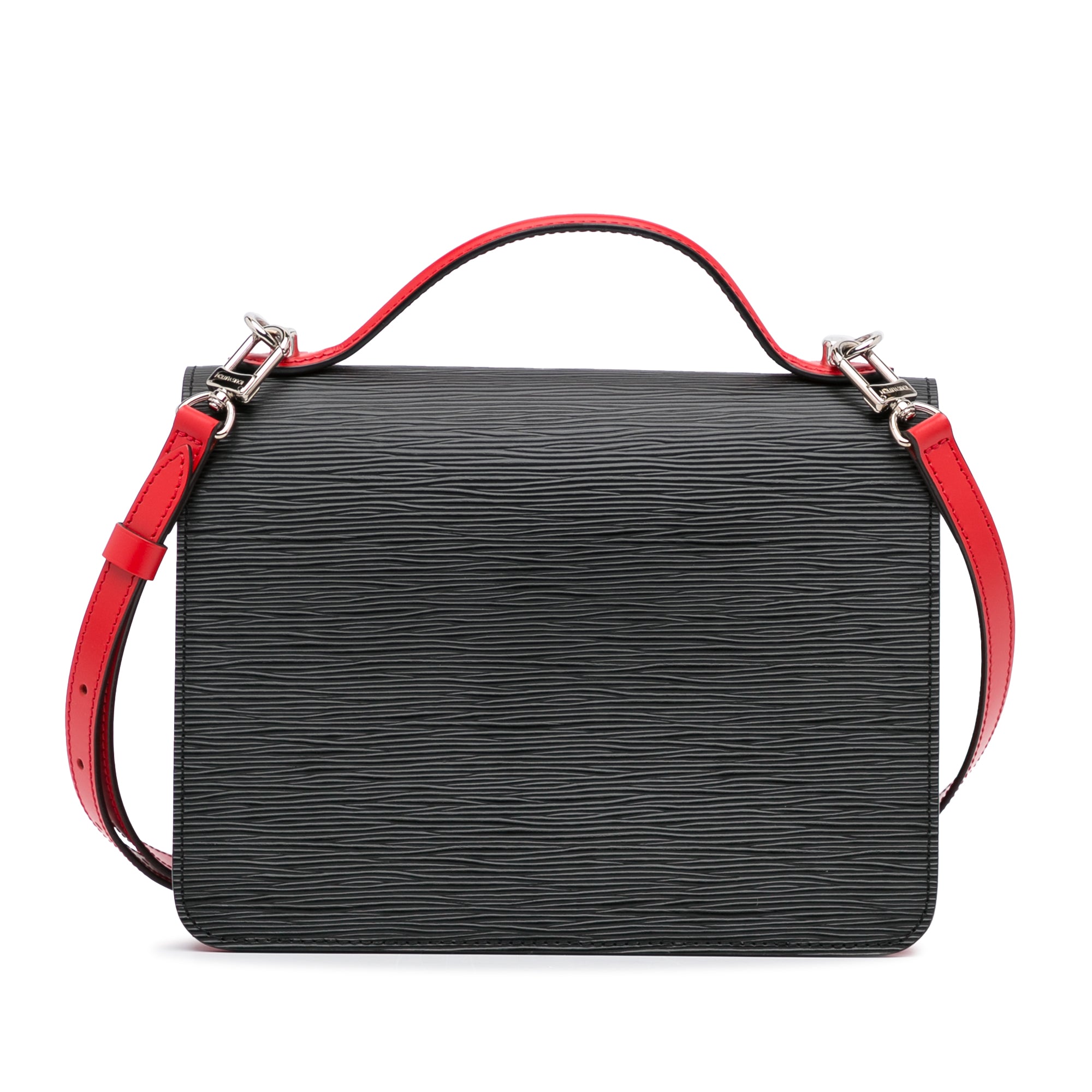 This beautiful LV Monceau is made of black epi leather with red leather trim. The Bag has silver-tone details and a silver-tone snap on the front flap, a flat leather handle on the top and a slip pocket on the inside. It also has a detachable shoulder strap. The Bag can be worn over the shoulder or over the arm.