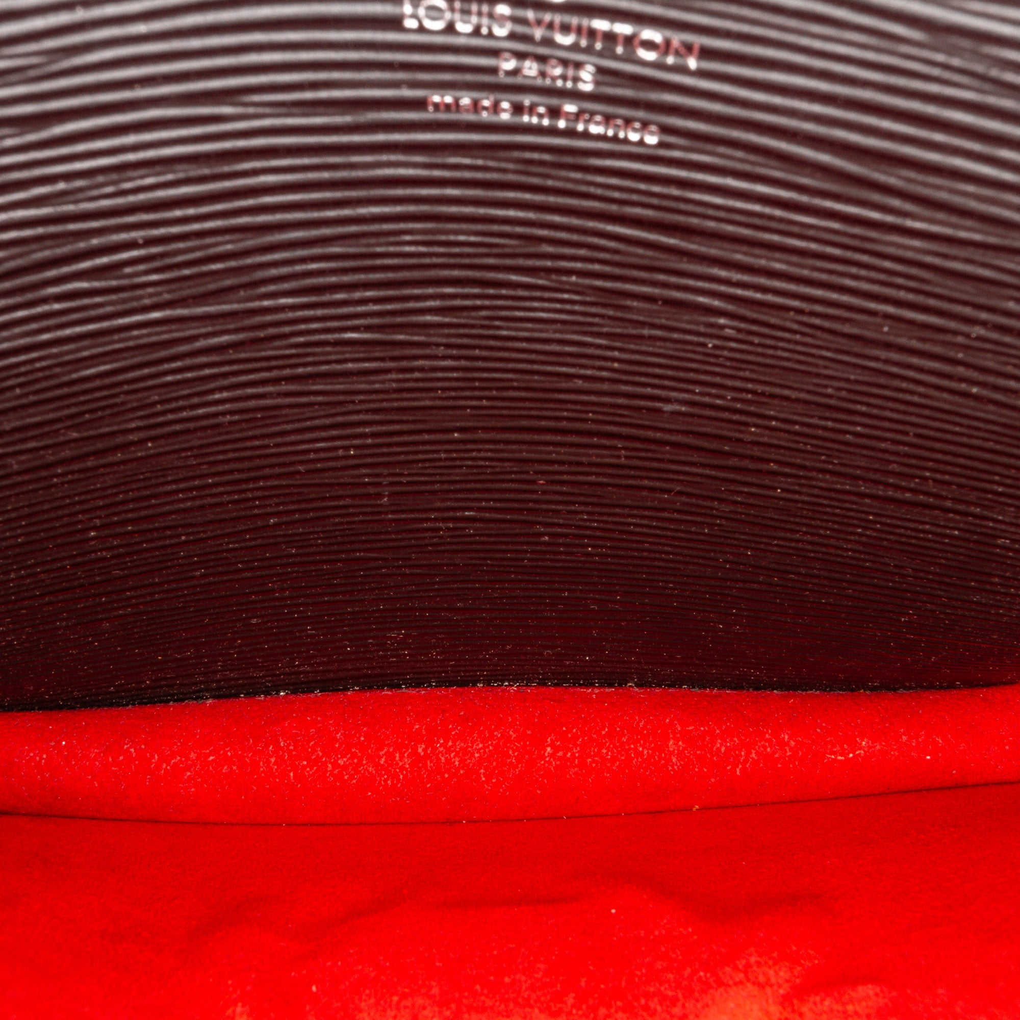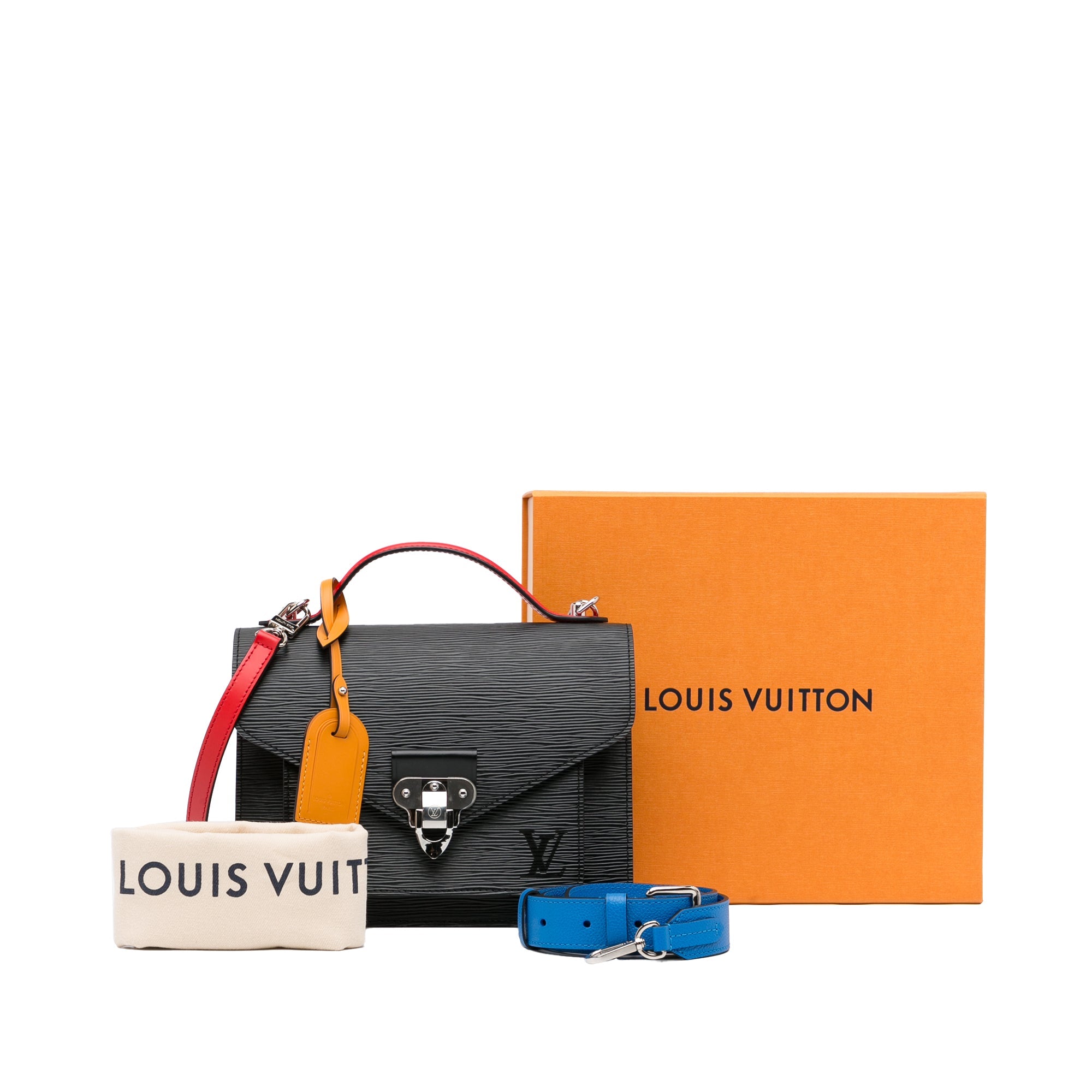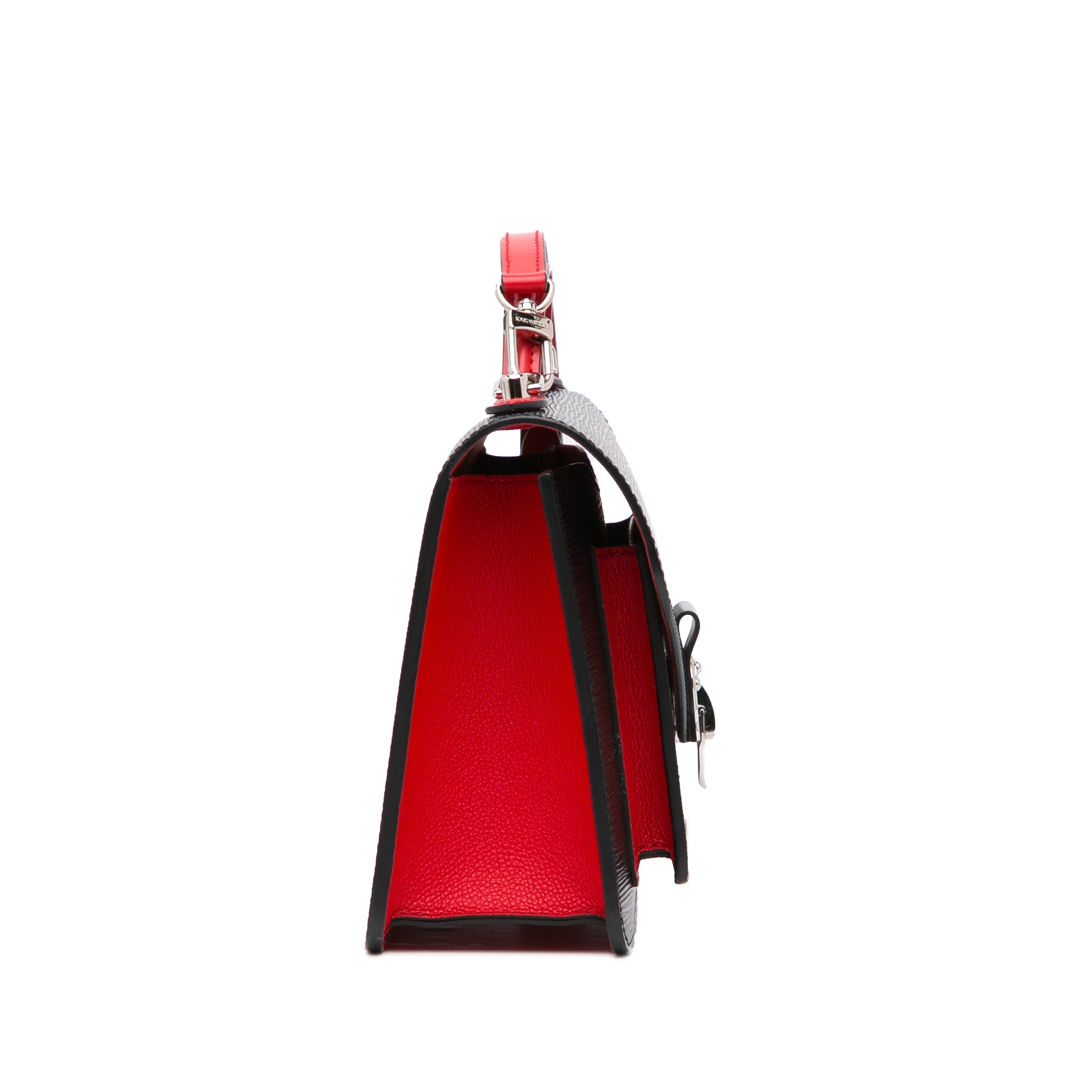 This beautiful LV Monceau is made of black epi leather with red leather trim. The Bag has silver-tone details and a silver-tone snap on the front flap, a flat leather handle on the top and a slip pocket on the inside. It also has a detachable shoulder strap. The Bag can be worn over the shoulder or over the arm.