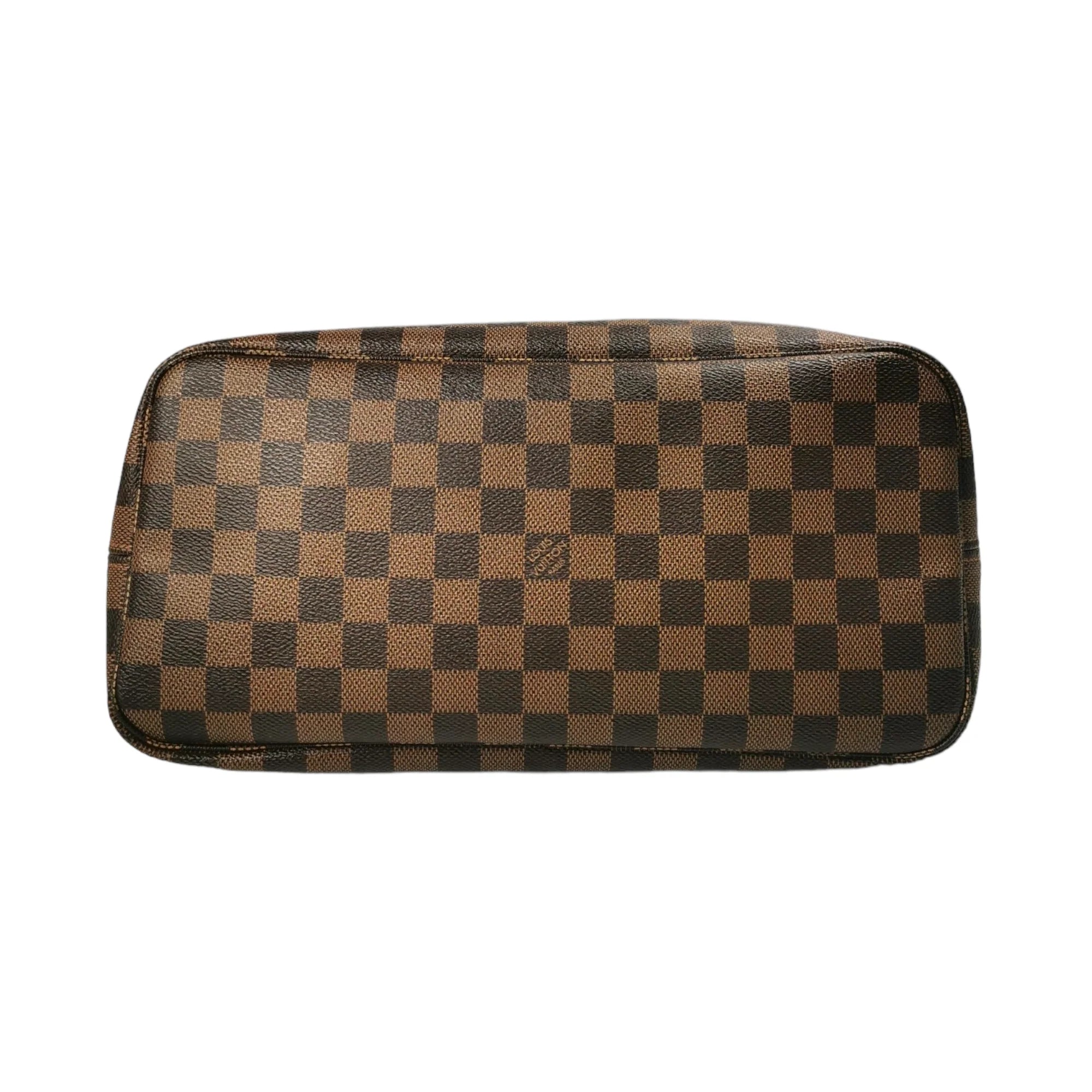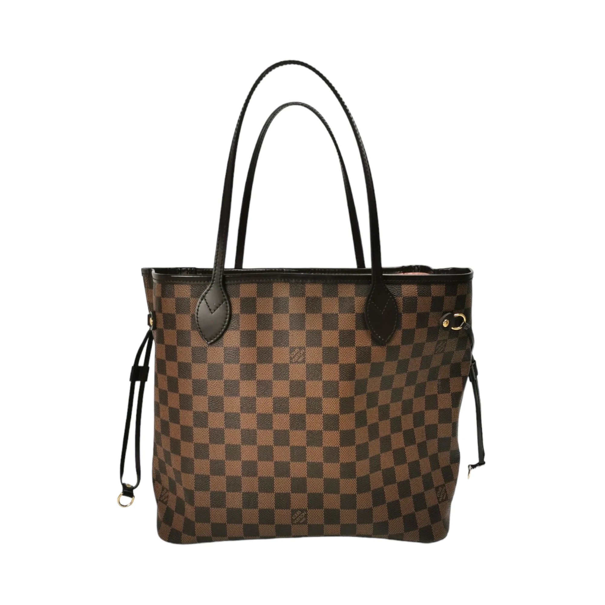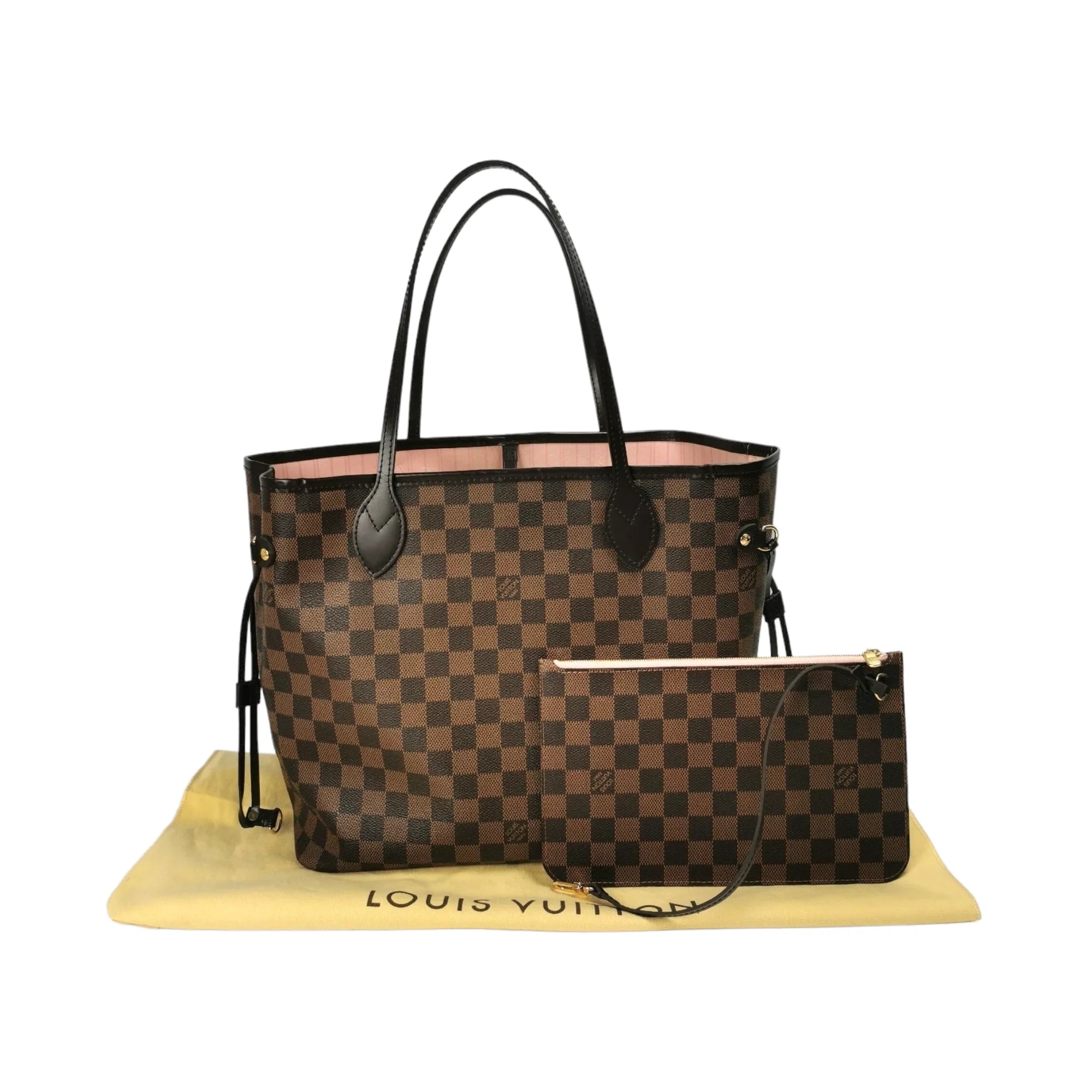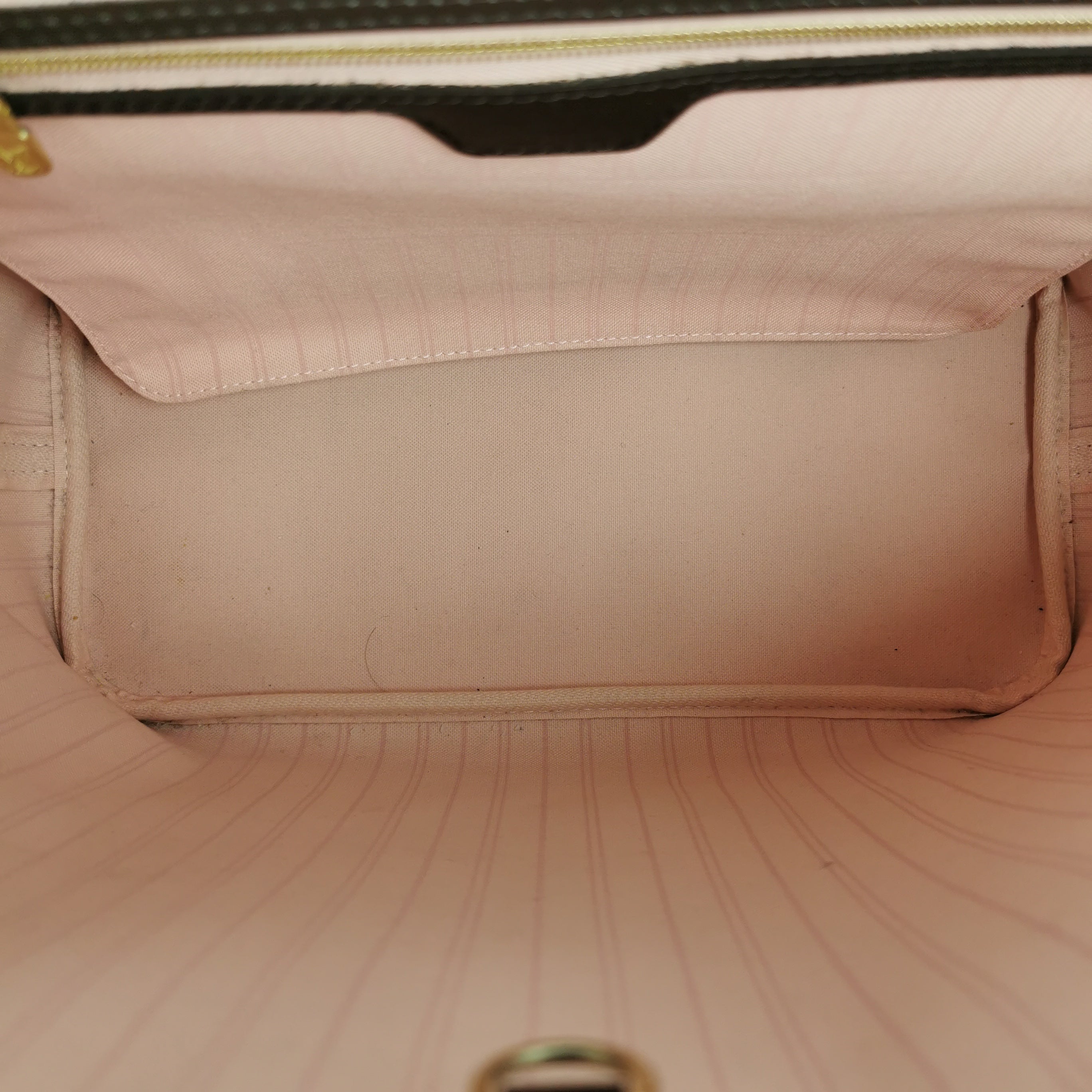 This super beautiful LV Neverfull MM tote bag is made of the famous Damier Ebene Canvas. The main access has a gold-tone buckle closure. Inside this spacious Bag is a zippered compartment embedded in the pink striped lining. With the double straps, the Bag comfortably worn over the shoulder. Probably one of the most popular bags ever, not without reason.