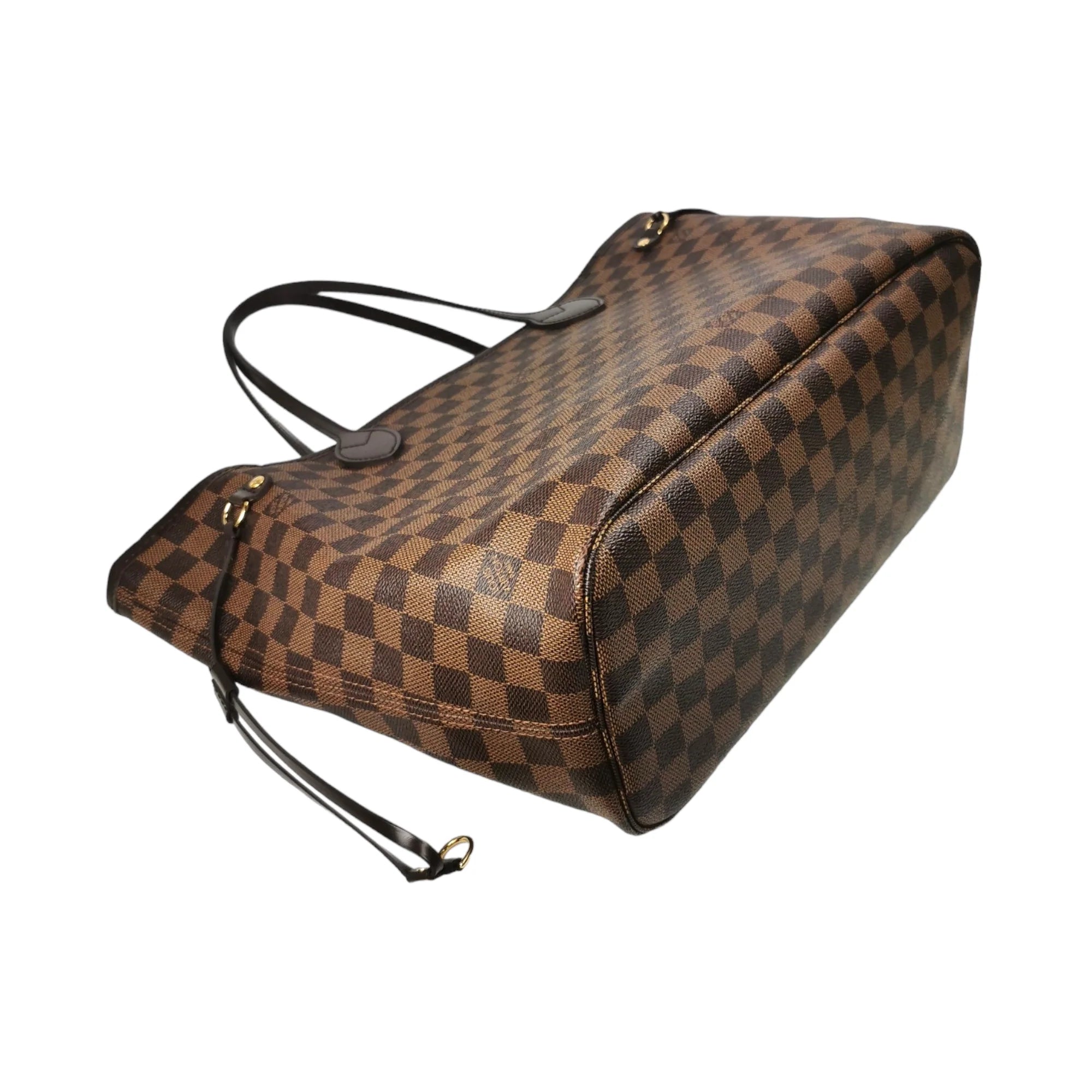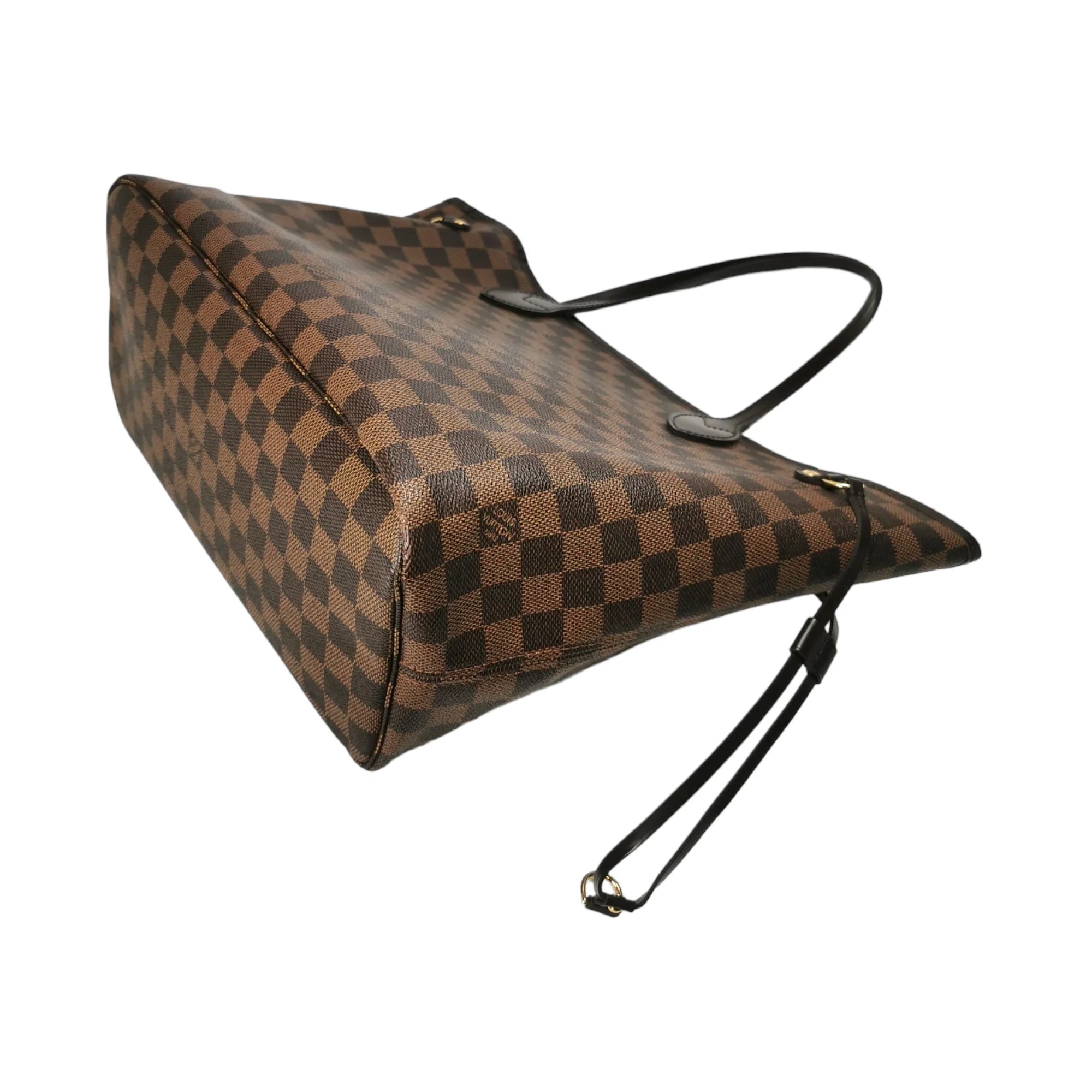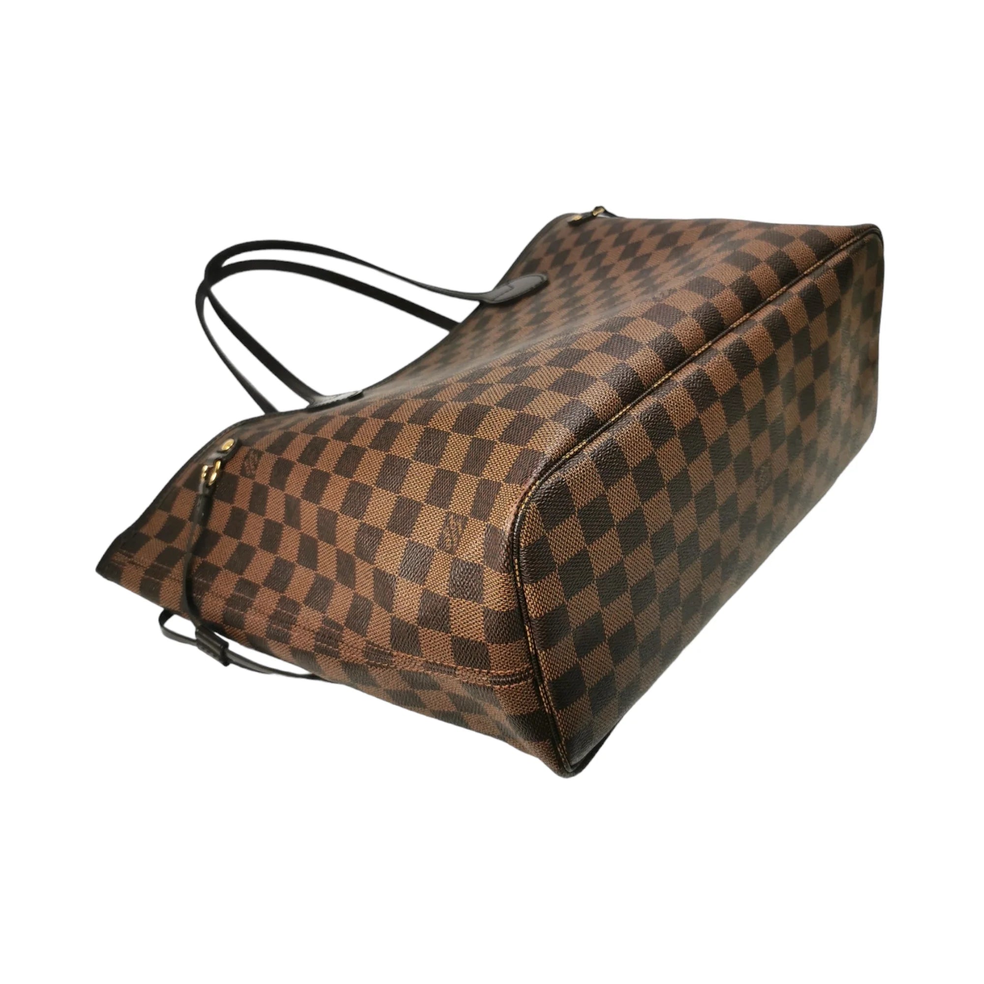 This super beautiful LV Neverfull MM tote bag is made of the famous Damier Ebene Canvas. The main access has a gold-tone buckle closure. Inside this spacious Bag is a zippered compartment embedded in the pink striped lining. With the double straps, the Bag comfortably worn over the shoulder. Probably one of the most popular bags ever, not without reason.