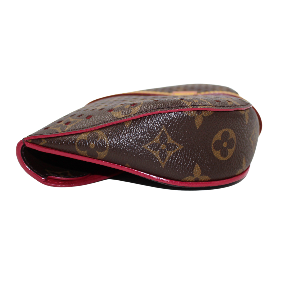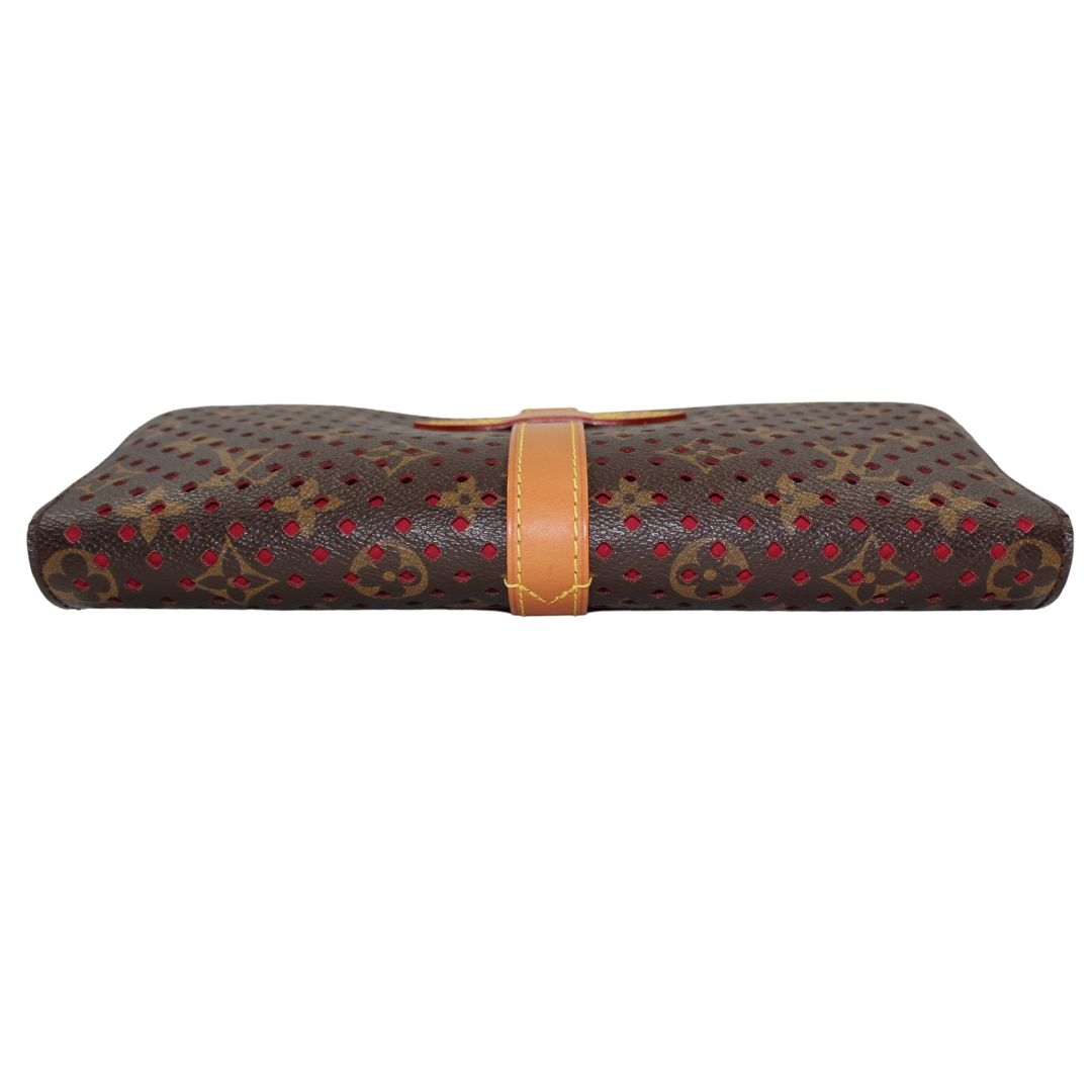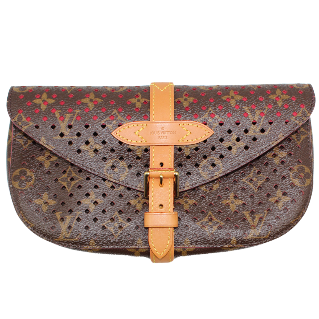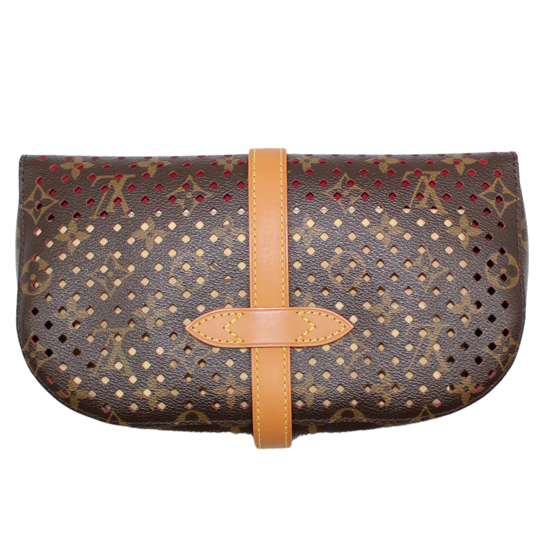 Experience luxury with the LV Saumur Monogram Perfor Clutch. Crafted with brown co canvas and adorned with the iconic LV monogram, this elegant clutch features brass hardware and a buckle closure for a chic touch. The soft Alcantara lining adds a luxurious feel to this must-have accessory.