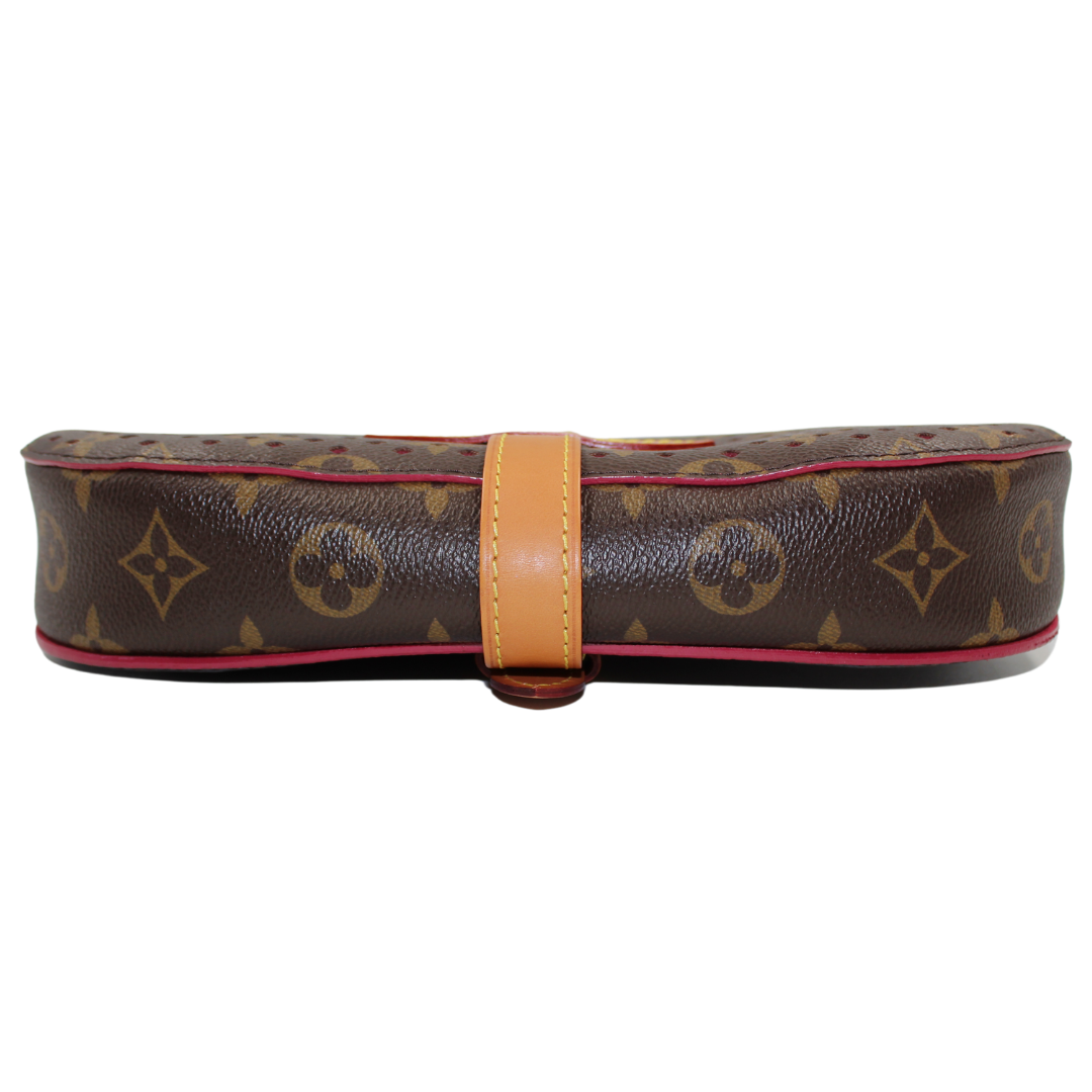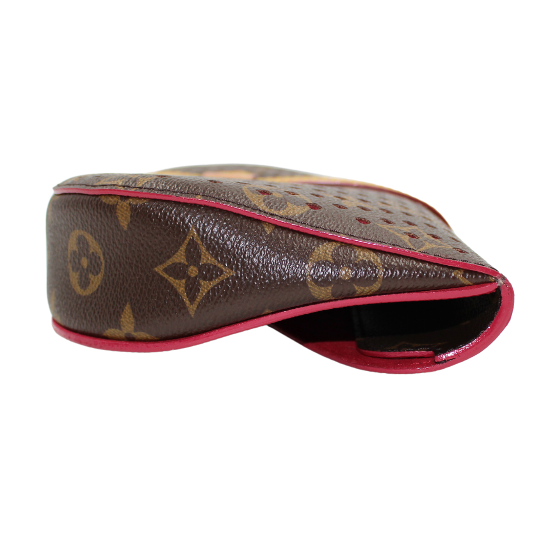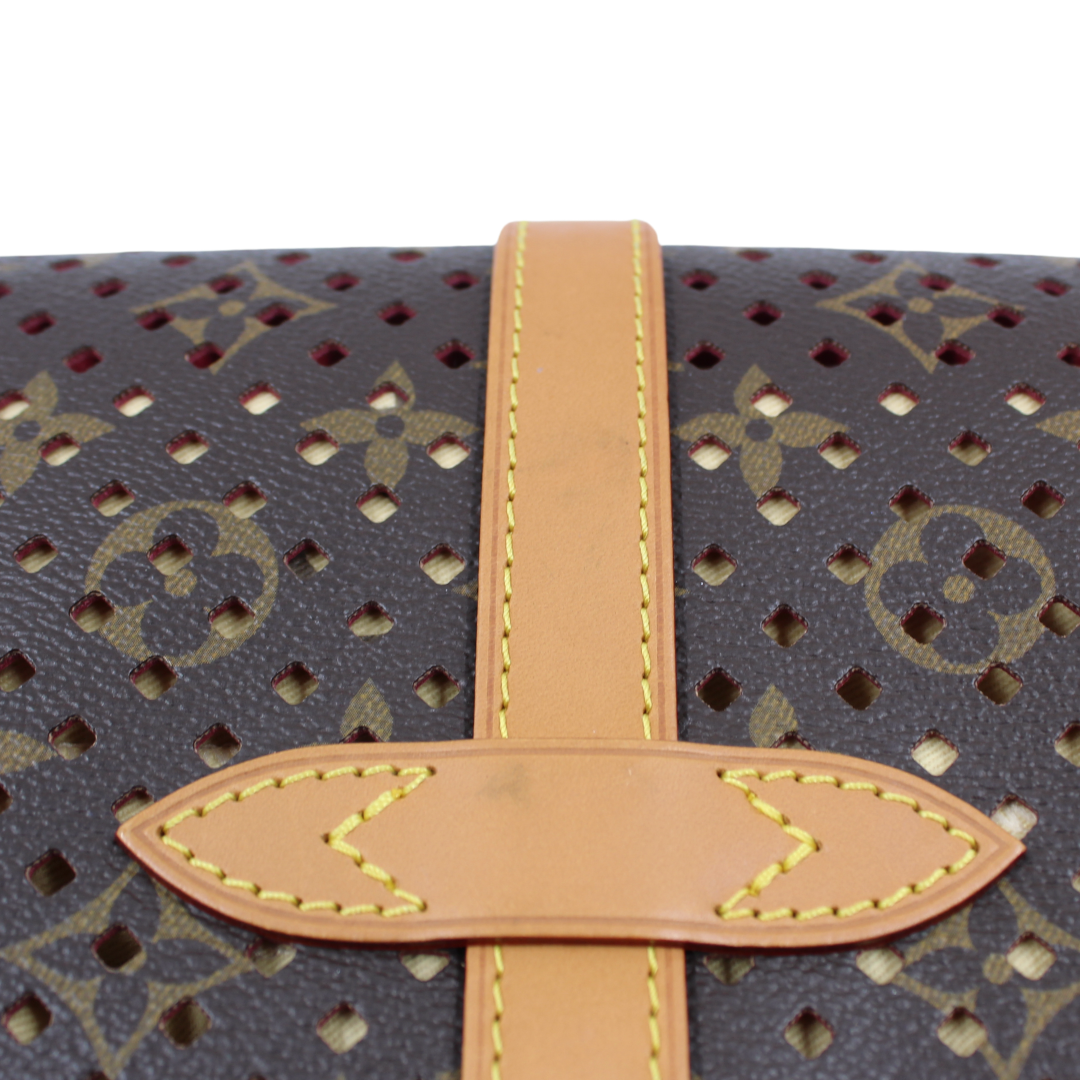 Experience luxury with the LV Saumur Monogram Perfor Clutch. Crafted with brown co canvas and adorned with the iconic LV monogram, this elegant clutch features brass hardware and a buckle closure for a chic touch. The soft Alcantara lining adds a luxurious feel to this must-have accessory.