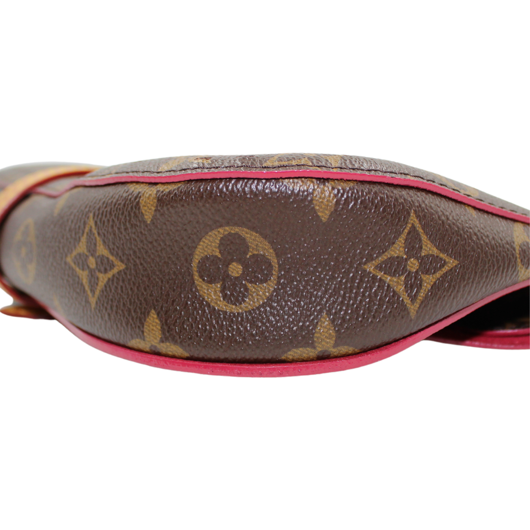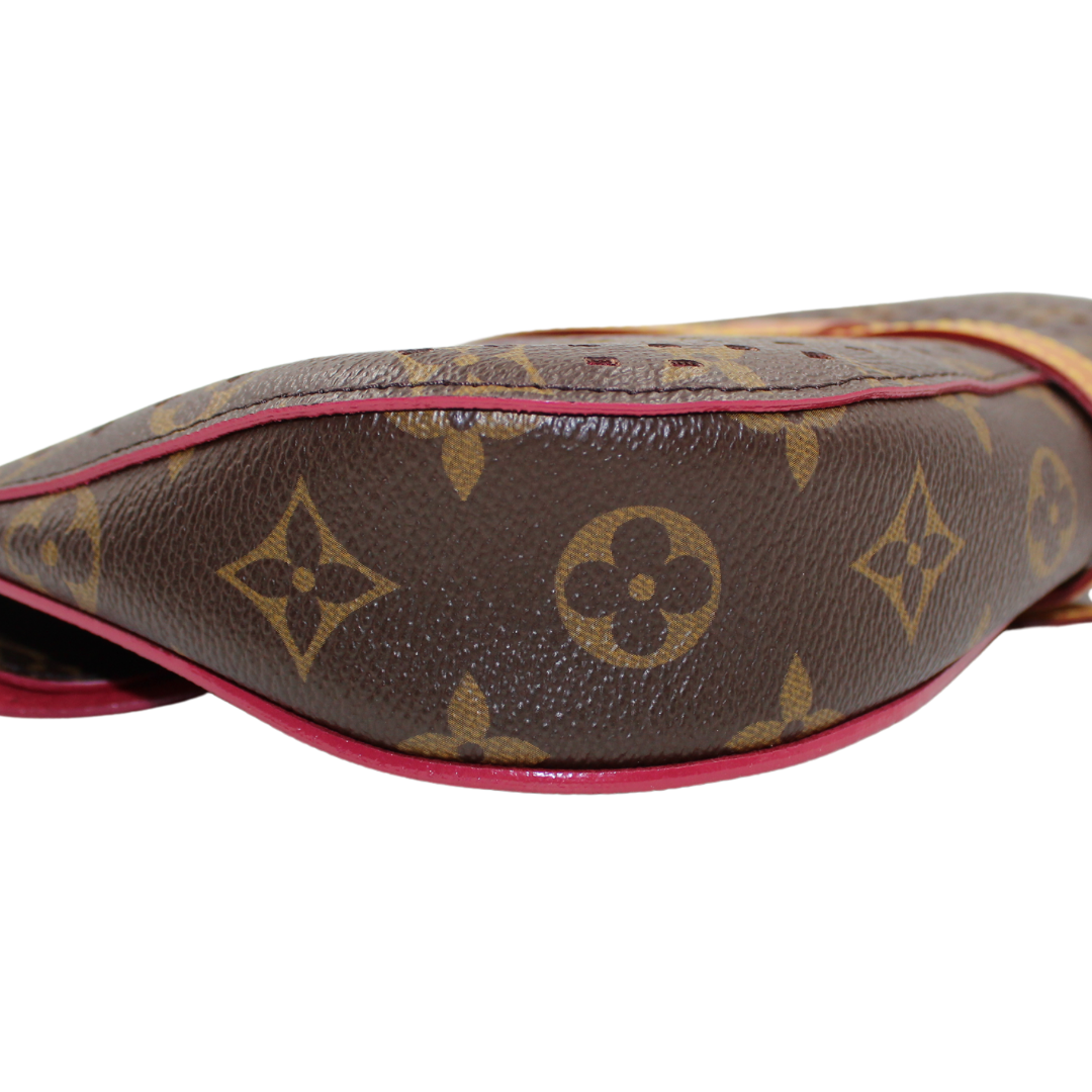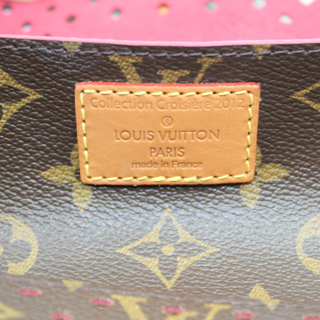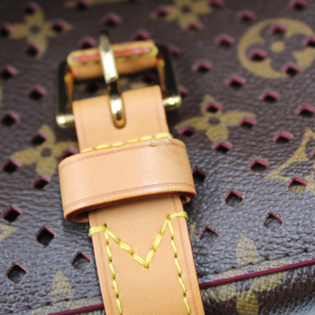 Experience luxury with the LV Saumur Monogram Perfor Clutch. Crafted with brown co canvas and adorned with the iconic LV monogram, this elegant clutch features brass hardware and a buckle closure for a chic touch. The soft Alcantara lining adds a luxurious feel to this must-have accessory.
