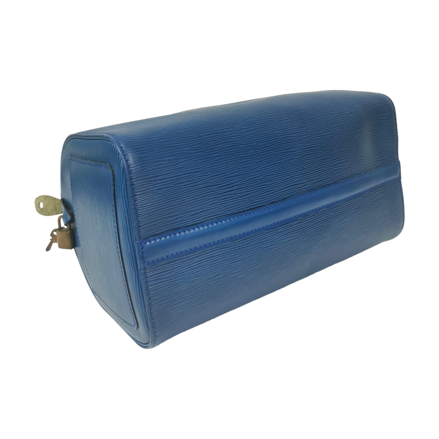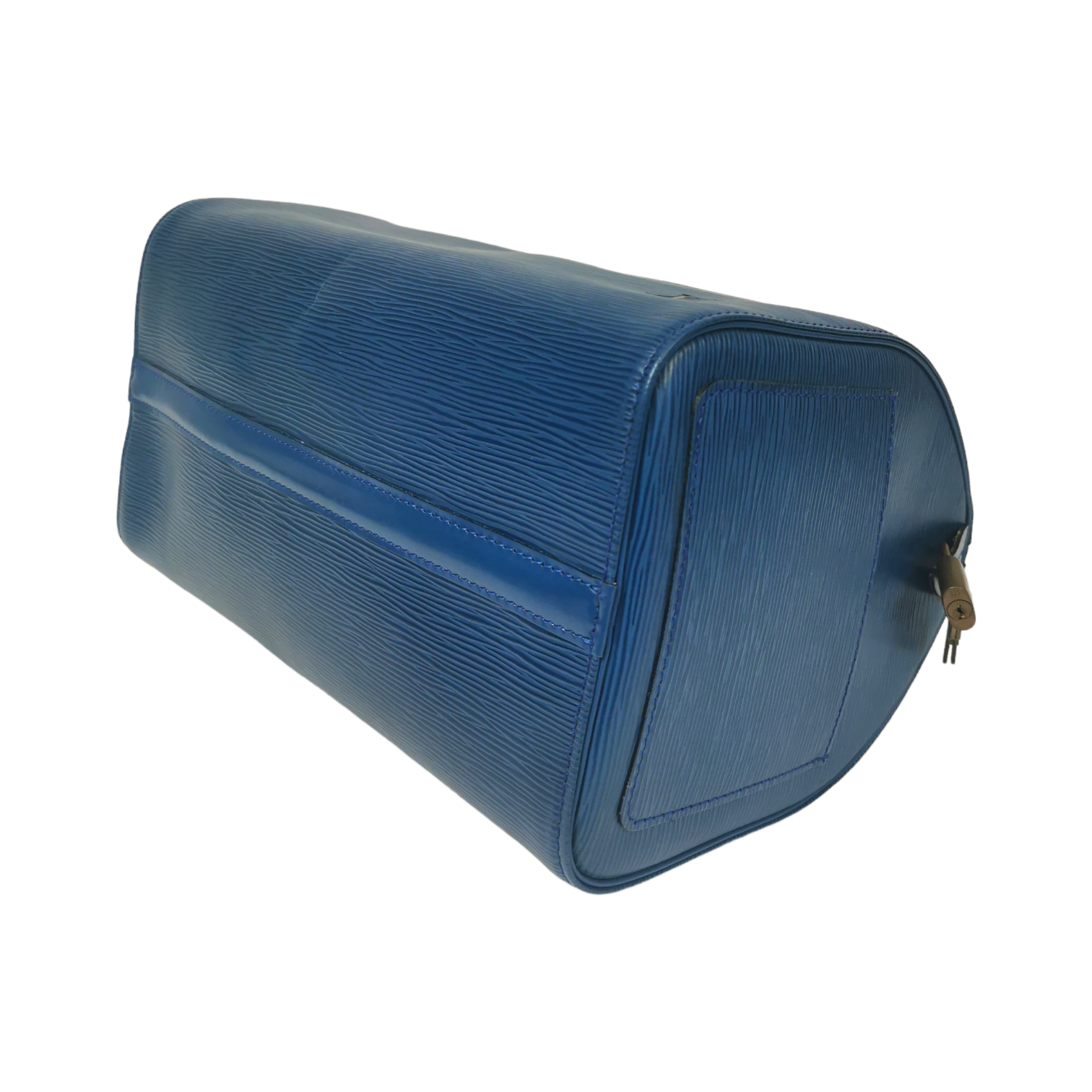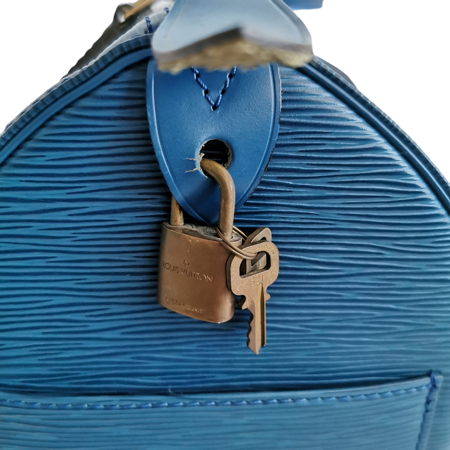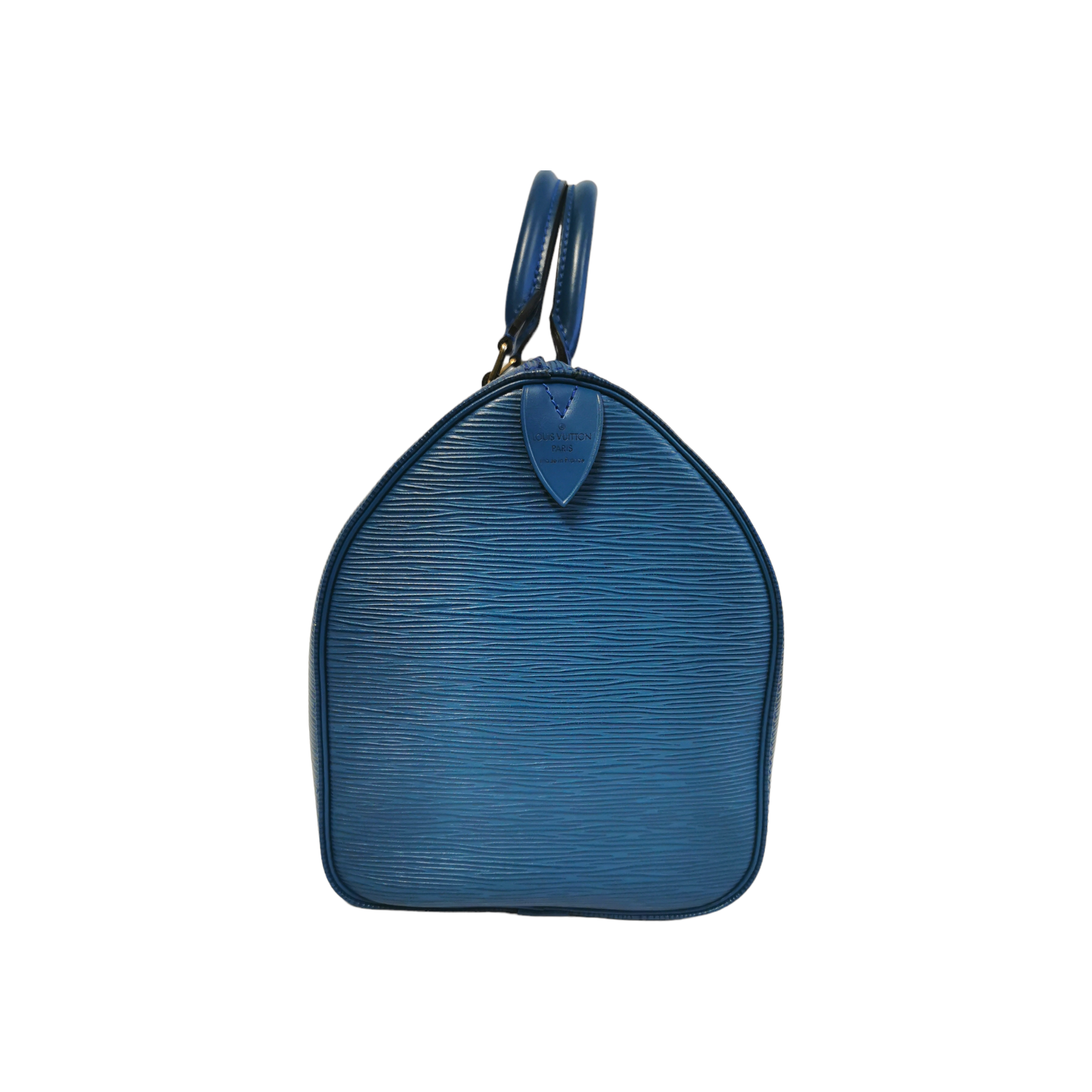 The LV Speedy 30 Bag was made of blue EPI leather. The model is inspired by the famous Keep all travel bag. It has a zipper and offers easy elegance in a compact format. A beautiful classic and one of the most popular models by LV.