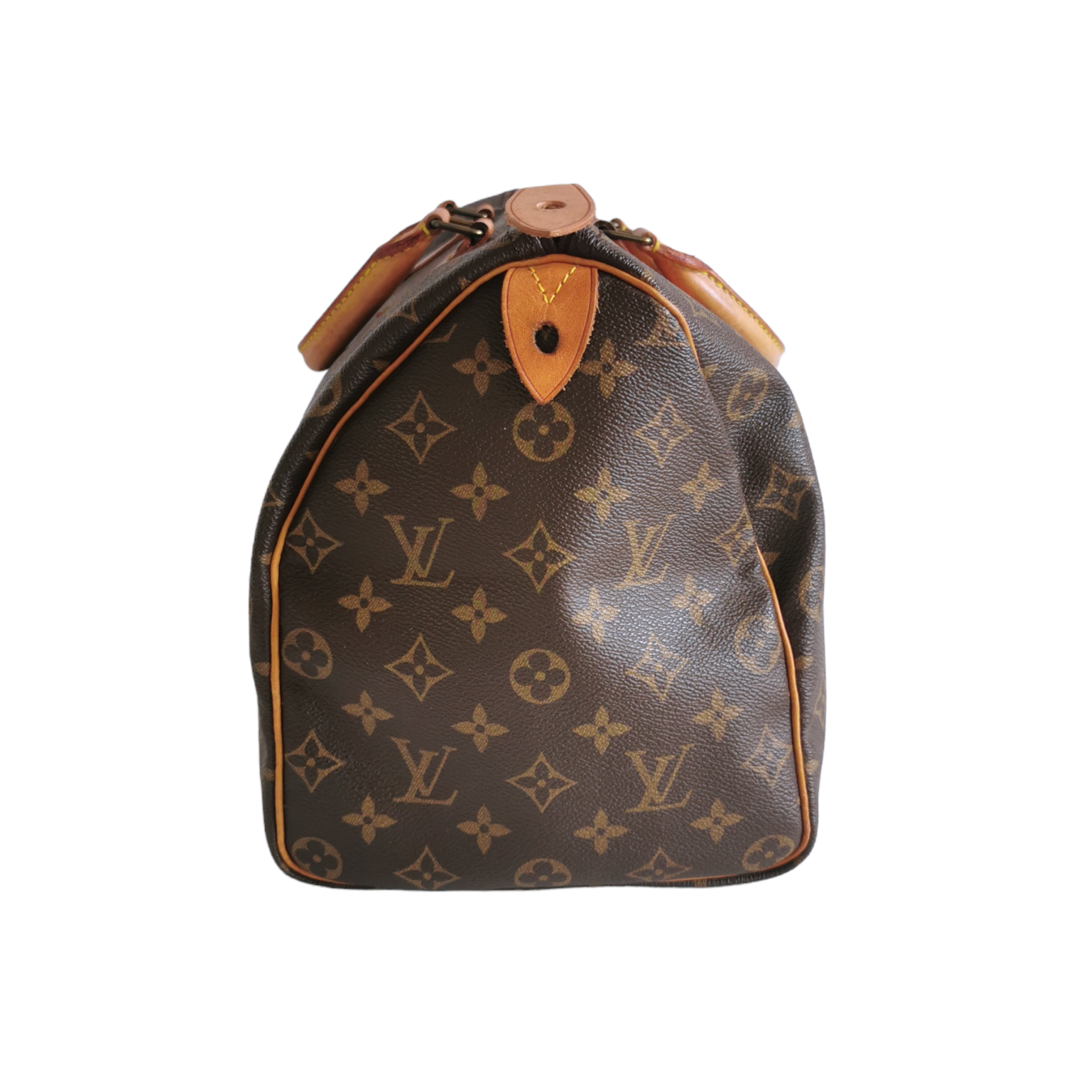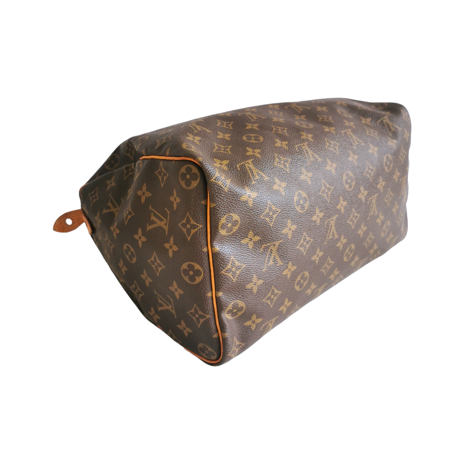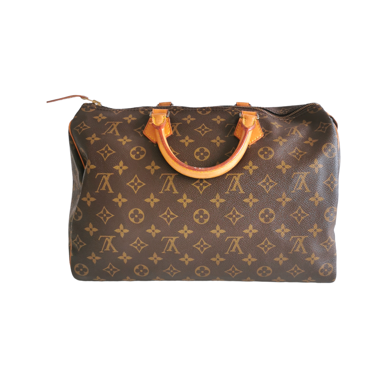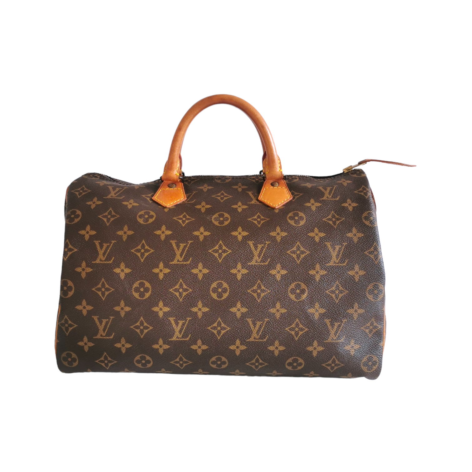 Diese schöne LV Speedy 35 wurde aus braunem Monogram Canvas gefertigt. Die Tasche besitzt hellbraune Besätze und Henkel aus Vachetta Leder und goldene Details. Die obere Öffnung der Tasche wird über einen Reissverschluss gesichert, im Innenraum besitzt die Tasche ein Reissverschlussfach. Die Tasche wird in der Hand oder im Arm getragen. Eine der beliebtesten Taschen des französischen Traditionsunternehmens überhaupt, die den klassischen LV Look perfekt beherrscht.