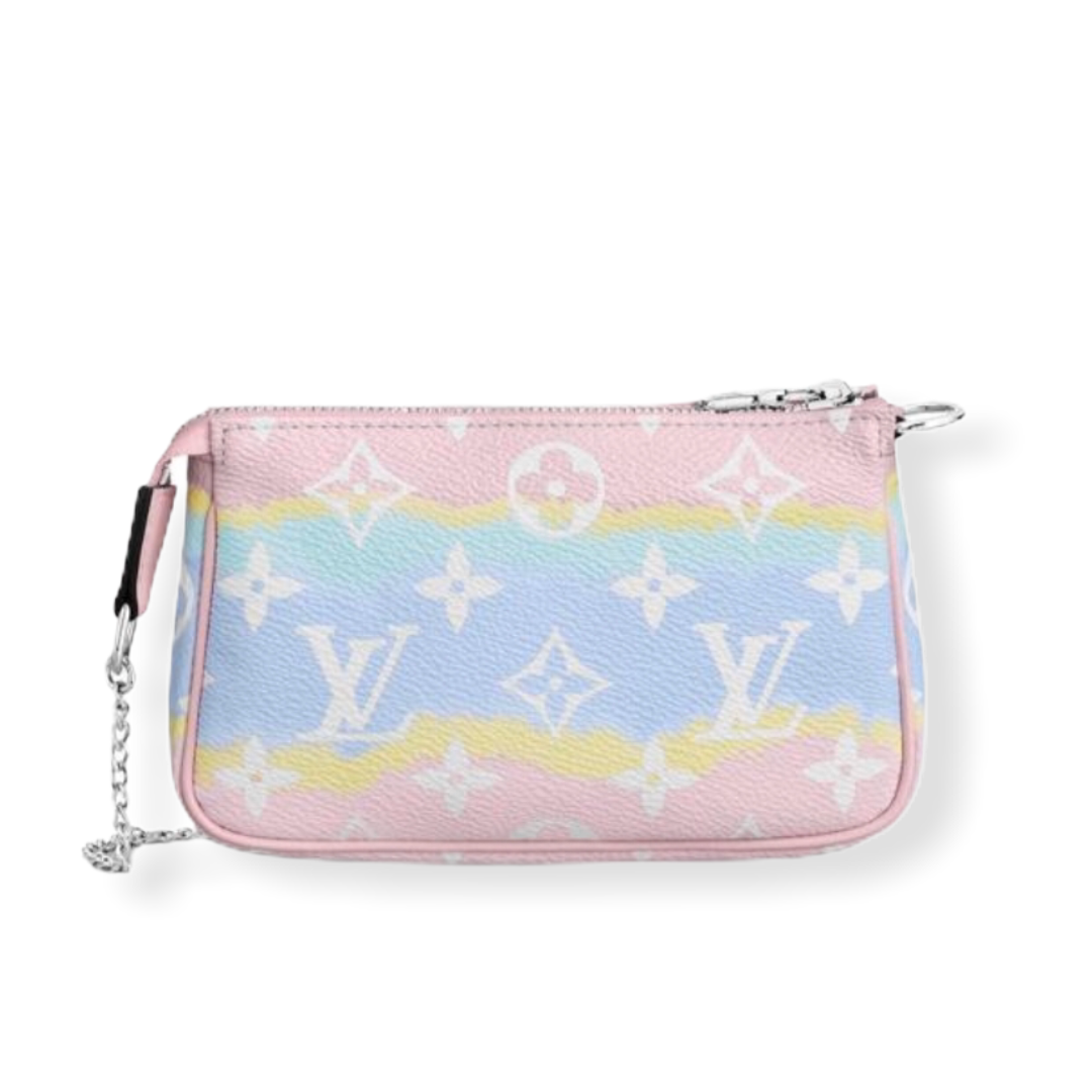 The LV Mini Pochette is reinvented for SS20, in pastel tie-dye. This pouch can be attached to other bags or a belt thanks to it’s removable chain.