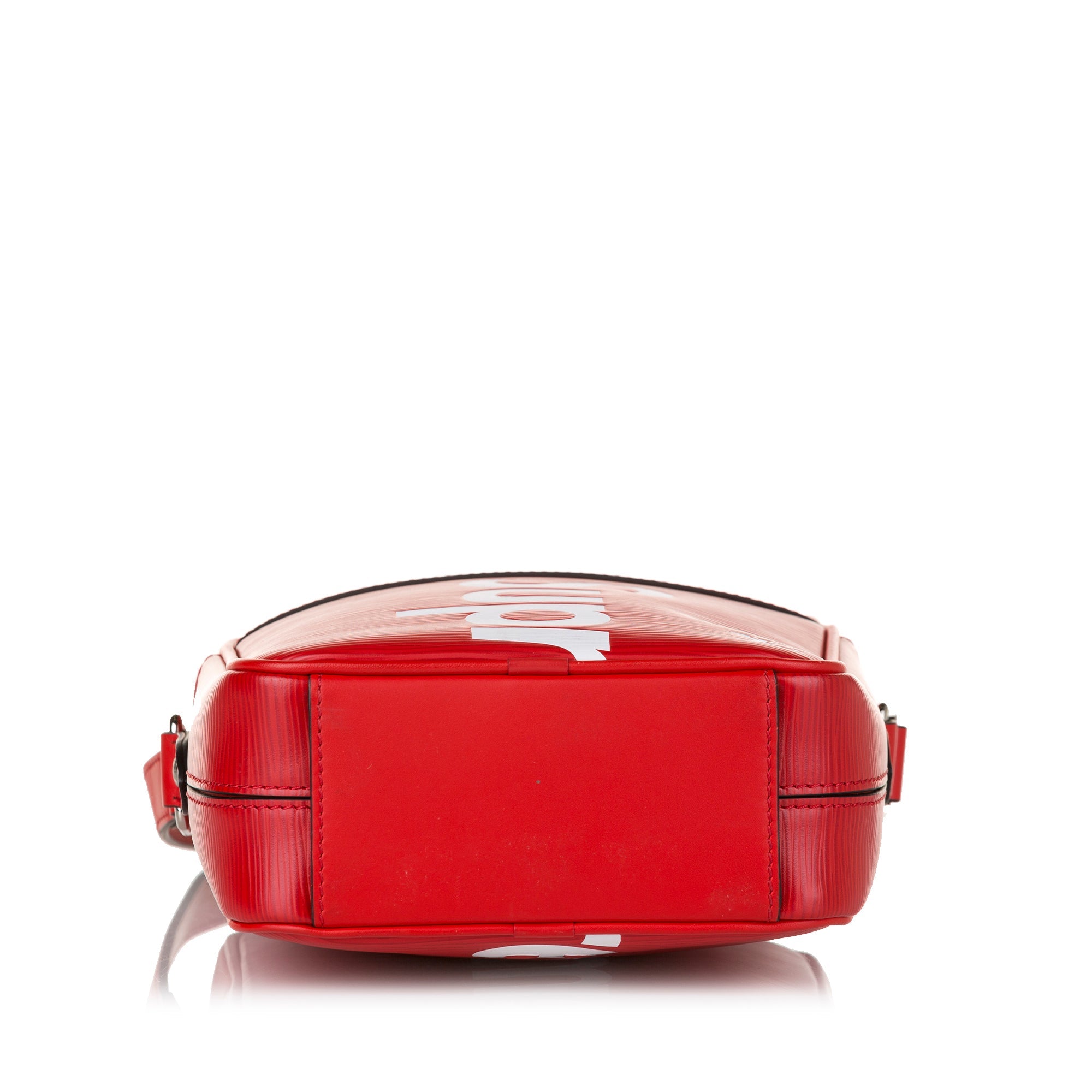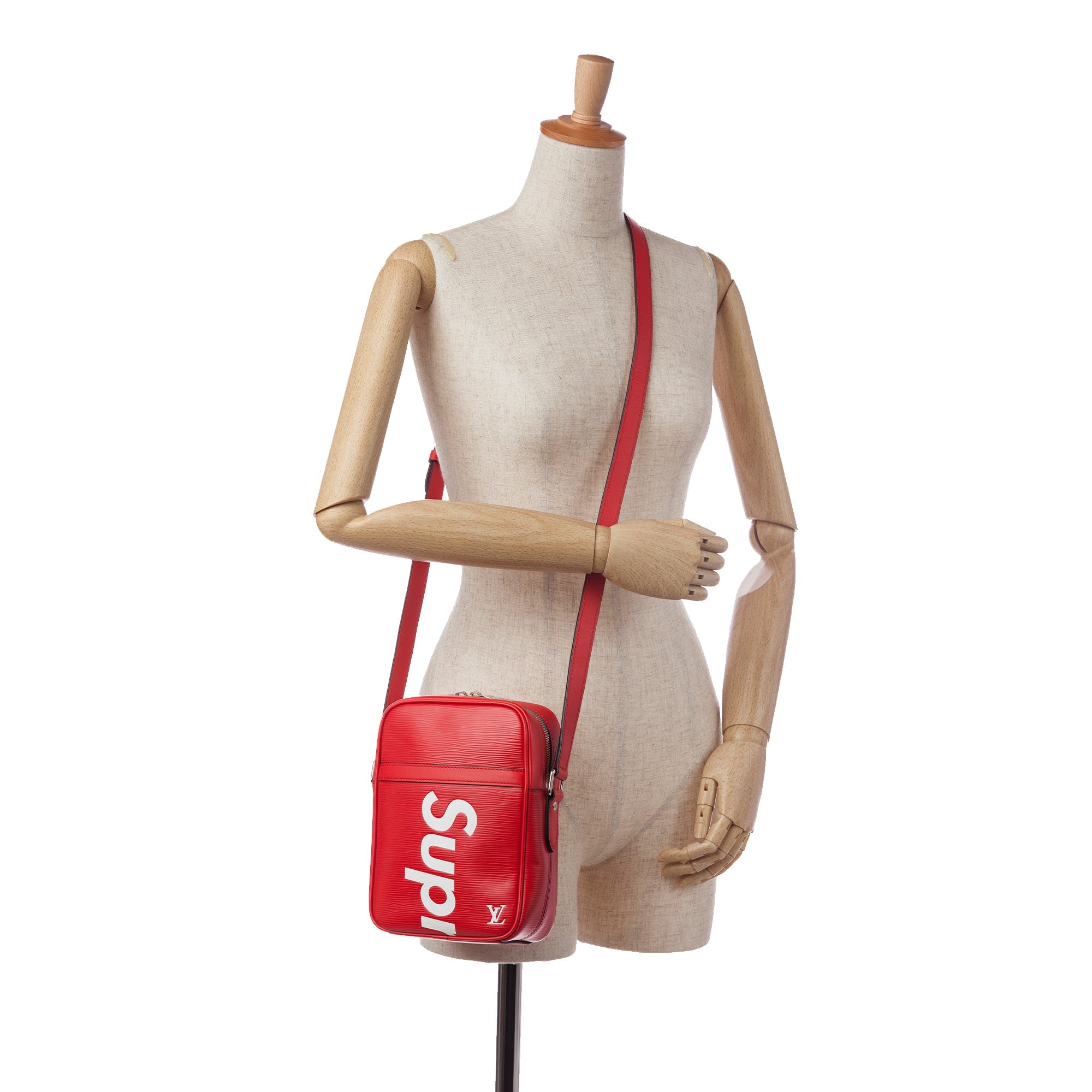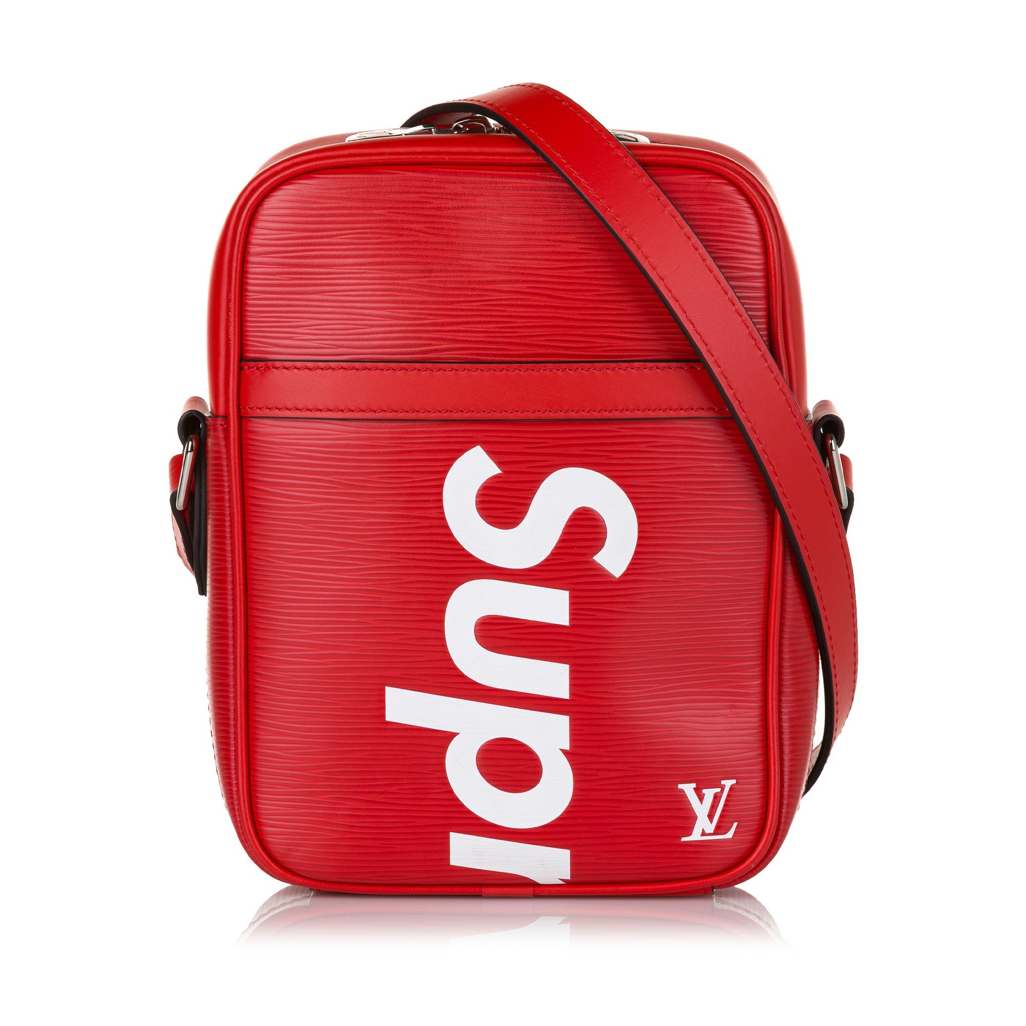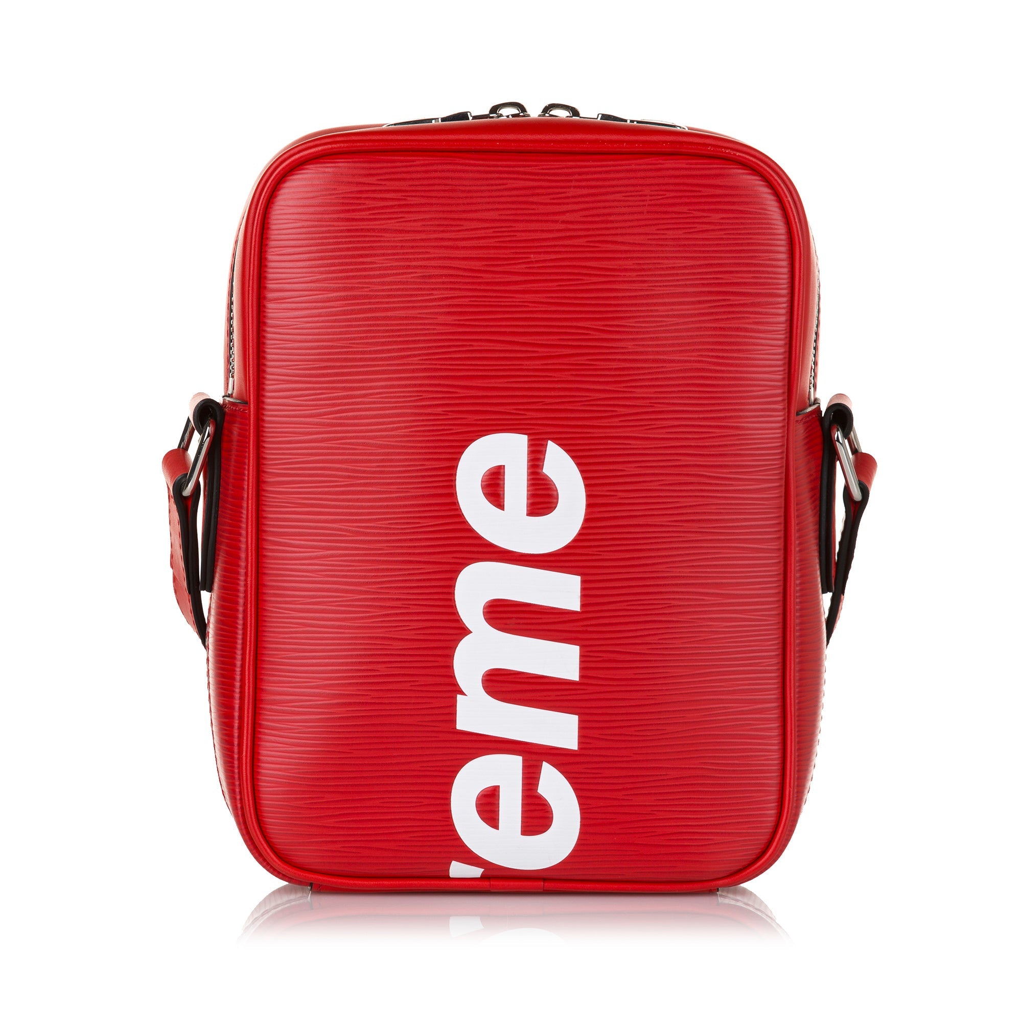 This chic Danube from LV in collaberation with Supreme, is made from the finest textured red epi leather and features the Supreme logo , wrapped in glossy white from front to back. The Bag features a front pocket, an adjustable shoulder strap in smooth red leather with polished silver hardware, and a wrap-around zipper closure. The zipper opens to an interior of black microfiber with an attached Bag. A brilliant shoulder bag from LV, ideal for versatile use!