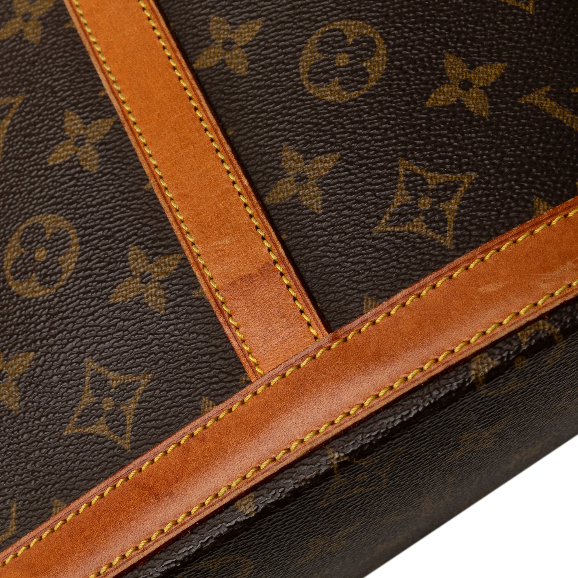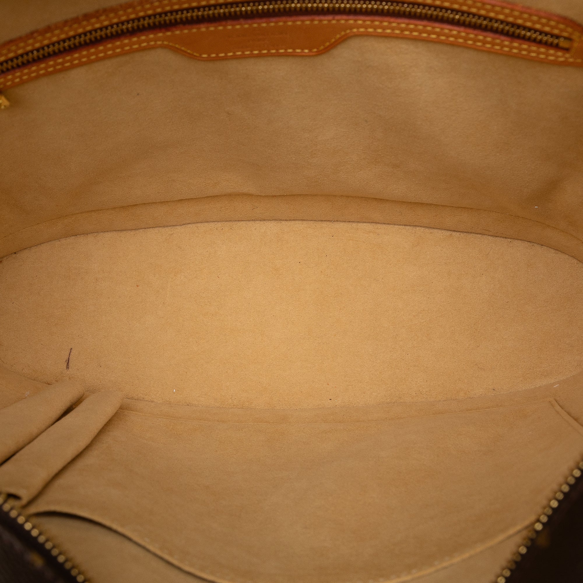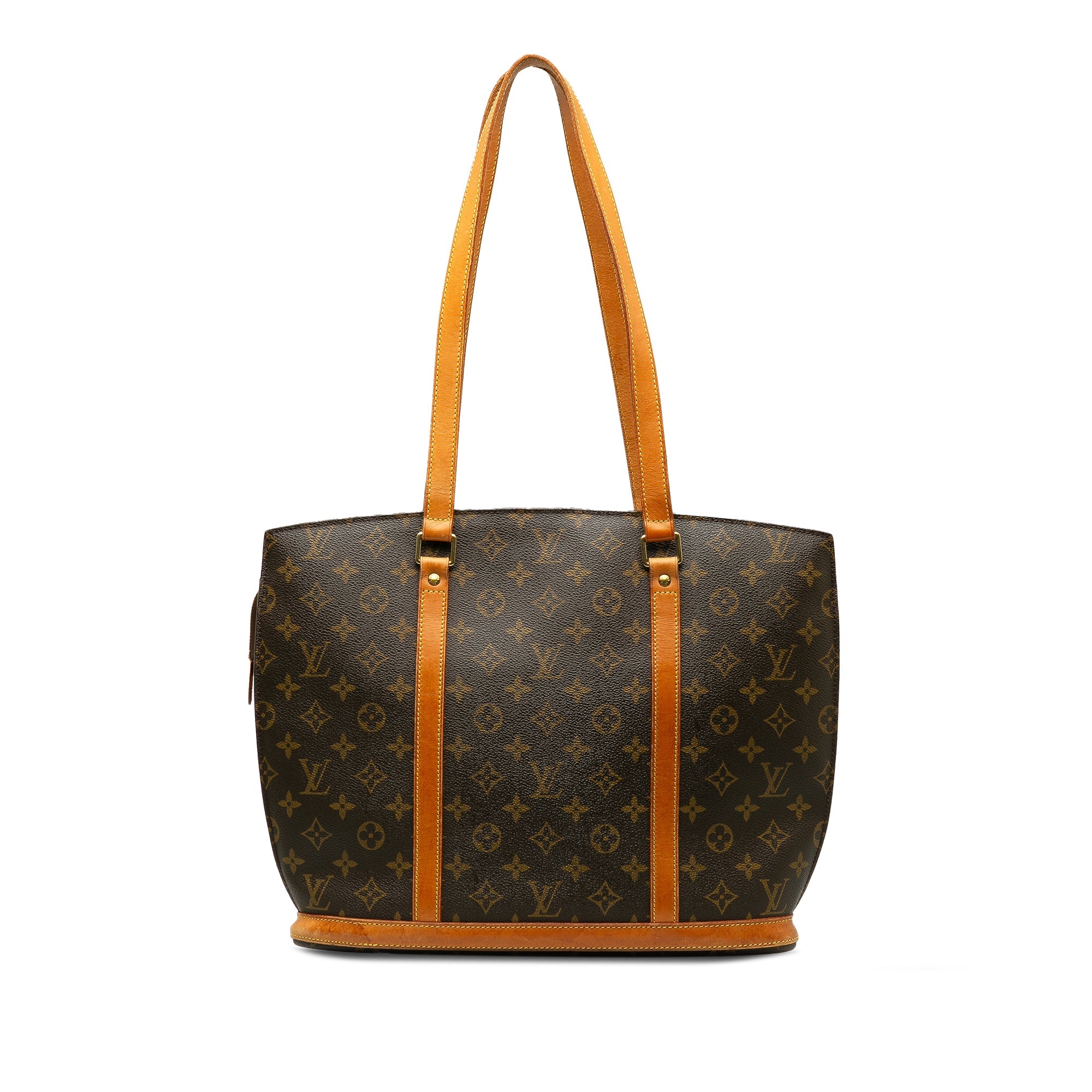 The Babylone features a monogram canvas body, flat vachetta leather straps, a top zip closure, an interior zip pocket, and interior slip pockets.