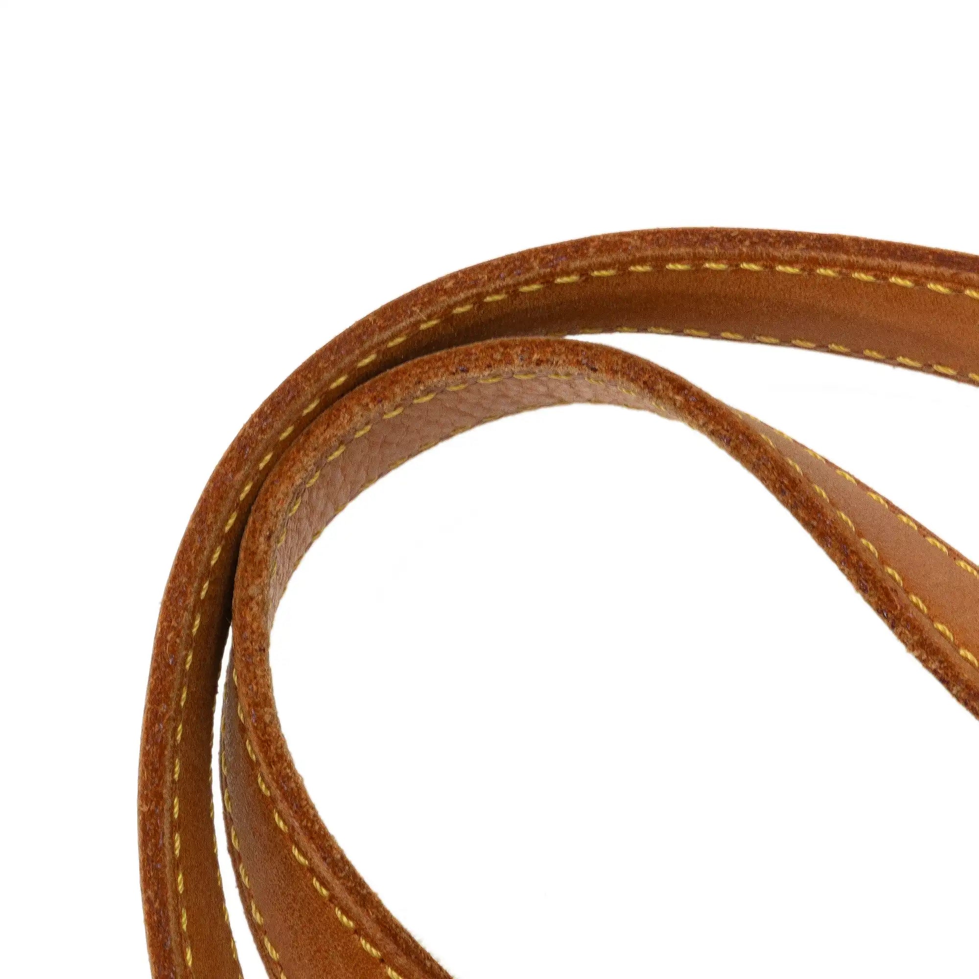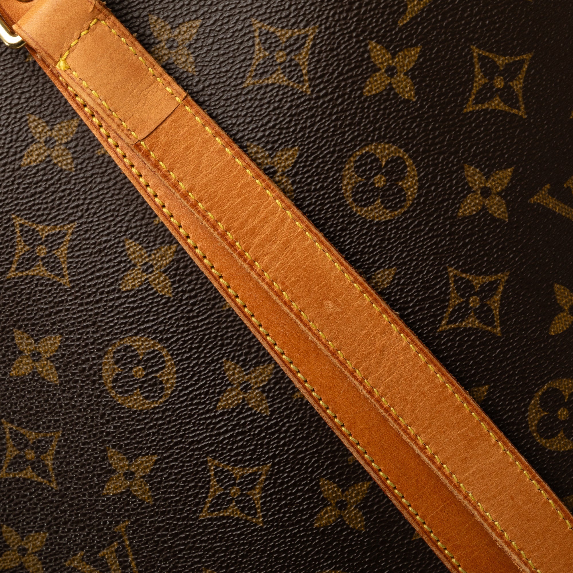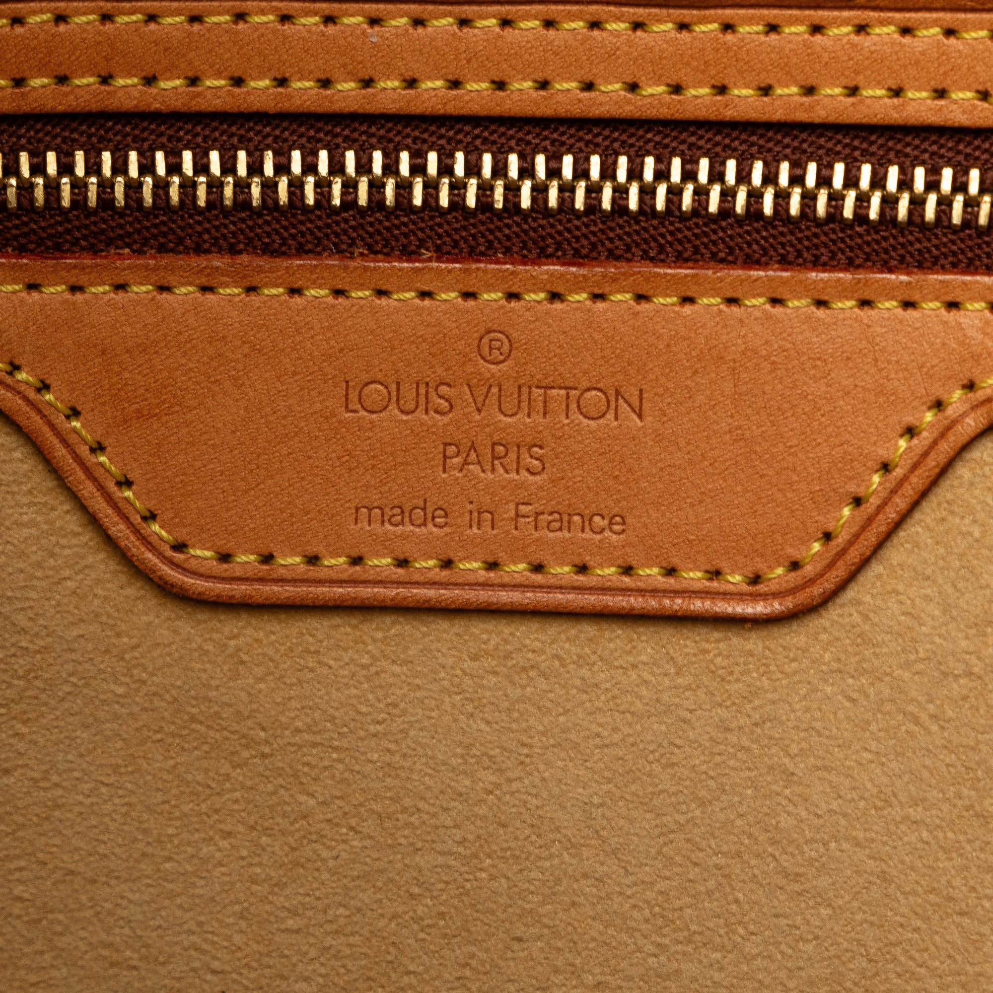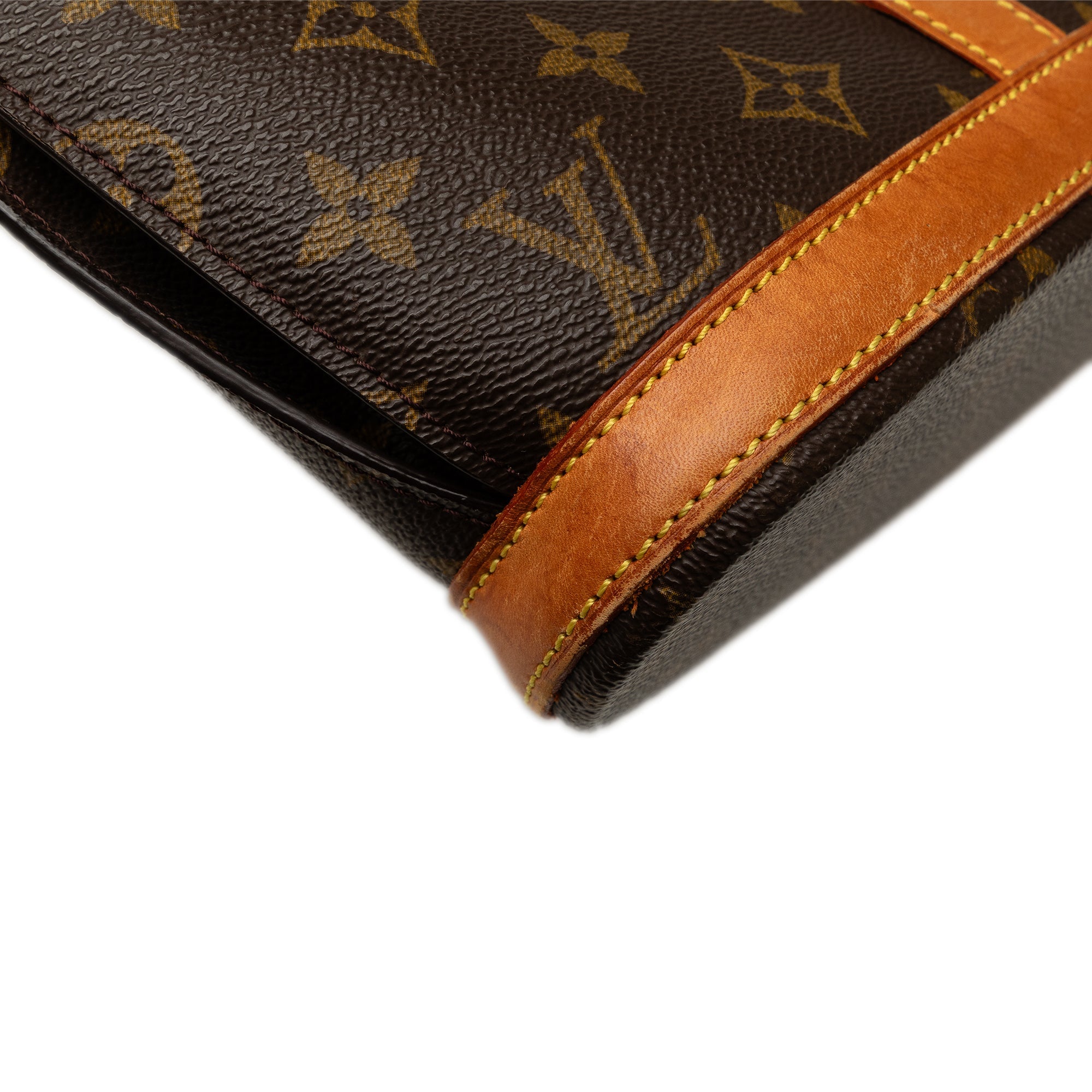 The Babylone features a monogram canvas body, flat vachetta leather straps, a top zip closure, an interior zip pocket, and interior slip pockets.