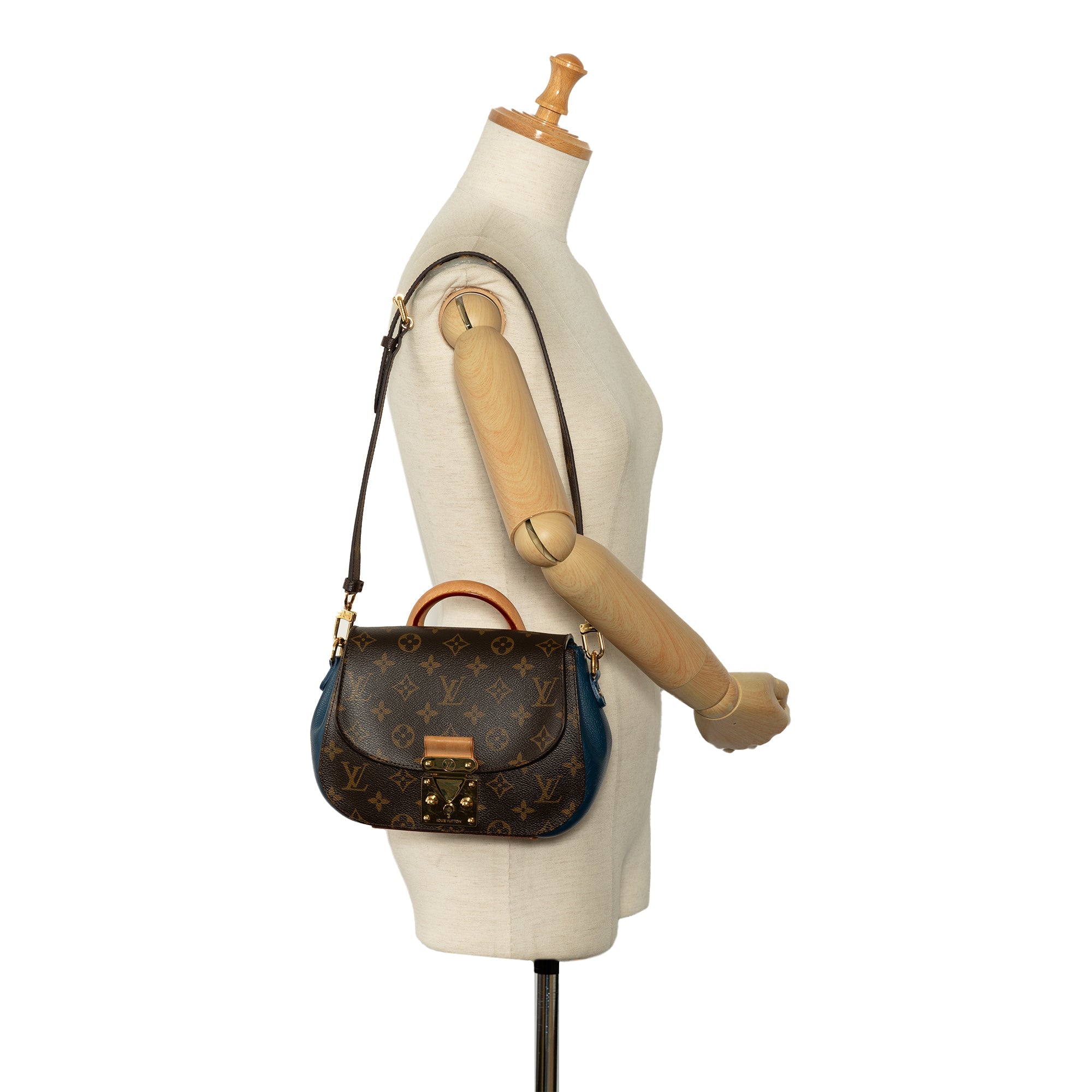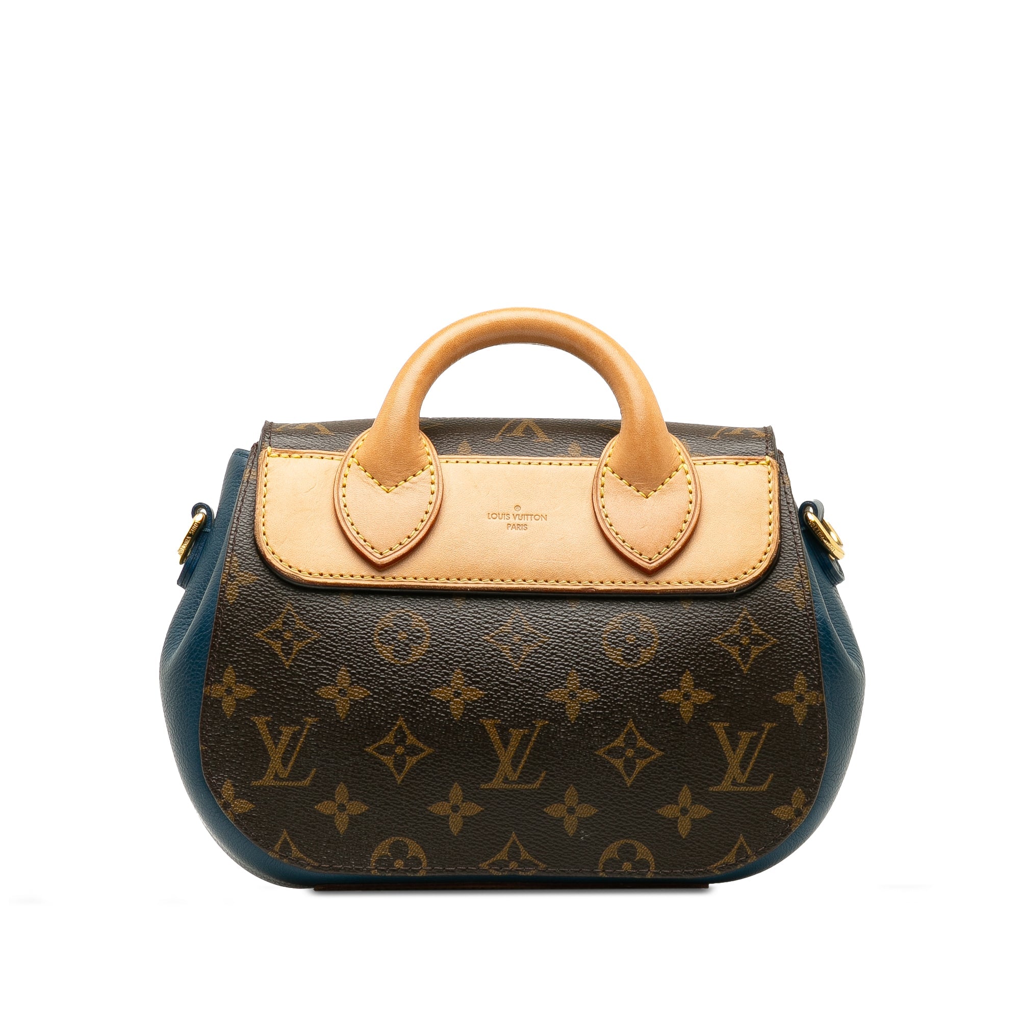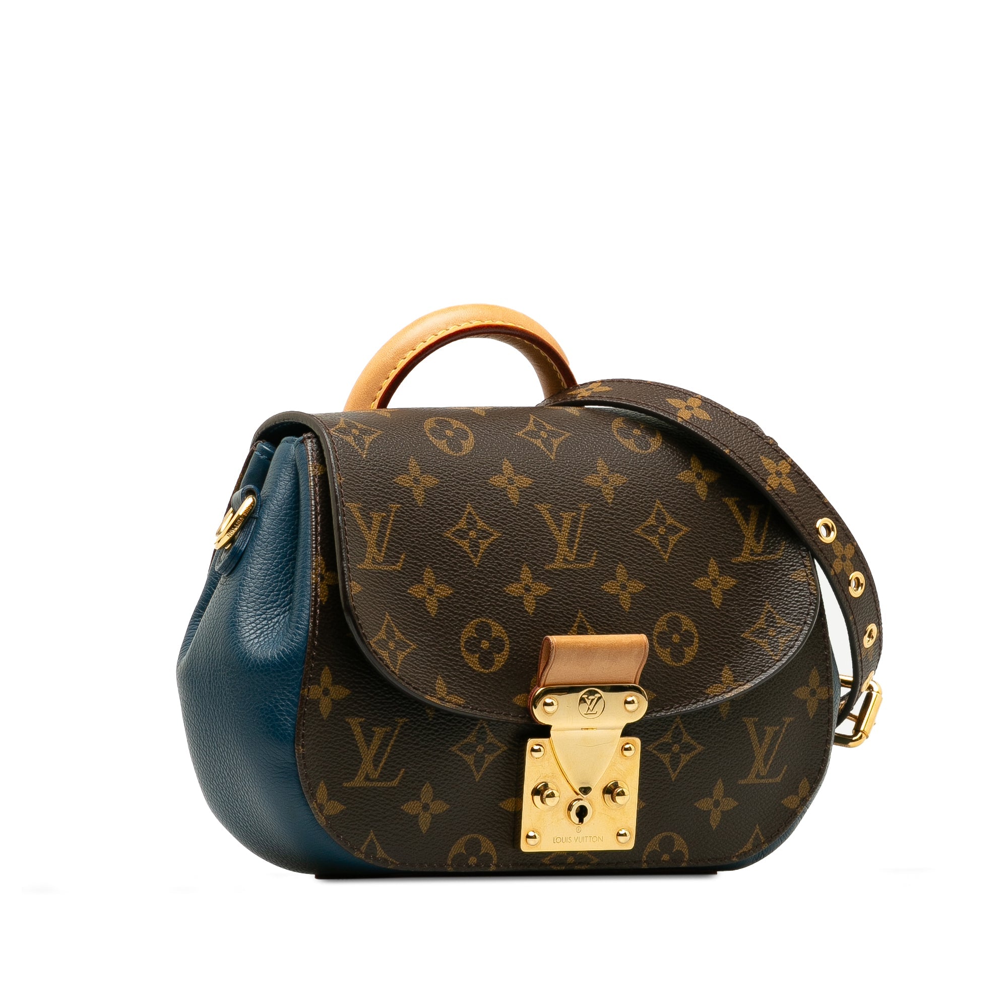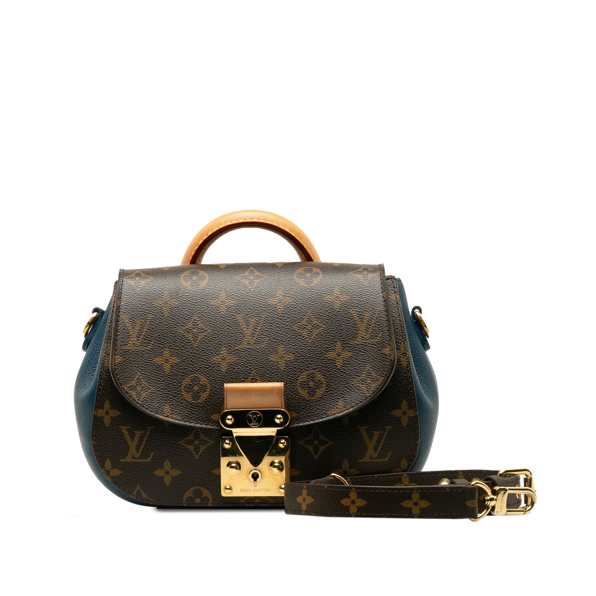 The Eden PM features a monogram canvas and leather body, a rolled vachetta leather top handle, an adjustable and detachable flat shoulder strap, a front flap with S-lock closure, and interior zip and slip pockets.