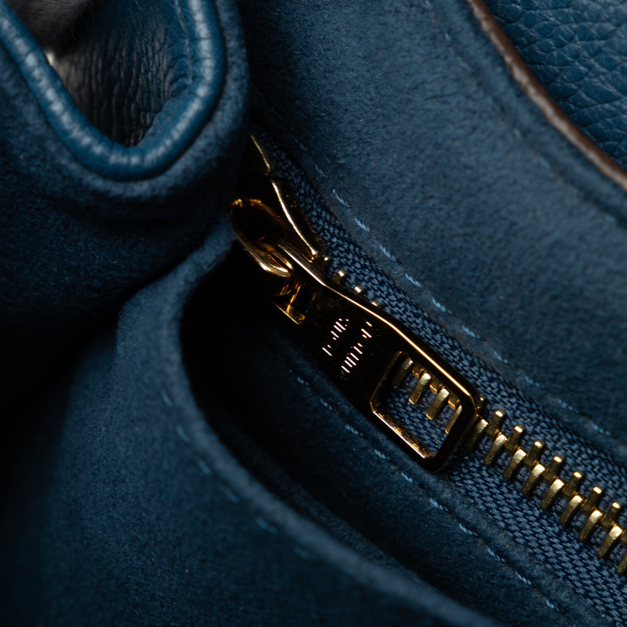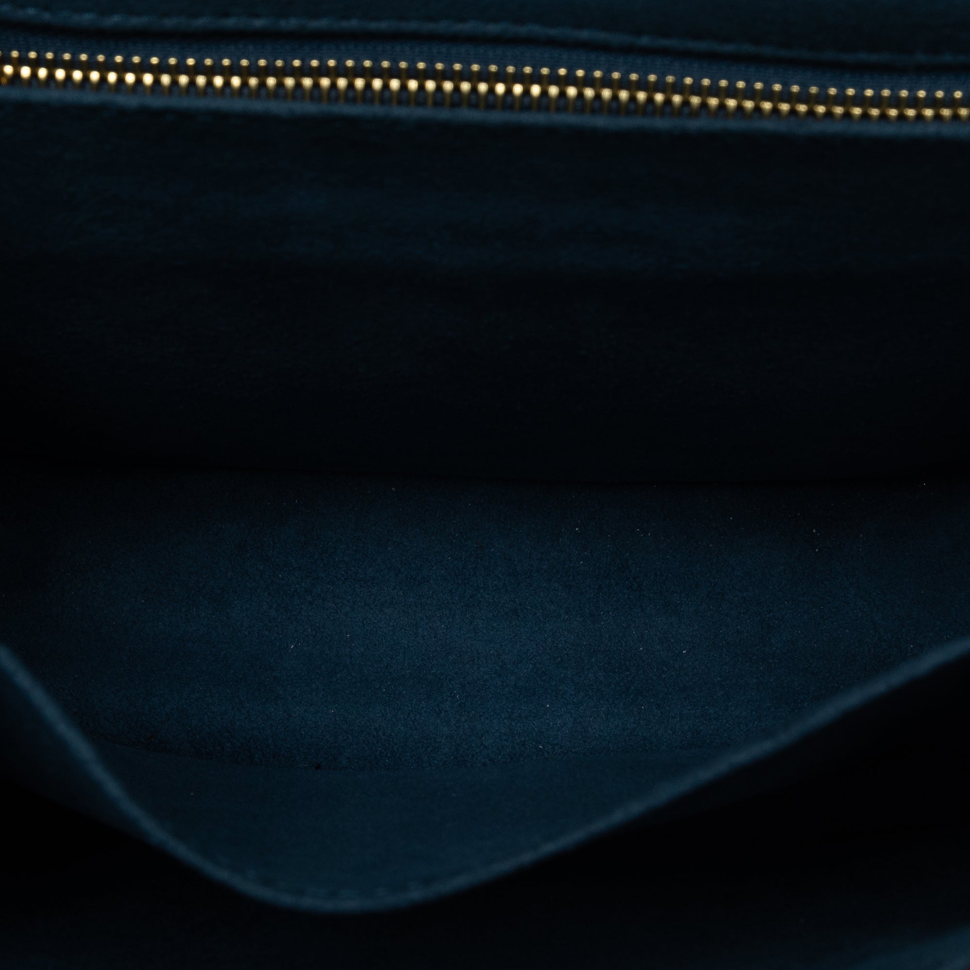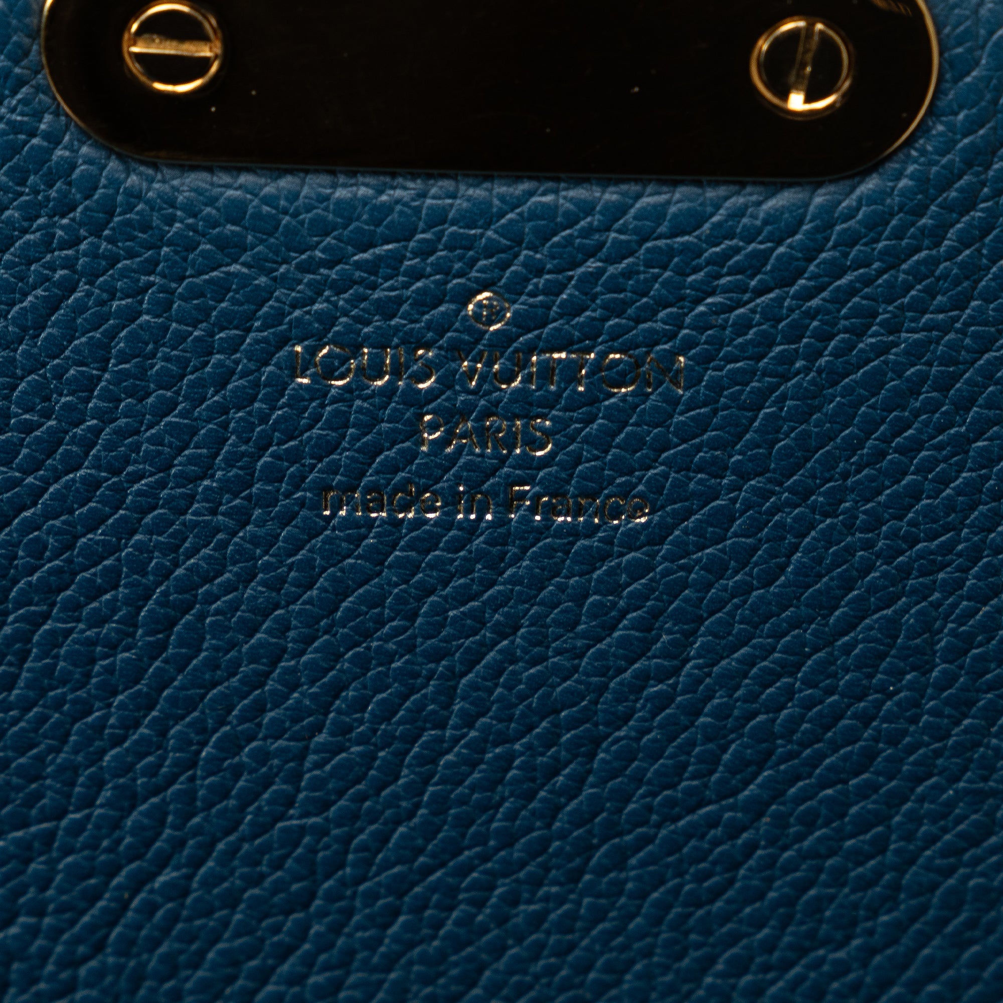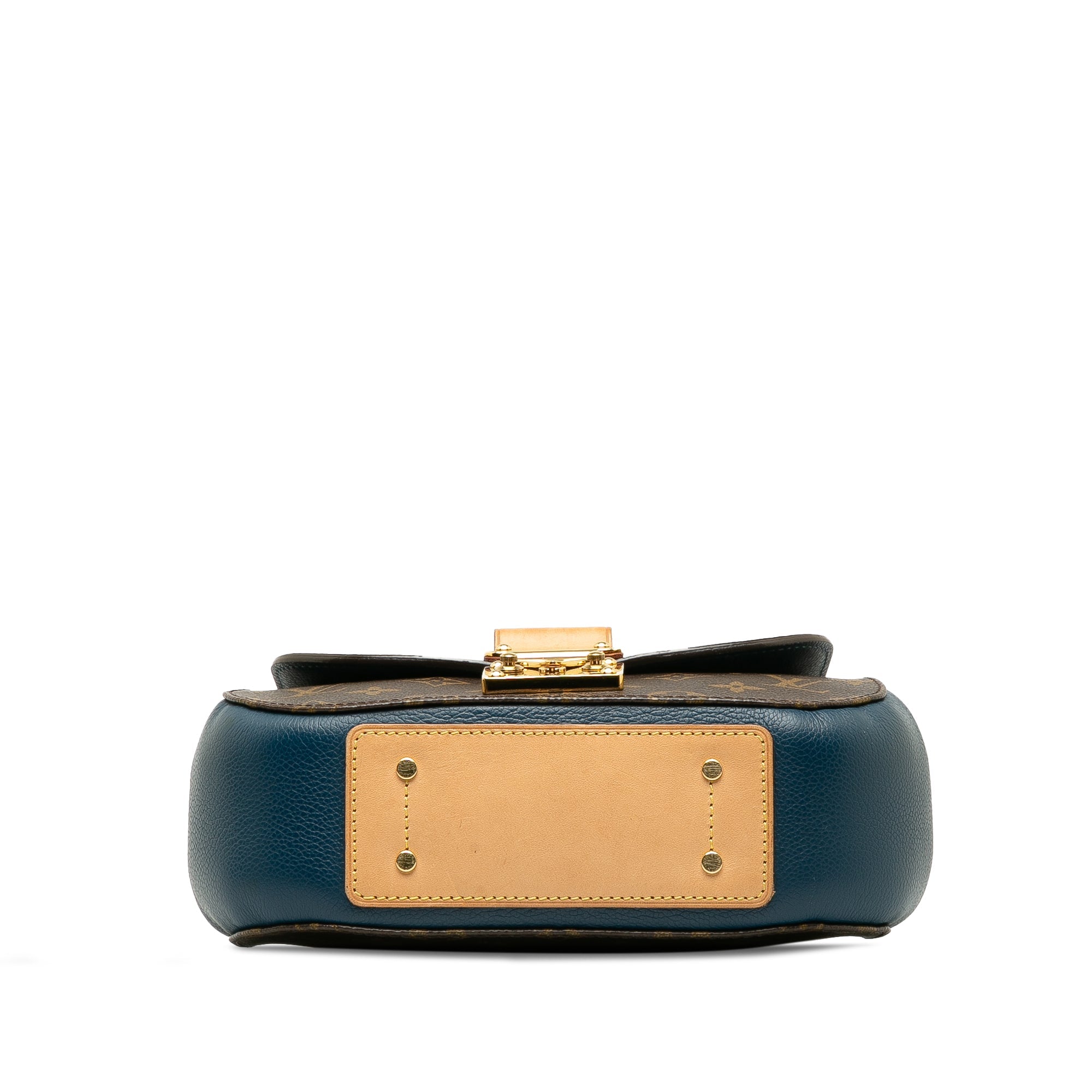 The Eden PM features a monogram canvas and leather body, a rolled vachetta leather top handle, an adjustable and detachable flat shoulder strap, a front flap with S-lock closure, and interior zip and slip pockets.