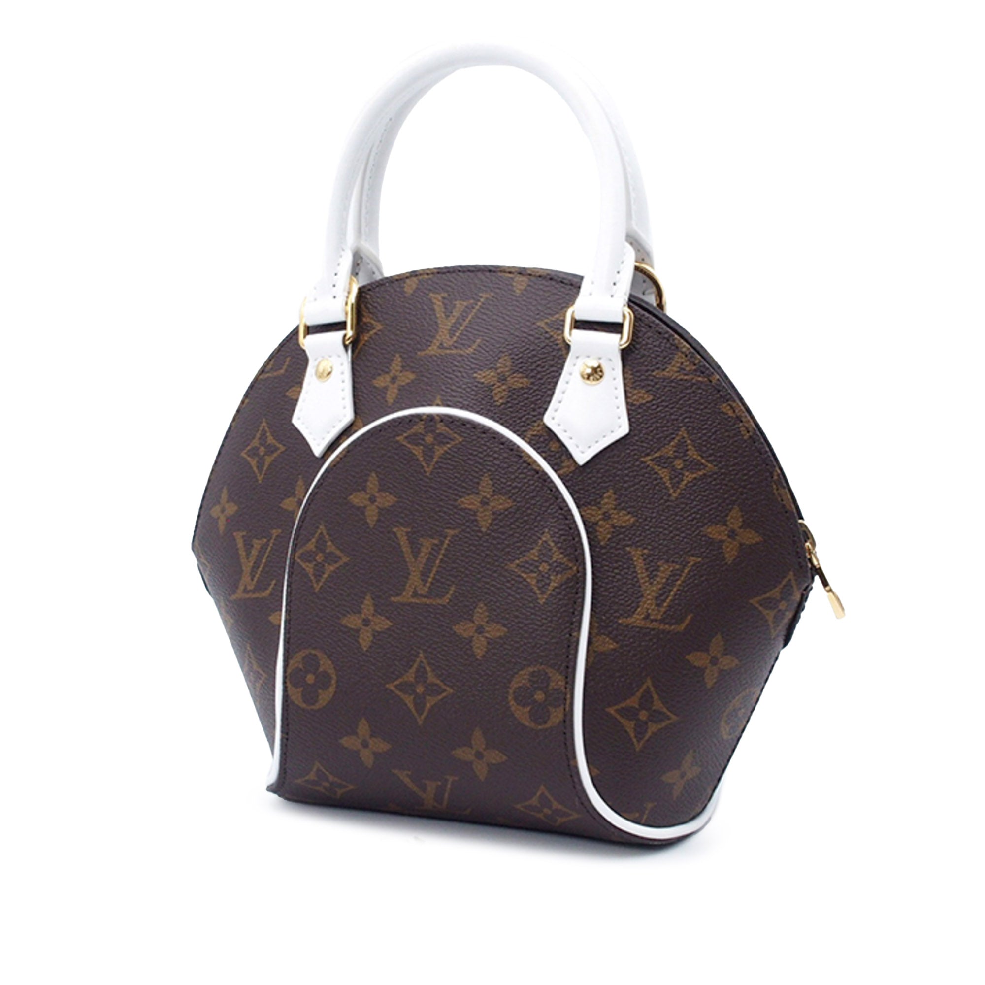 The Ellipse BB features a monogram canvas body, rolled leather handles, a detachable flat strap, a top zip closure, and an interior slip pocket.