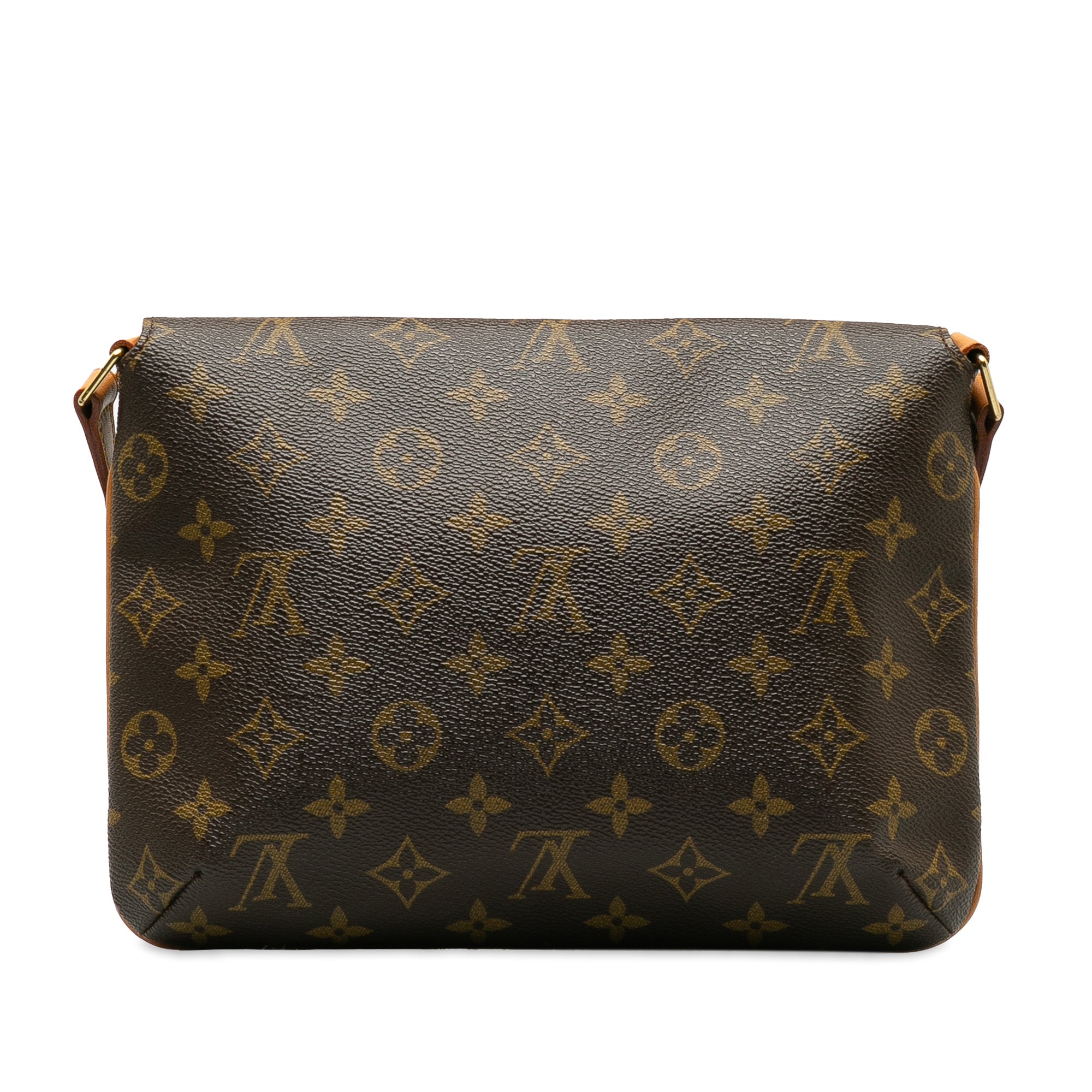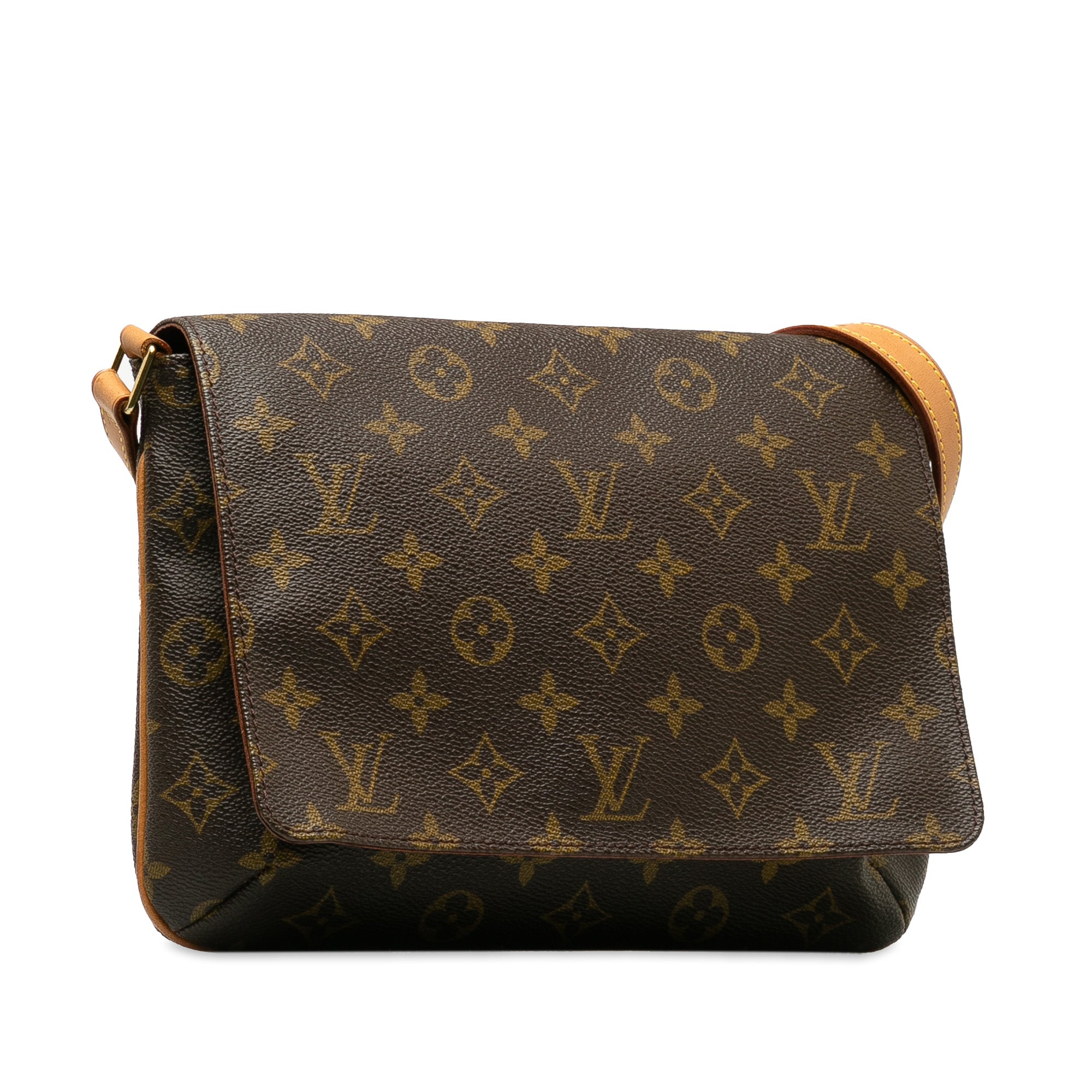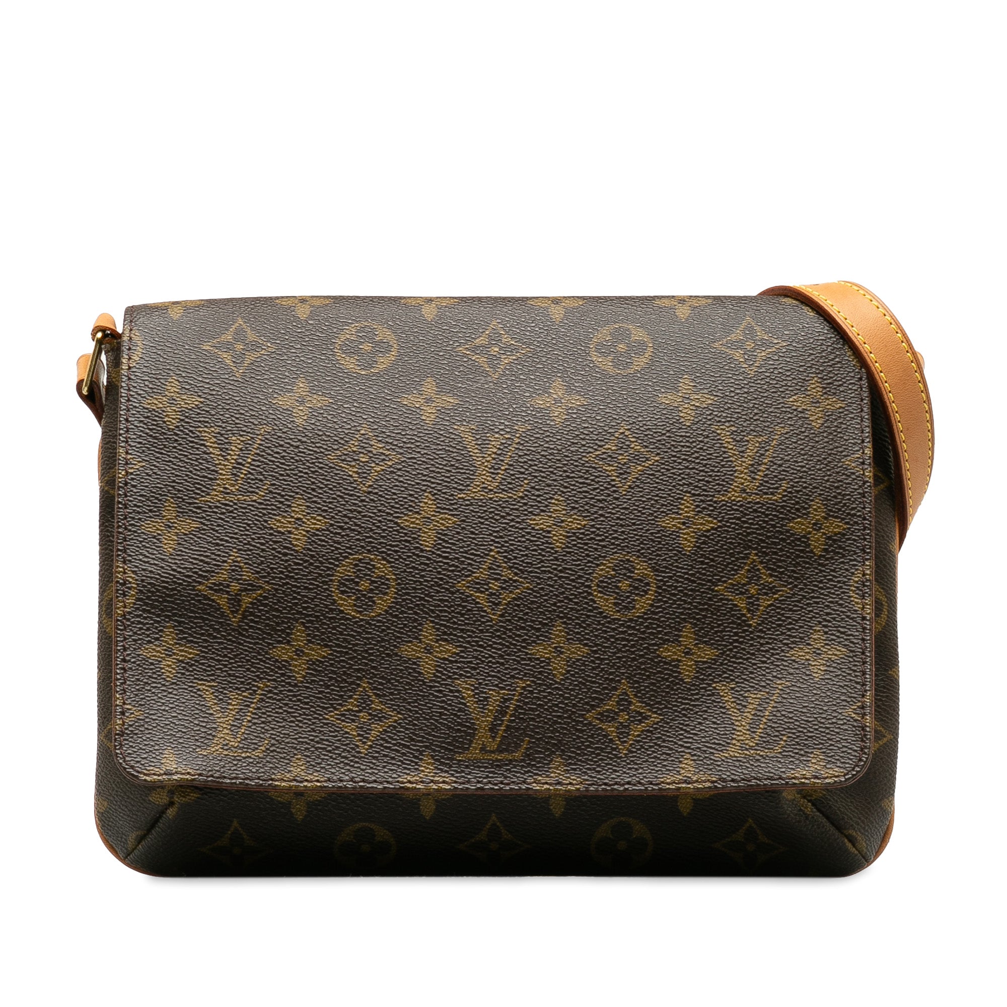 The Musette Tango features a monogram canvas body, a leather shoulder strap, a front flap with a magnetic closure, and an interior slip pocket.