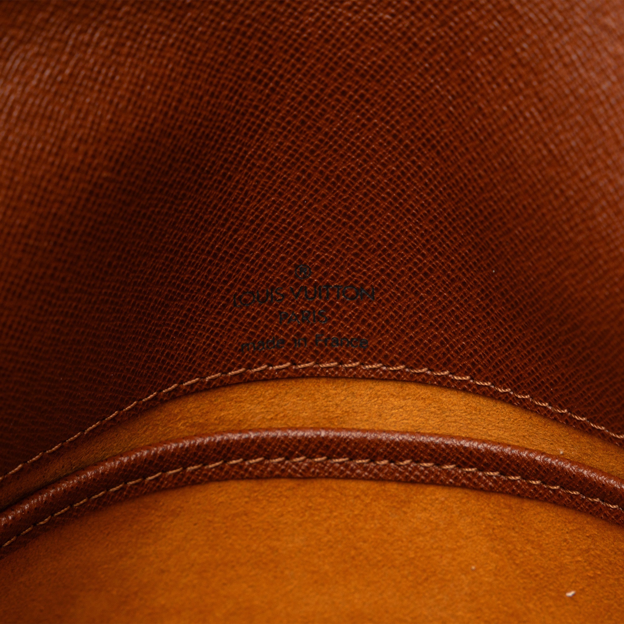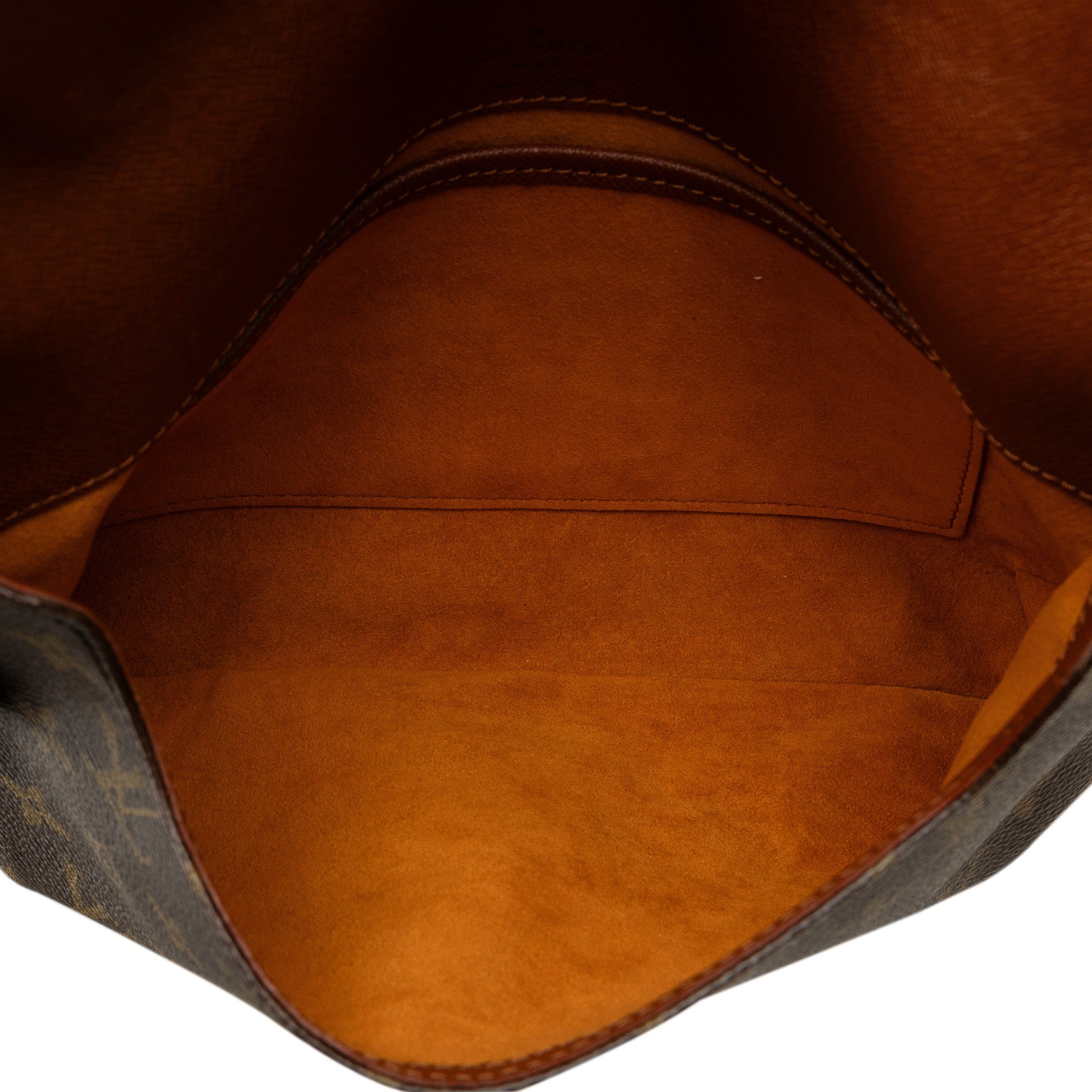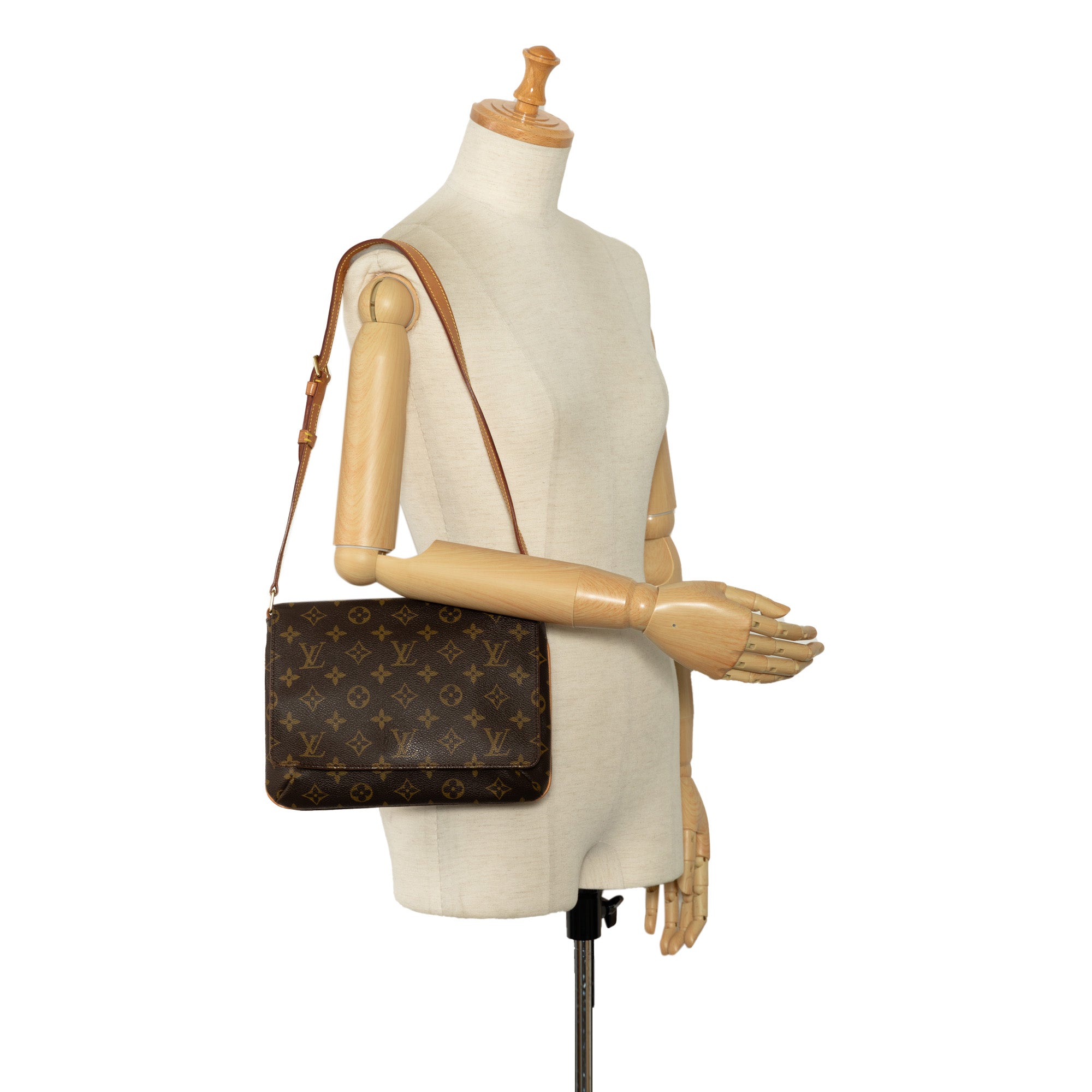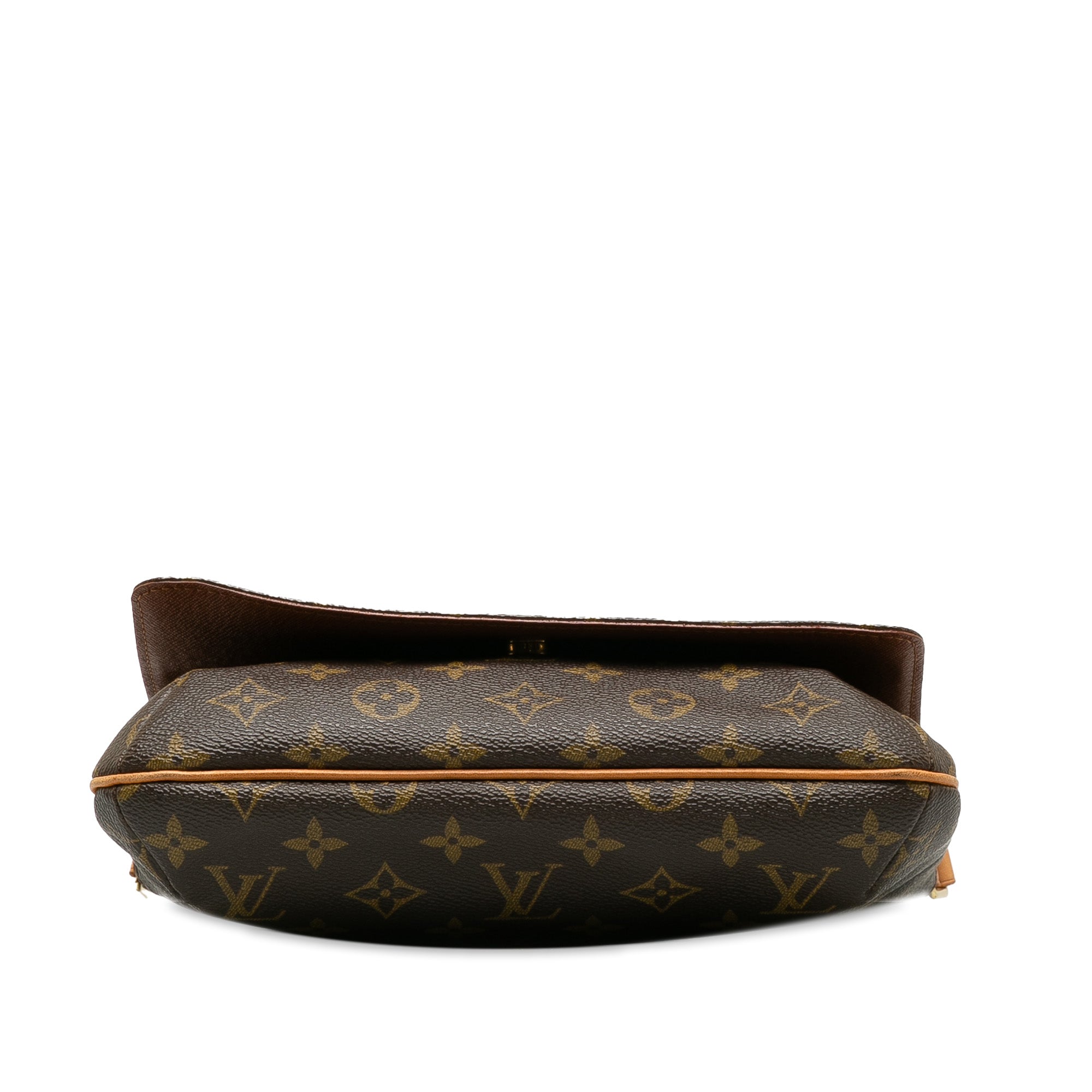 The Musette Tango features a monogram canvas body, a leather shoulder strap, a front flap with a magnetic closure, and an interior slip pocket.