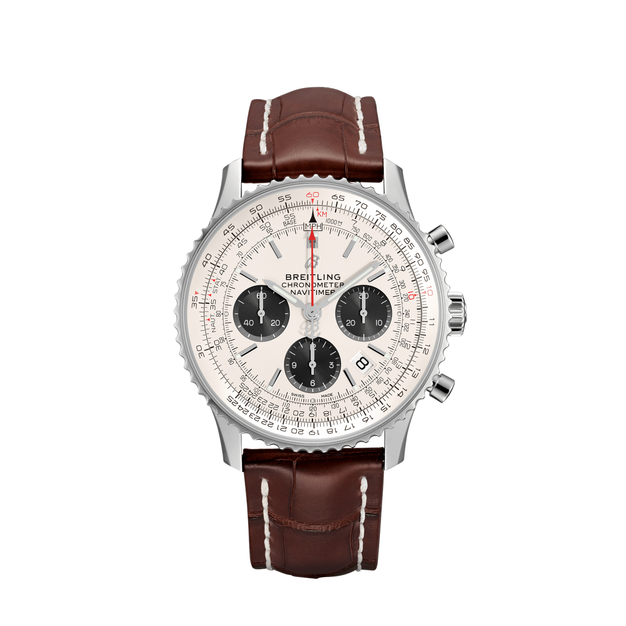 An all-time favorite among pilots and aeronautical enthusiasts since 1952, the Navitimer 1 B01 Chronograph 43 mm combines technical mastery and original design. With Manufacture Breitling Caliber 01, a true emblem of reliability and performance, this legendary model stands out with its steel case, black dial with red seconds hand, silver chronograph counters and applied hour markers. Available in steel, steel & gold, red gold as well as other dial colors, its bidirectional ratcheted rotating bezel ensures smooth and easy handling of the famous circular aviation slide rule.
