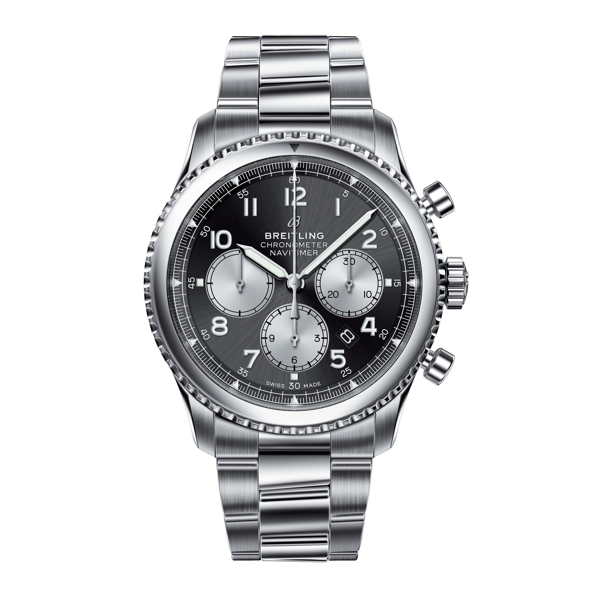 The Navitimer 8 B01 Chronograph 43 is powered by the in-house Breitling Manufacture Caliber 01. The self-winding 43 mm watch has a ratchet-wheel chronograph with vertical coupling and an impressive power reserve of more than 70 hours. The display features 30-minute and 12-hour counters as well as a date window. The highlight of this new range, the Navitimer 8 B01 Chronograph 43, is available in steel with a black or blue dial, or in 18k red gold with a bronze dial, each with the distinctive design elements of contrasting sub-dials. Presented on a steel bracelet or on an alligator leather strap, the COSC-certified chronometer features a transparent sapphire caseback.
