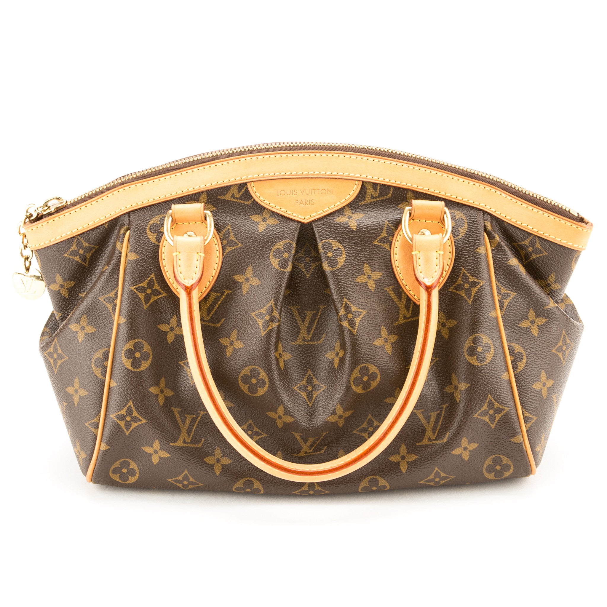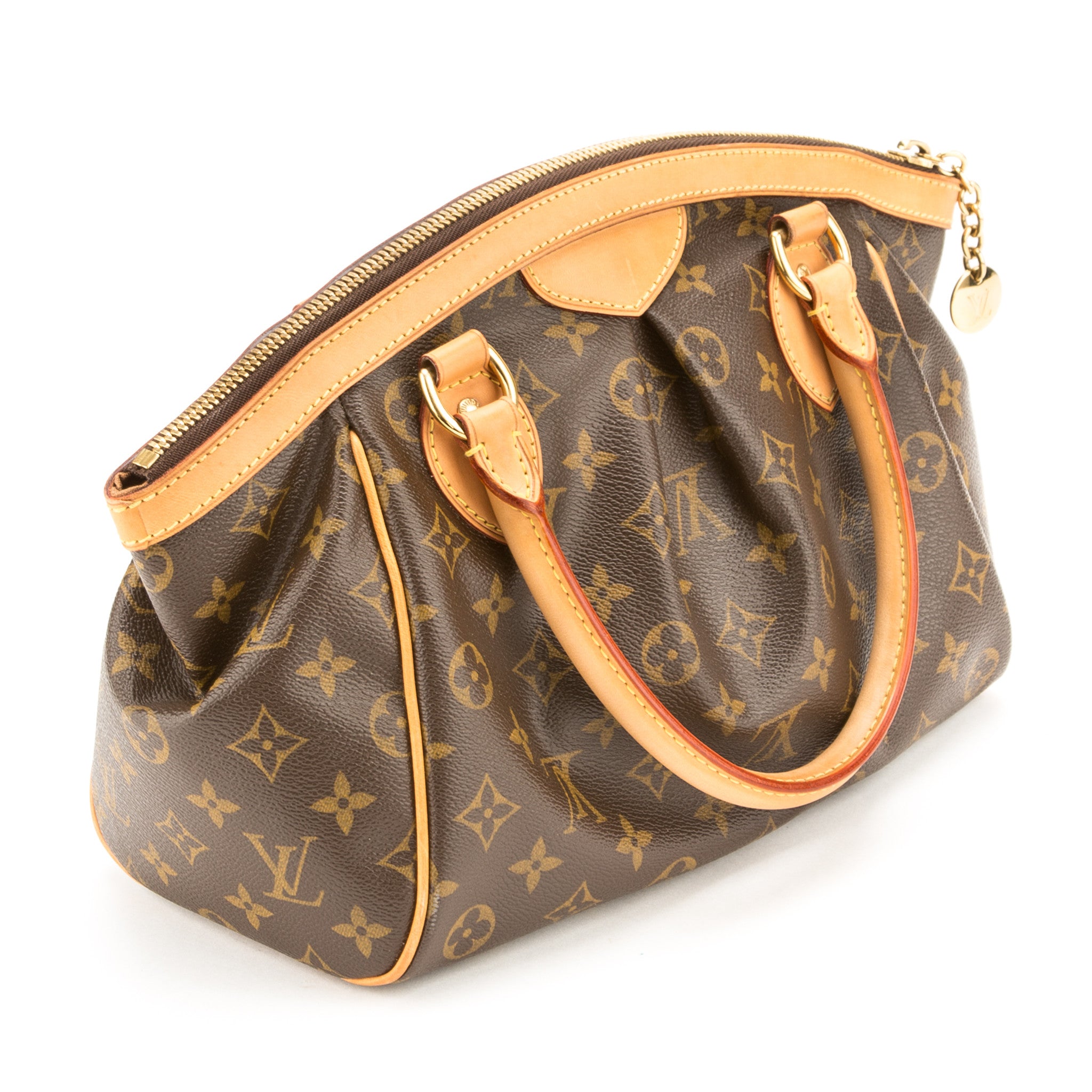 This authentic Louis Vuitton Monogram Canvas Tivoli PM Bag is stunning. The Tivoli is named after famous the city Tivoli, Italy. It features gold tone hardware a subtle pleating, a frame top and a gold zipper LV pull.