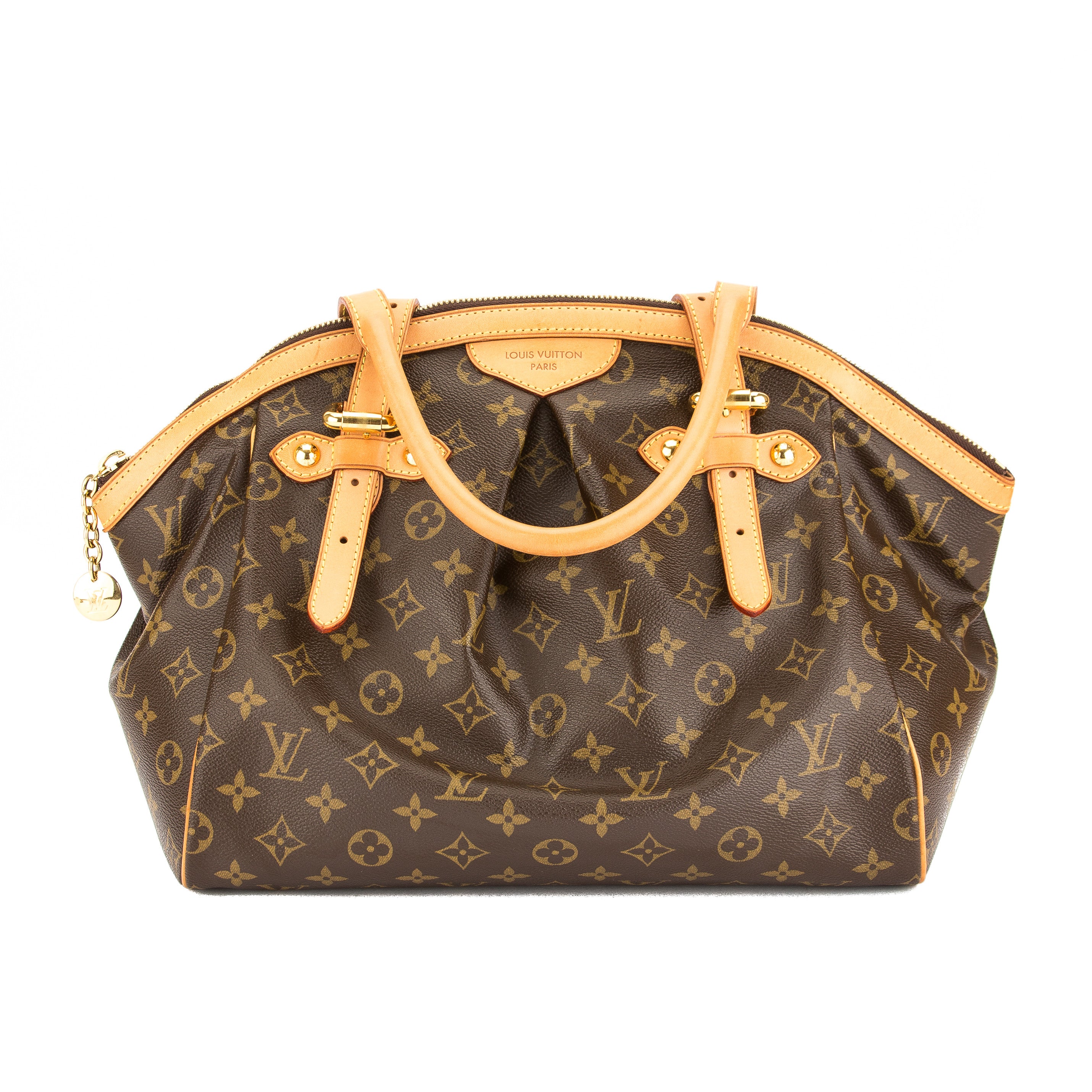 This is an authentic LOUIS VUITTON Tivoli GM Bag. It’s named after the beautiful city of Tivoli, Italy, which garners many tourists. It’s crafted with the iconic Monogram canvas with a pleated front detail, a natural cowhide leather trim, and adjustable top handles for use as a tote or shoulder bag. It has golden brass hardware, including five studs on the base for support, which enhances it features. It has a zip closure with an LV medallion charm and opens to expose a brown textile-lined interior with three open pockets. This is the largest Tivoli so there’s plenty of space for all your essentials. This is a charming bag for every day by Louis Vuitton!