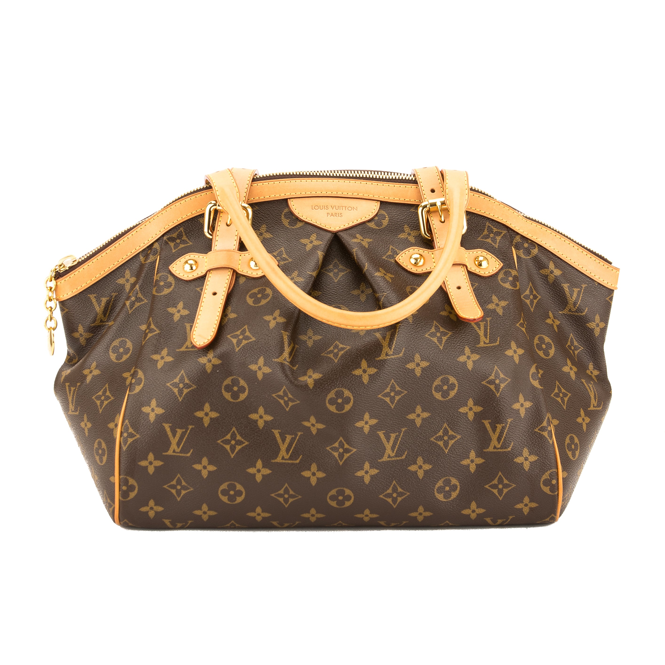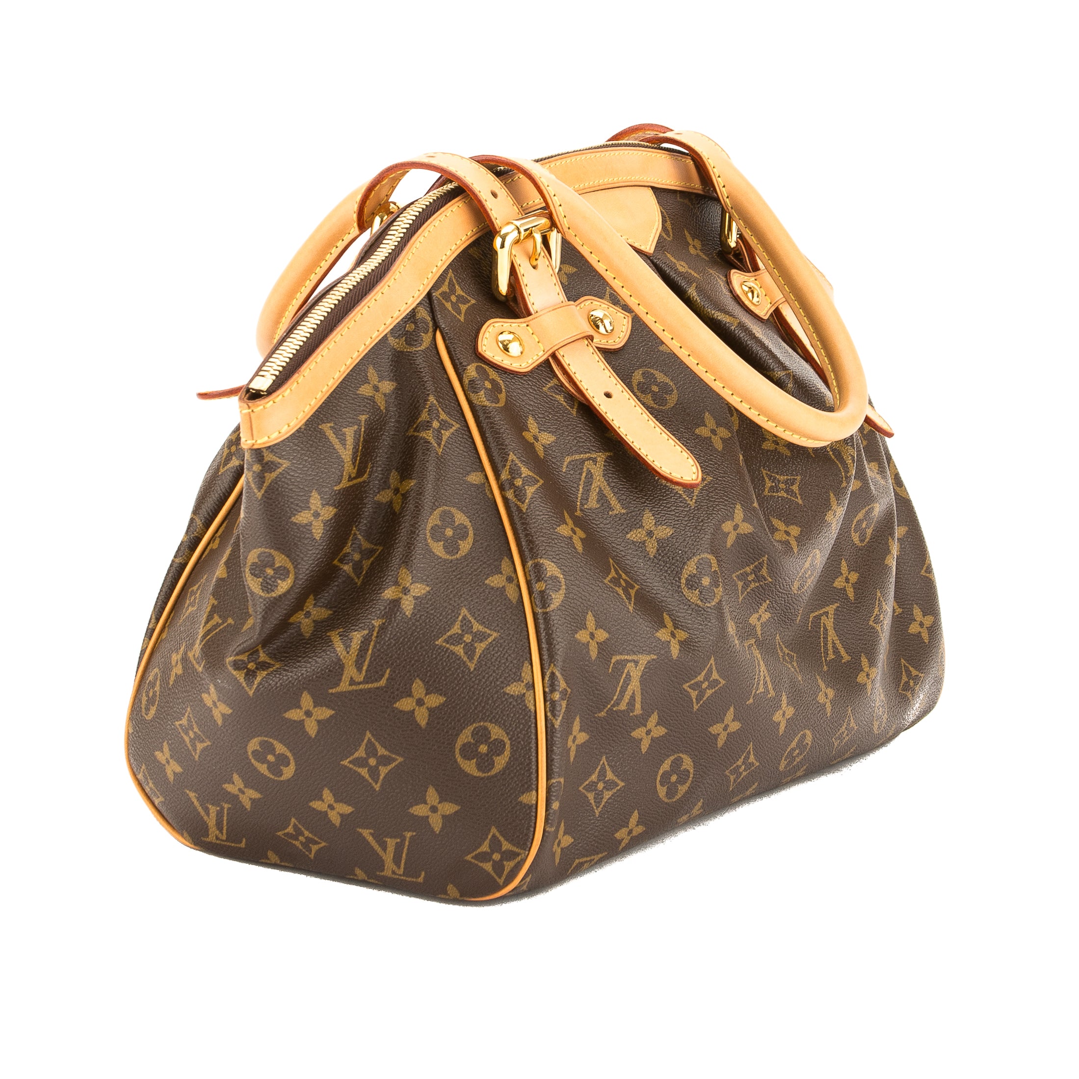 This is an authentic LOUIS VUITTON Tivoli GM Bag. It’s named after the beautiful city of Tivoli, Italy, which garners many tourists. It’s crafted with the iconic Monogram canvas with a pleated front detail, a natural cowhide leather trim, and adjustable top handles to carry as a tote or shoulder bag. It has golden brass hardware with five studs on the base for support. It has a zip closure with an LV medallion charm and an interior with a brown textile lining, a d-ring, and three open pockets. This is the largest Tivoli so there’s plenty of space for your daily essentials. This is a charming bag for every day by Louis Vuitton!