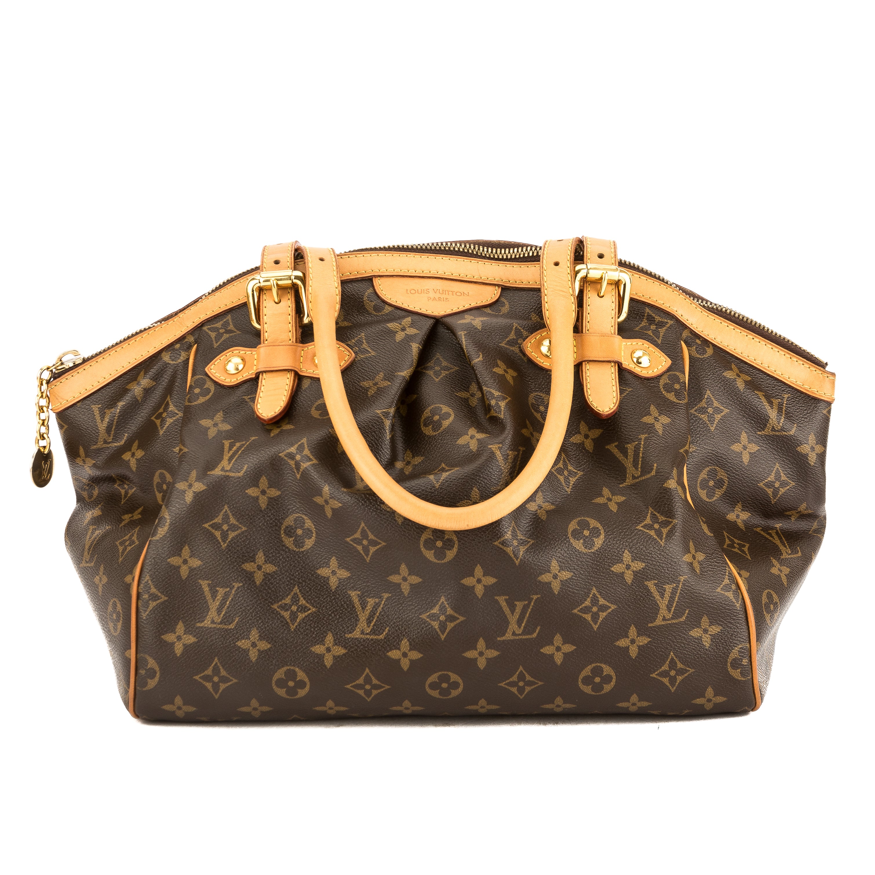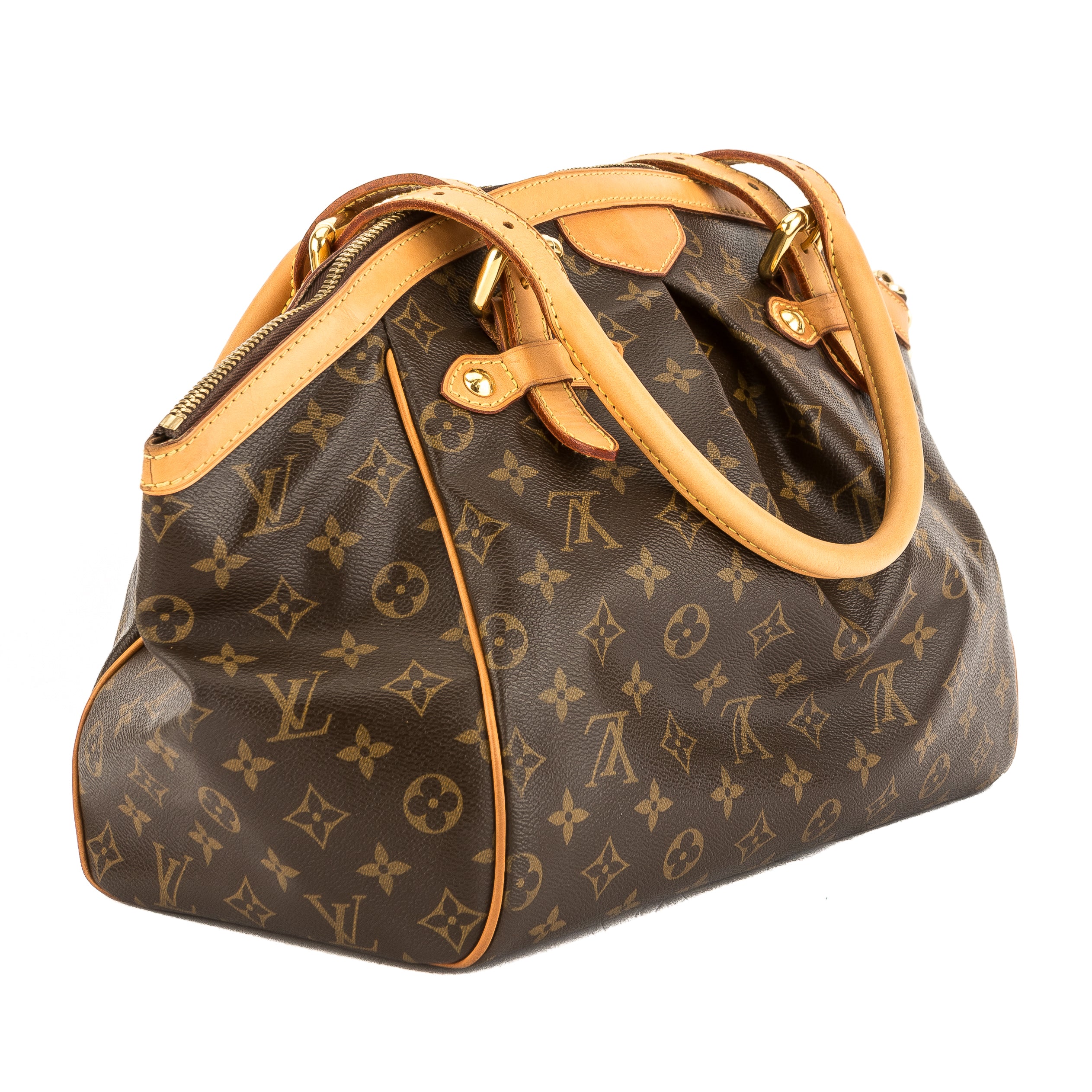This is an authentic, pre-owned LOUIS VUITTON Tivoli GM Bag. It’s named after the beautiful city of Tivoli, Italy, which garners many tourists. It’s crafted with the iconic Monogram canvas with a pleated front detail, a natural cowhide leather trim, and adjustable top handles to carry as a tote or shoulder bag. It has golden brass hardware with five studs on the base for support. It has a zip closure with an LV medallion charm and an interior with a brown textile lining, a d-ring, two flat pockets, and a cellphone pocket. This is the largest Tivoli so there’s plenty of space for your daily essentials. This item is in good condition, may show minor signs of wear. See photos for details.