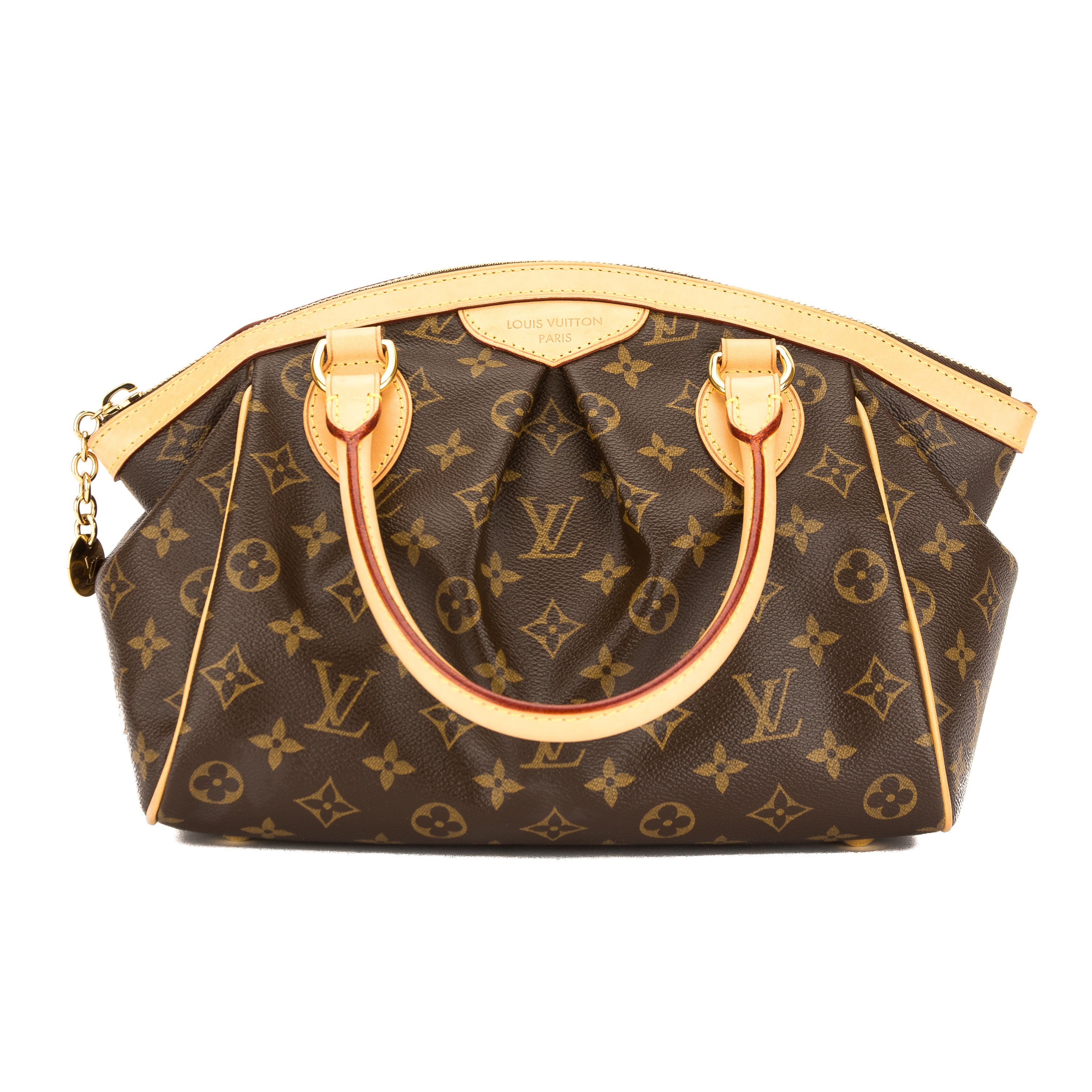 This is an authentic LOUIS VUITTON Tivoli PM Bag. It’s named after the beautiful city of Tivoli, Italy, which garners many tourists. It’s crafted in the iconic Monogram canvas with a pleated front detail, a natural cowhide leather trim, and rolled top handles. It has shiny golden metallic hardware, including five studs on the base for support, which enhances it features. It has a zip top closure with an LV medallion charm and opens to expose a rich brown textile lining, a flat pocket, and a cellphone pocket. This is the petite Tivoli but it has plenty of space for your necessities. This is a charming handbag for every day by Louis Vuitton!