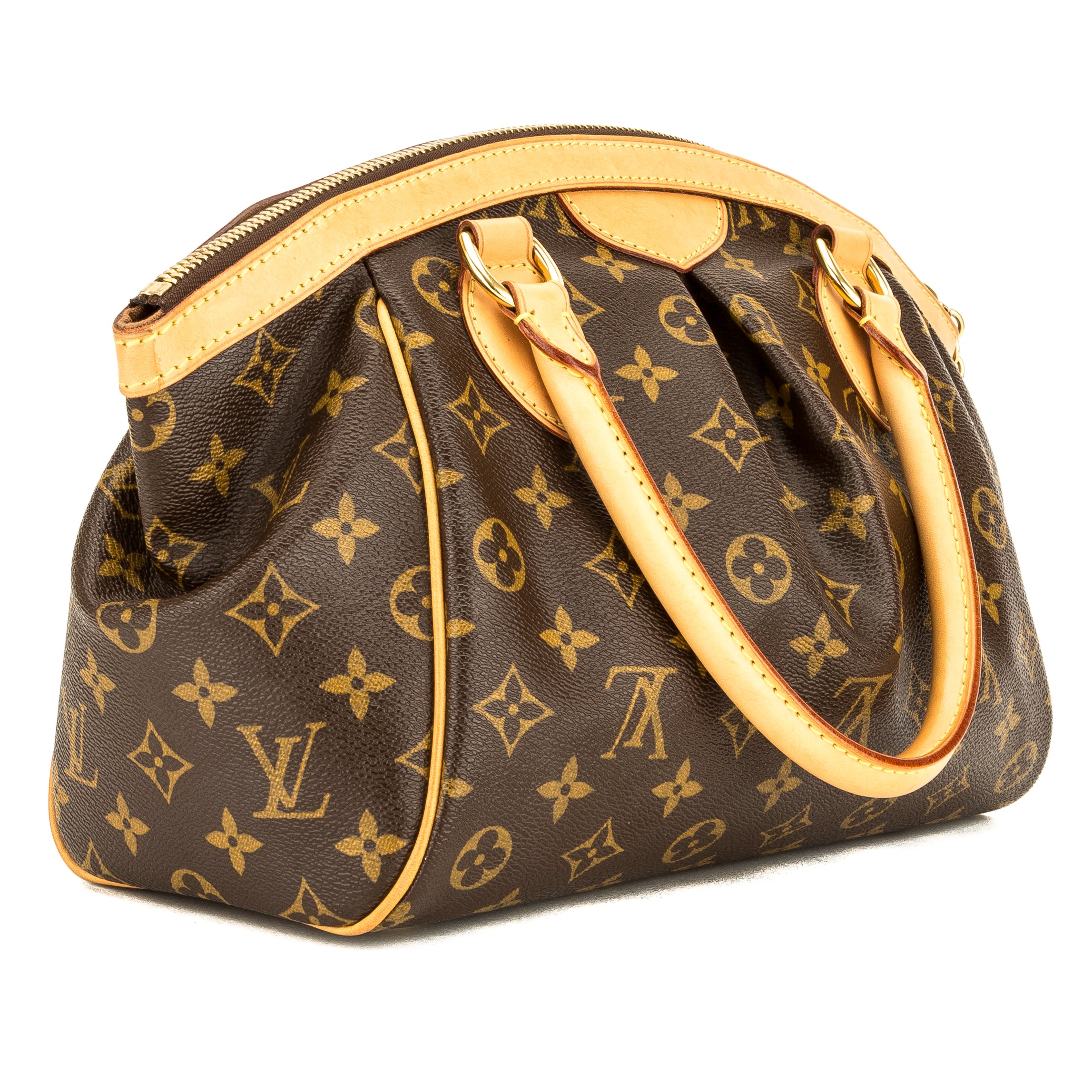 This is an authentic, pre-owned LOUIS VUITTON Tivoli PM Bag. It’s named after the beautiful city of Tivoli, Italy, which garners many tourists. It features the iconic Monogram canvas with a pleated front detail, a natural cowhide leather trim, and rolled top handles. It has golden brass hardware, including five studs on the base for support. It has a zip closure with an LV medallion charm and opens to expose a rich brown textile lining, a flat pocket, and a cellphone pocket. This is the petite Tivoli but it has plenty of space for your necessities. This is a charming bag for every day by Louis Vuitton! This item is in good condition, may show moderate signs of use. See photos for details. Pay close attention to sizes and measurements.