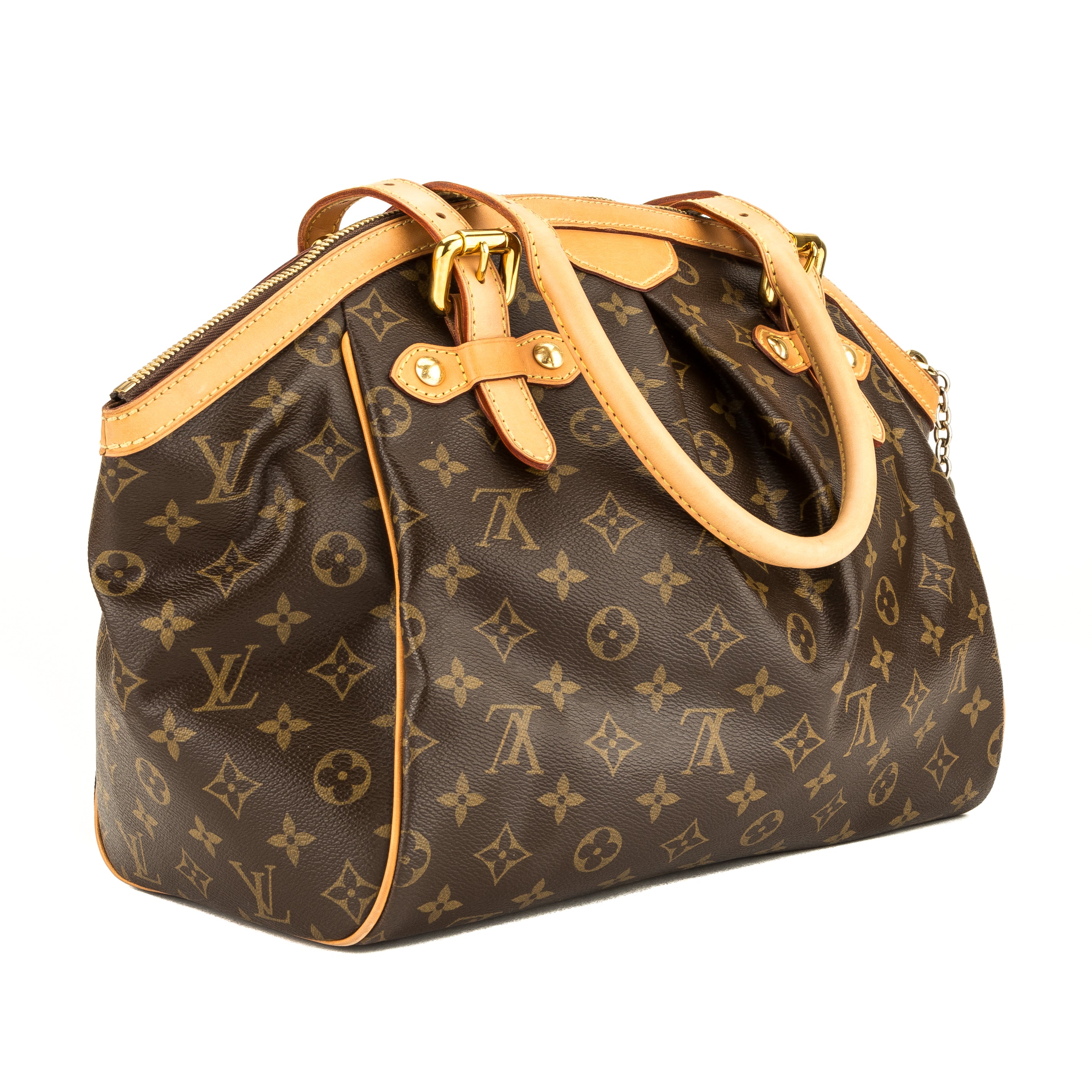 This is an authentic, pre-owned LOUIS VUITTON Tivoli GM Bag. It’s named after the city of Tivoli, Italy. It’s crafted in the iconic Monogram canvas with a pleated front detail, a natural cowhide leather trim, and adjustable top handles to carry as a tote or shoulder bag. It has golden brass hardware with five studs on the base for support. It has a zip closure with an LV medallion charm and an interior with a brown textile lining, a d-ring, two flat pockets, and a cellphone pocket. This is the largest Tivoli so there’s plenty of space for your daily essentials.